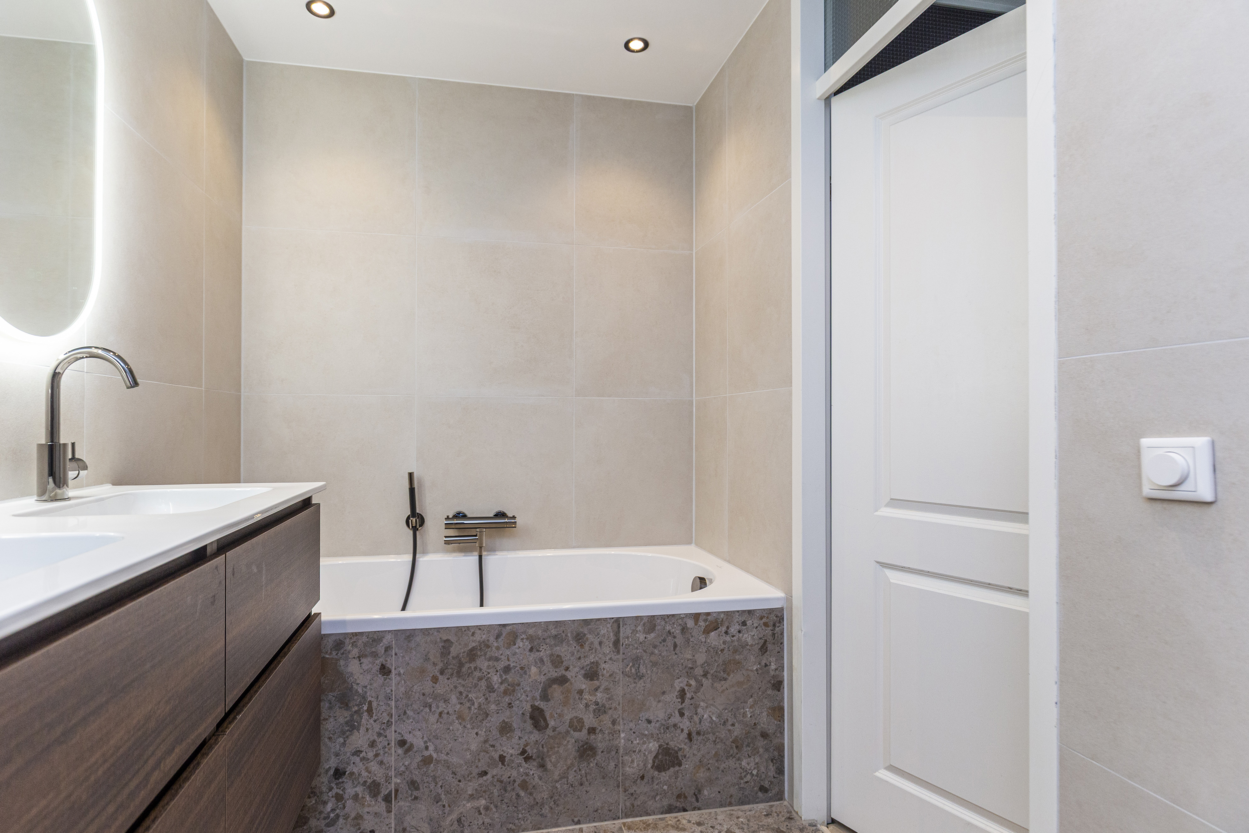 De badkamer en het toilet beneden zijn recent volledig vernieuwd (2024) en uitgevoerd met hoogwaardige materialen, zoals Hotbath kranen en Villeroy & Boch tegels, wat zorgt voor een luxe en moderne uitstraling.