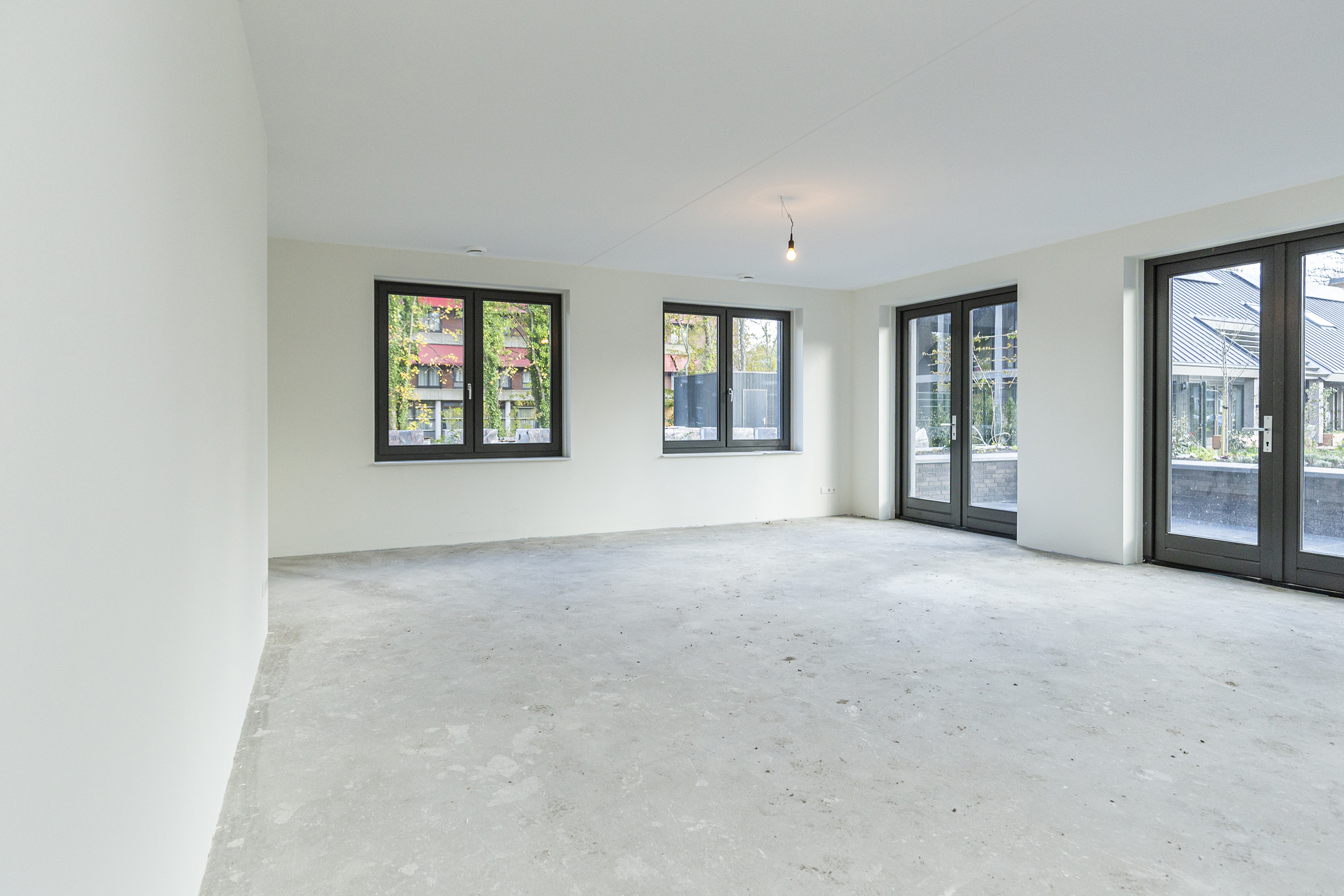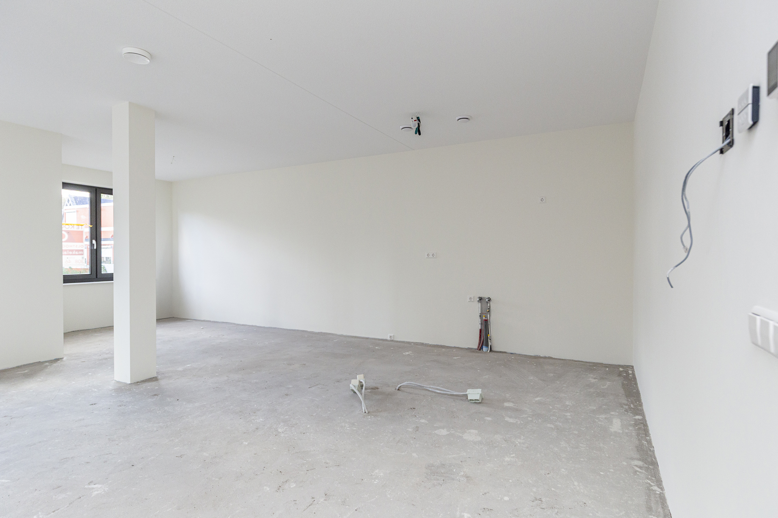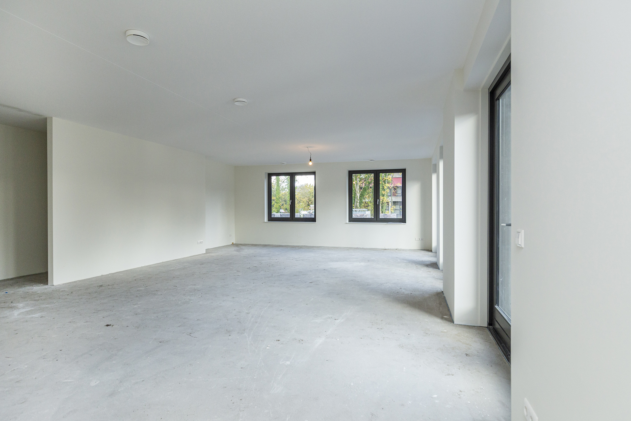 In the hall is the toilet, equipped with a neutral color tiling. Then in the hall is a closet with the connection for the washer and dryer and in the adjacent separate room the is the technical room. Through 2 French doors you walk into the more than spacious living room, equipped with an open kitchen. As long as the construction permits, it is still possible to choose your own color for this kitchen. The kitchen has a cooking island and everything is from Siematic.