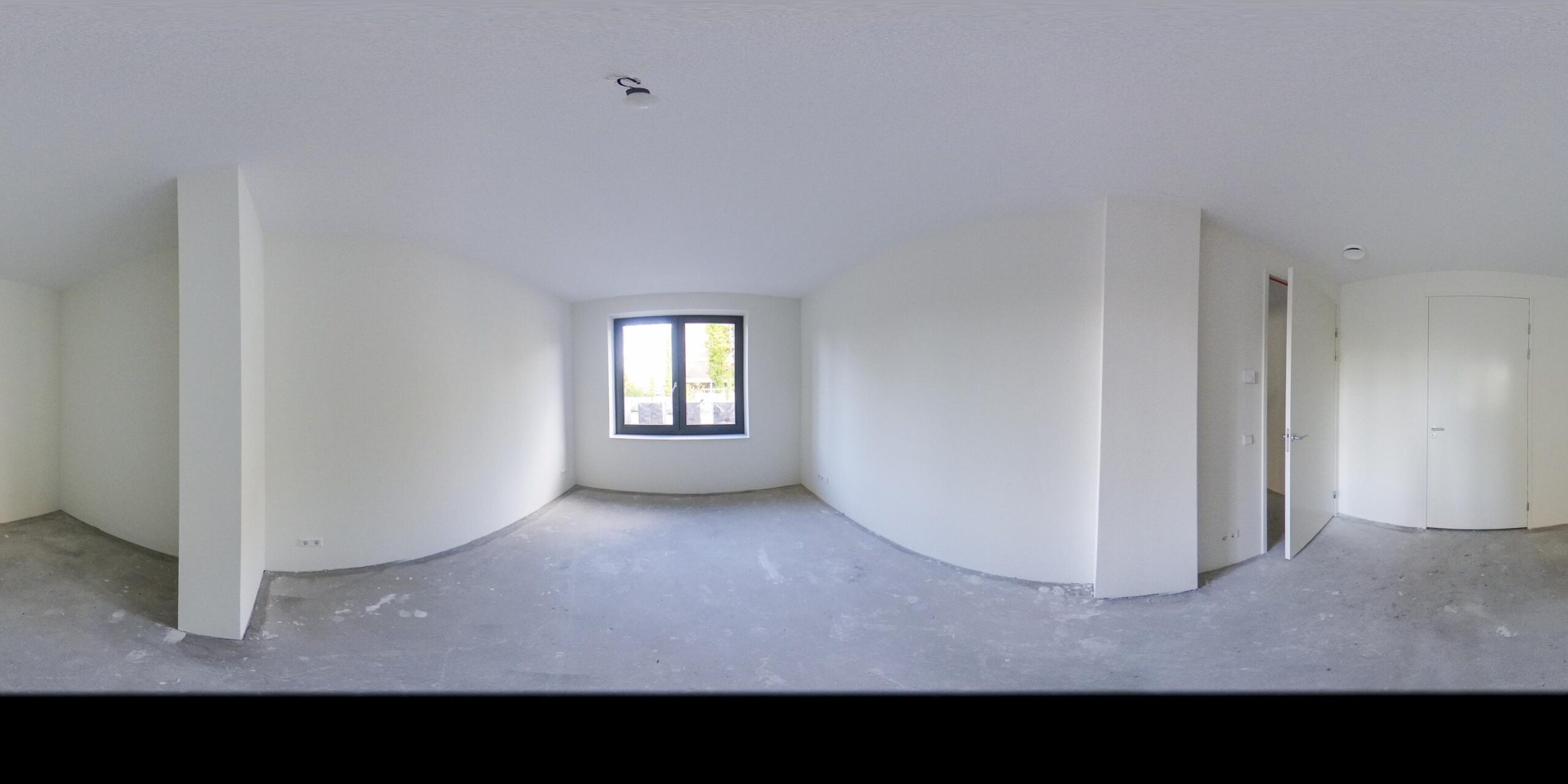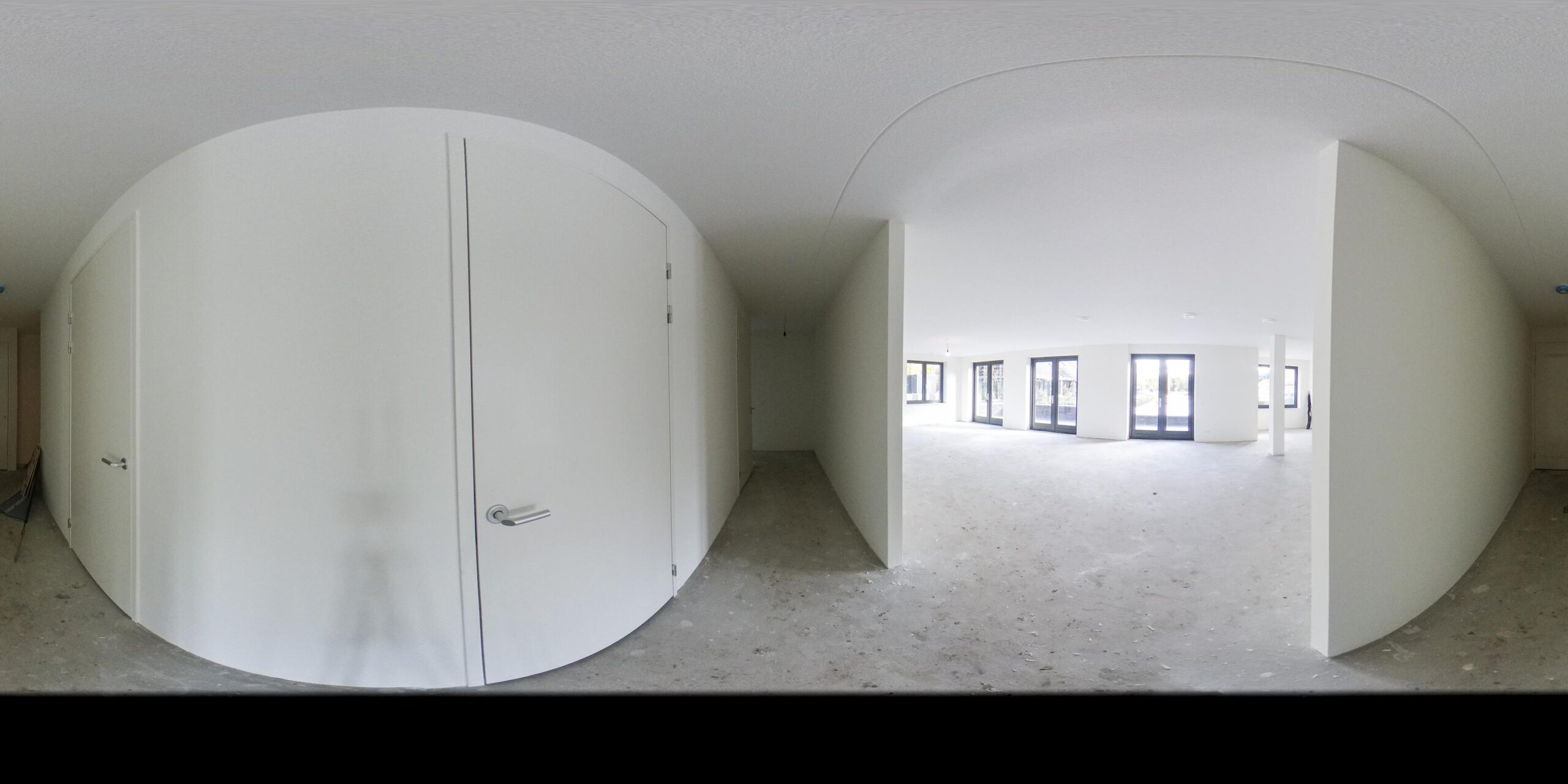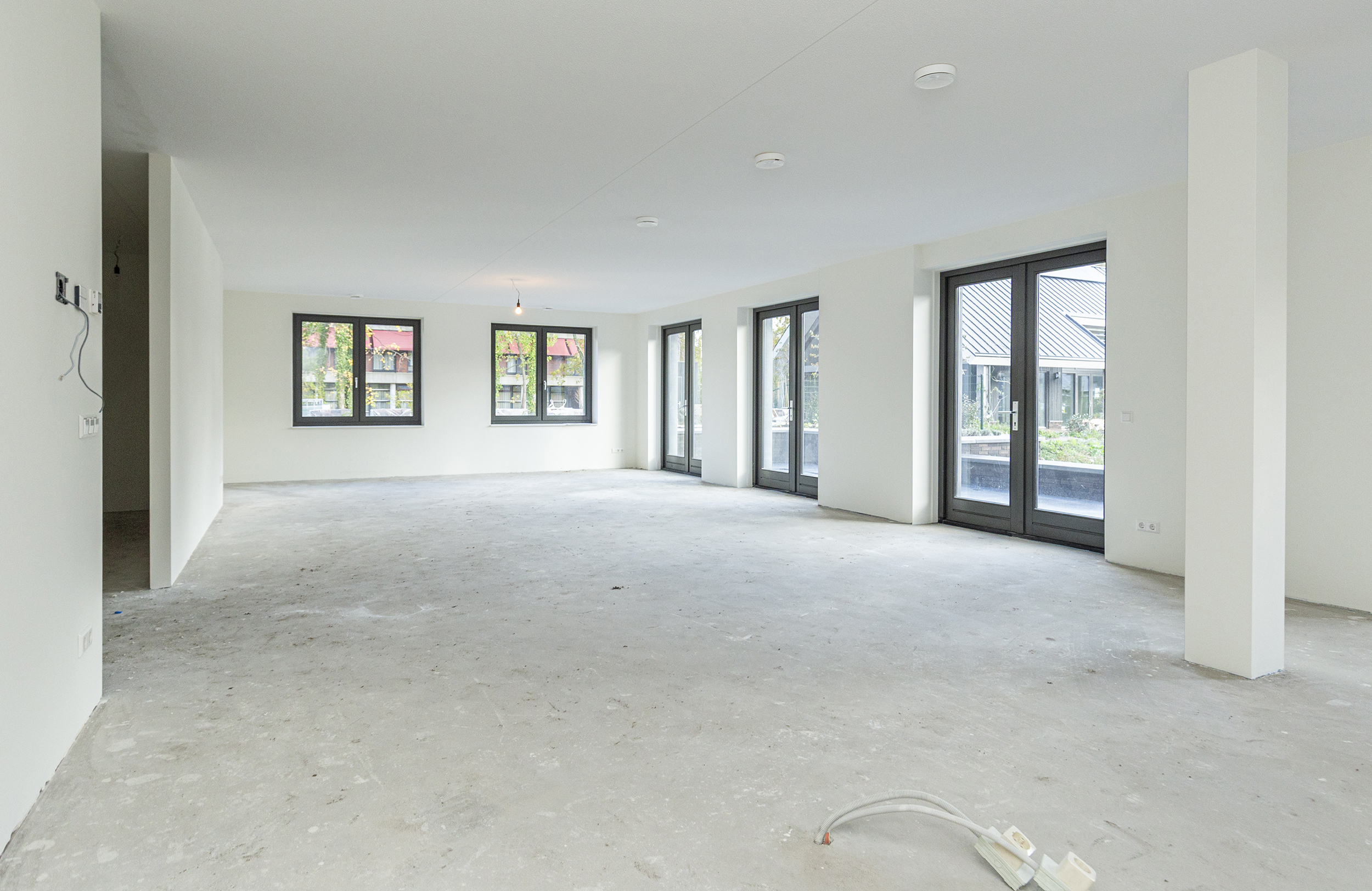 In the hall is the toilet, equipped with a neutral color tiling. Then in the hall is a closet with the connection for the washer and dryer and in the adjacent separate room the is the technical room. Through 2 French doors you walk into the more than spacious living room, equipped with an open kitchen. As long as the construction permits, it is still possible to choose your own color for this kitchen. The kitchen has a cooking island and everything is from Siematic.