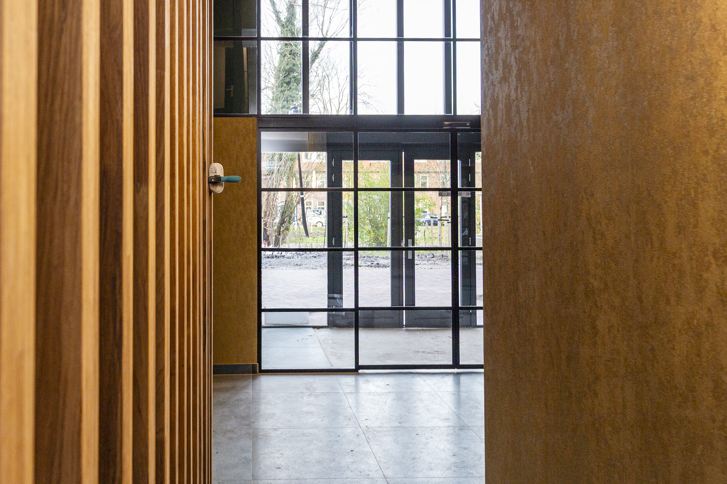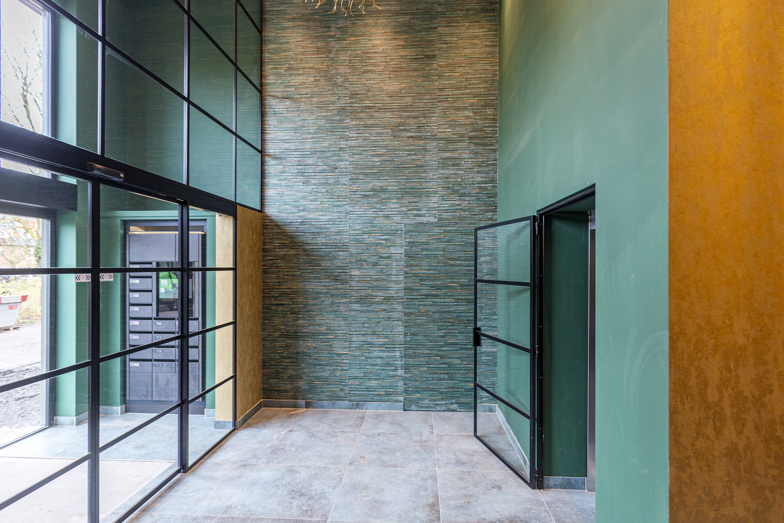 Via de royale entree die met zijn extra hoogte een luxe uitstraling heeft, komt u na de tussendeur in de hal waar zich de entreedeuren naar de 2 appartementen op de begane grond bevinden.