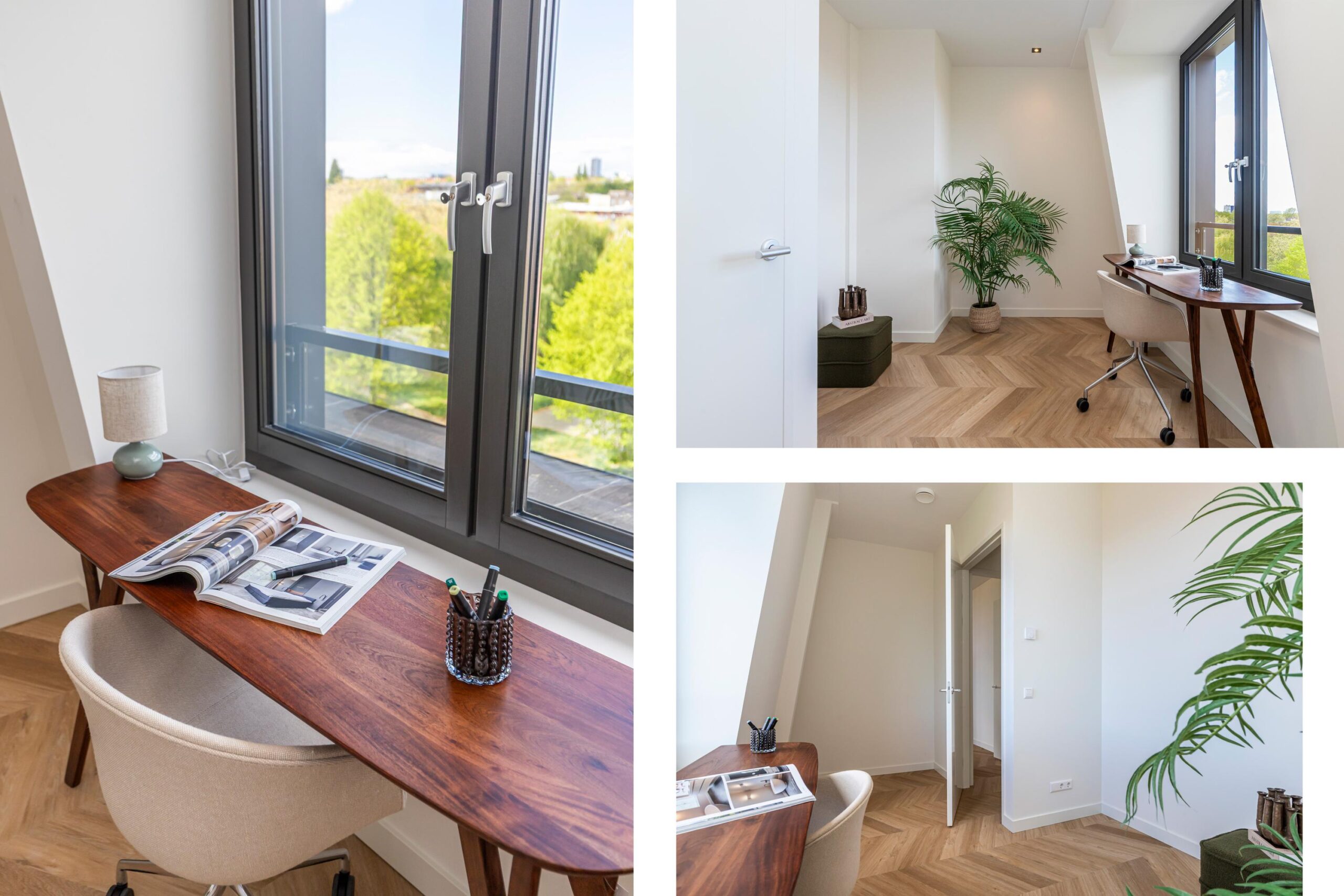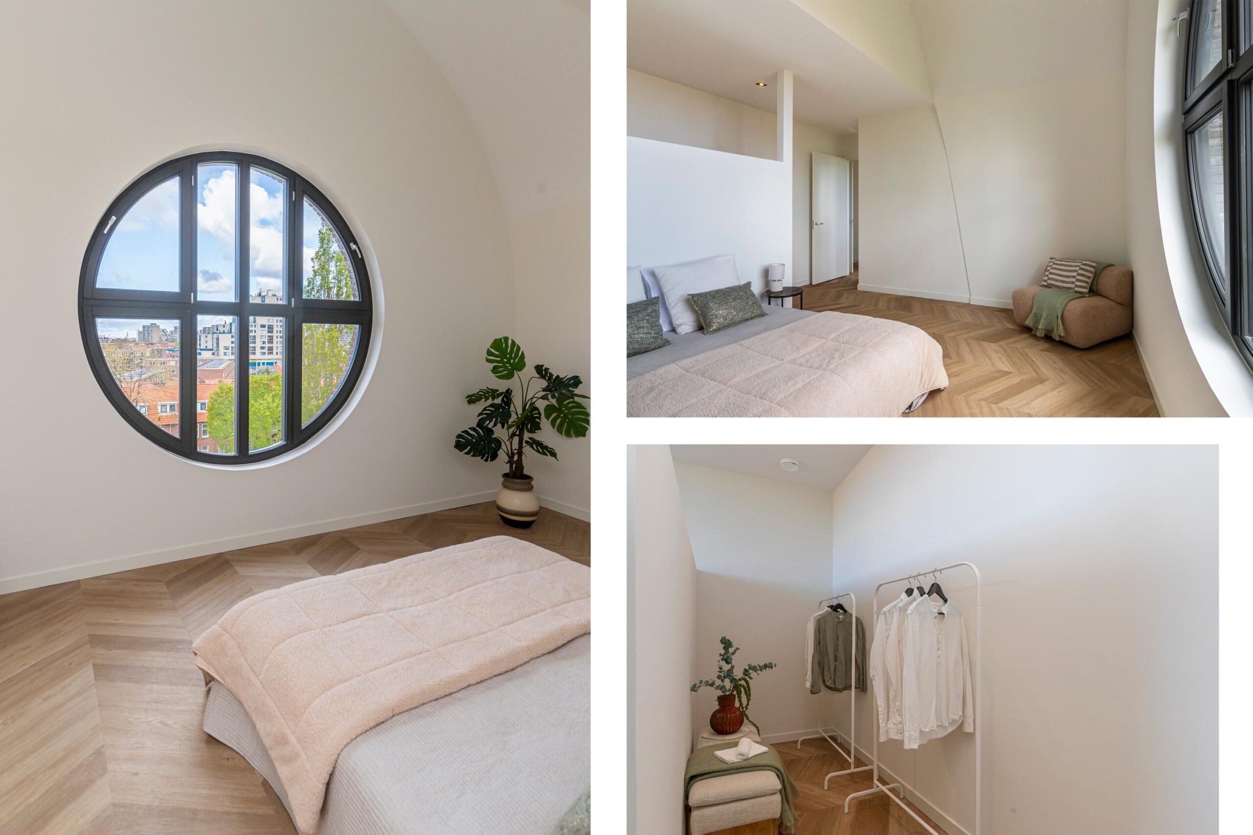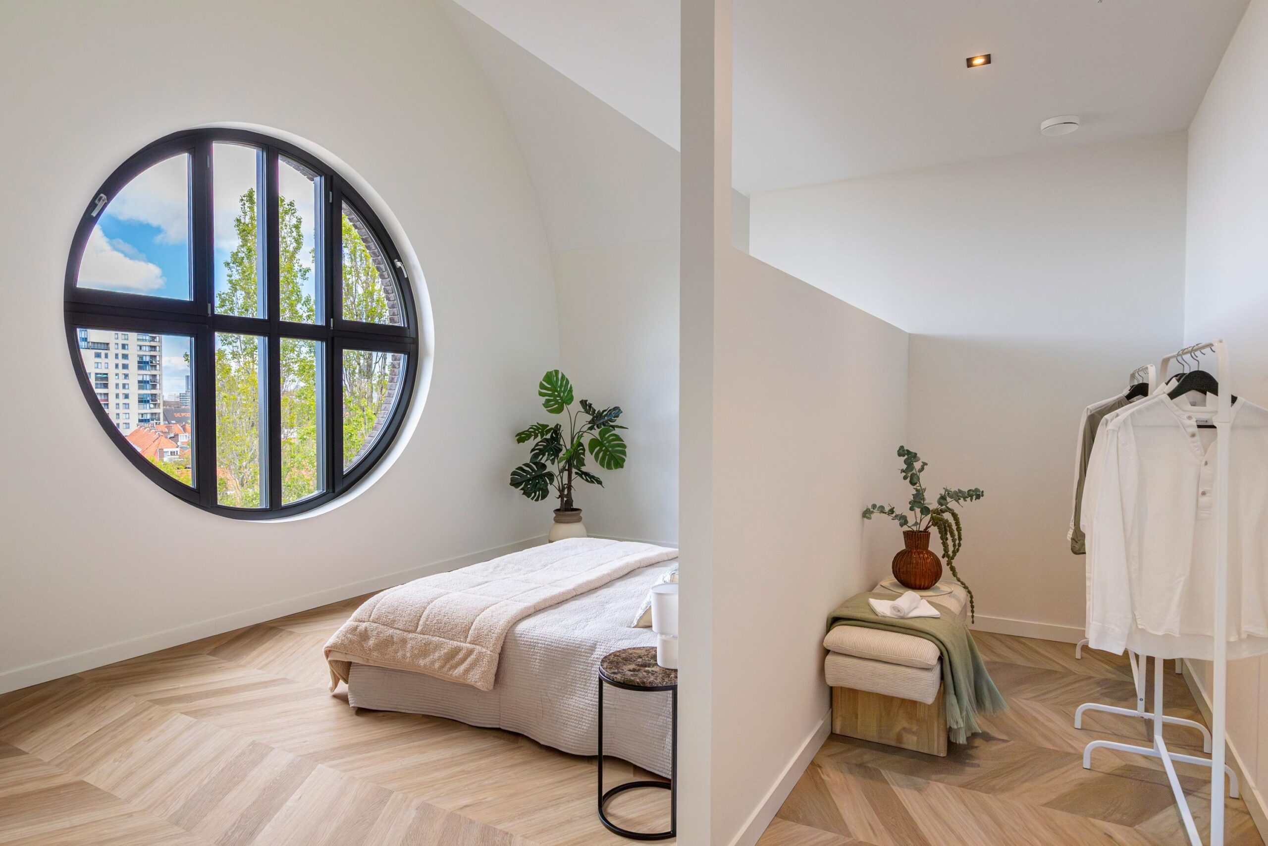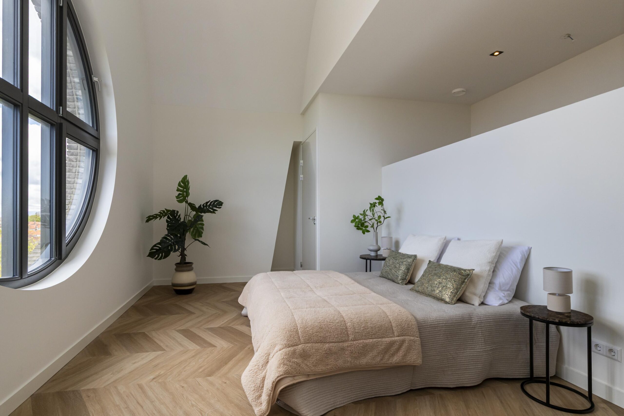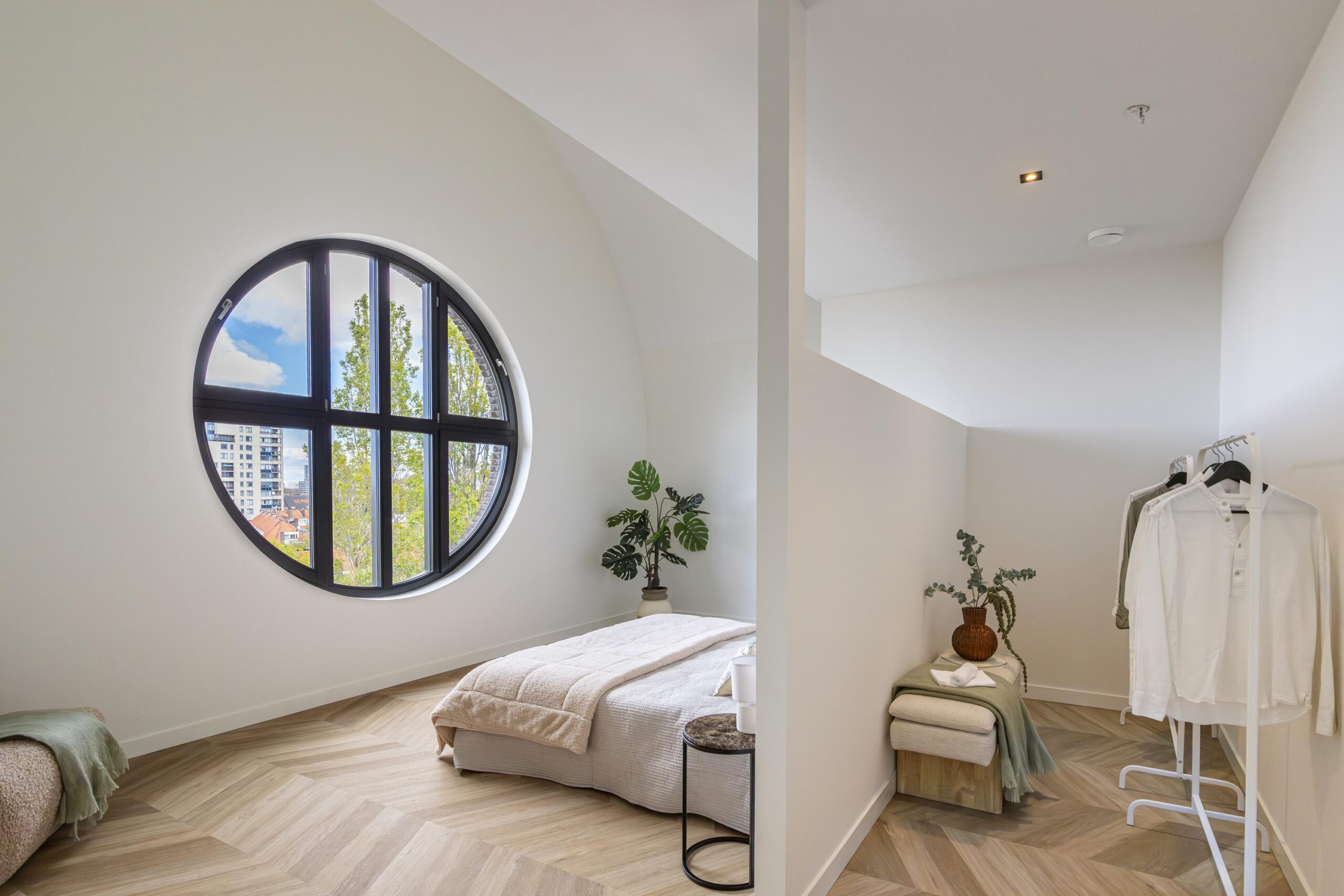 The three bedrooms are accessible via a separate hallway. The master bedroom is approximately 25m² and has a walk-in closet. The round windows in this room are truly unique! The bathroom adjacent to this bedroom has a walk-in shower and sink with beautiful tiling and sanitary ware.