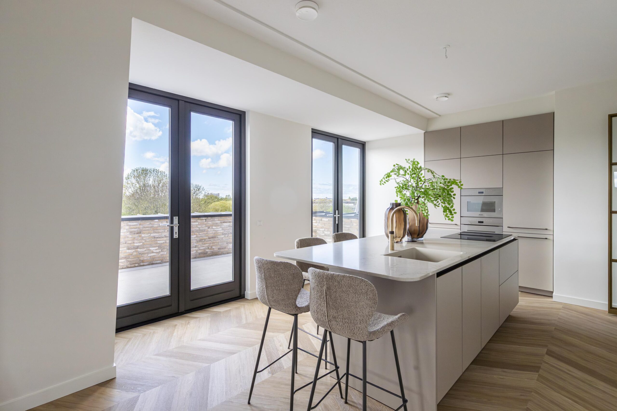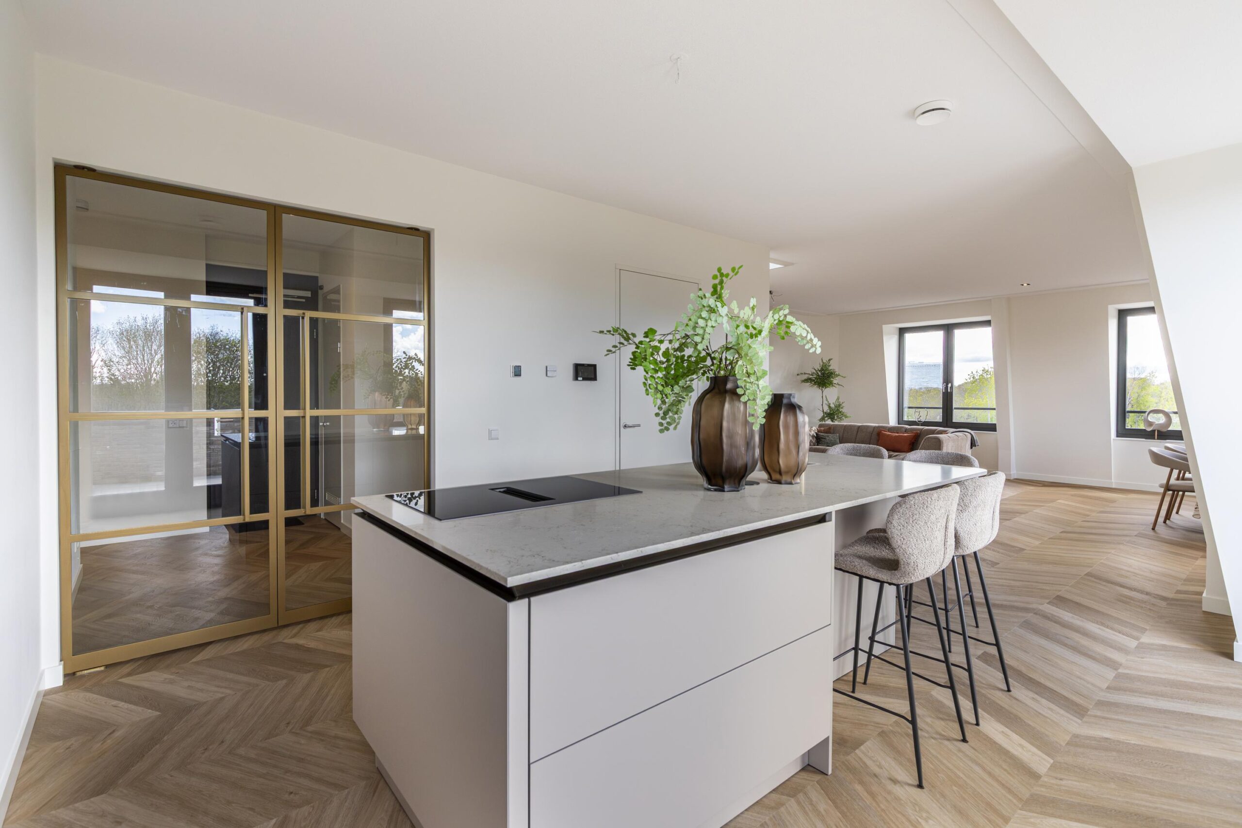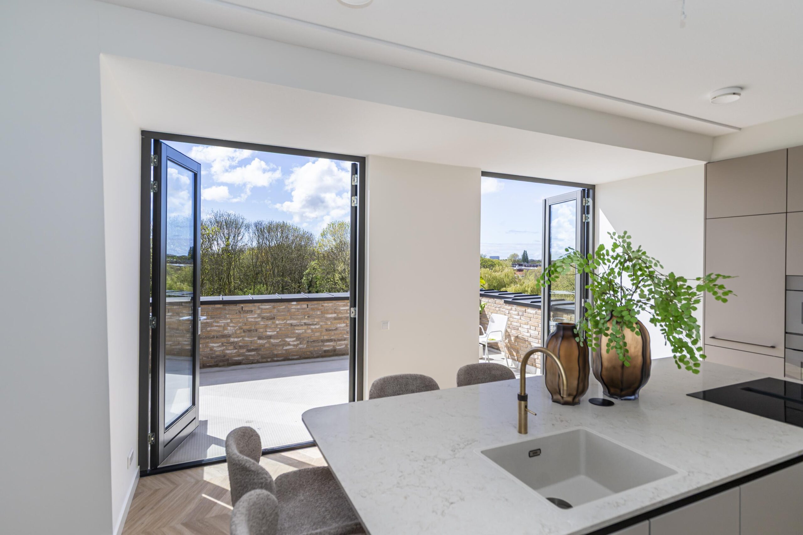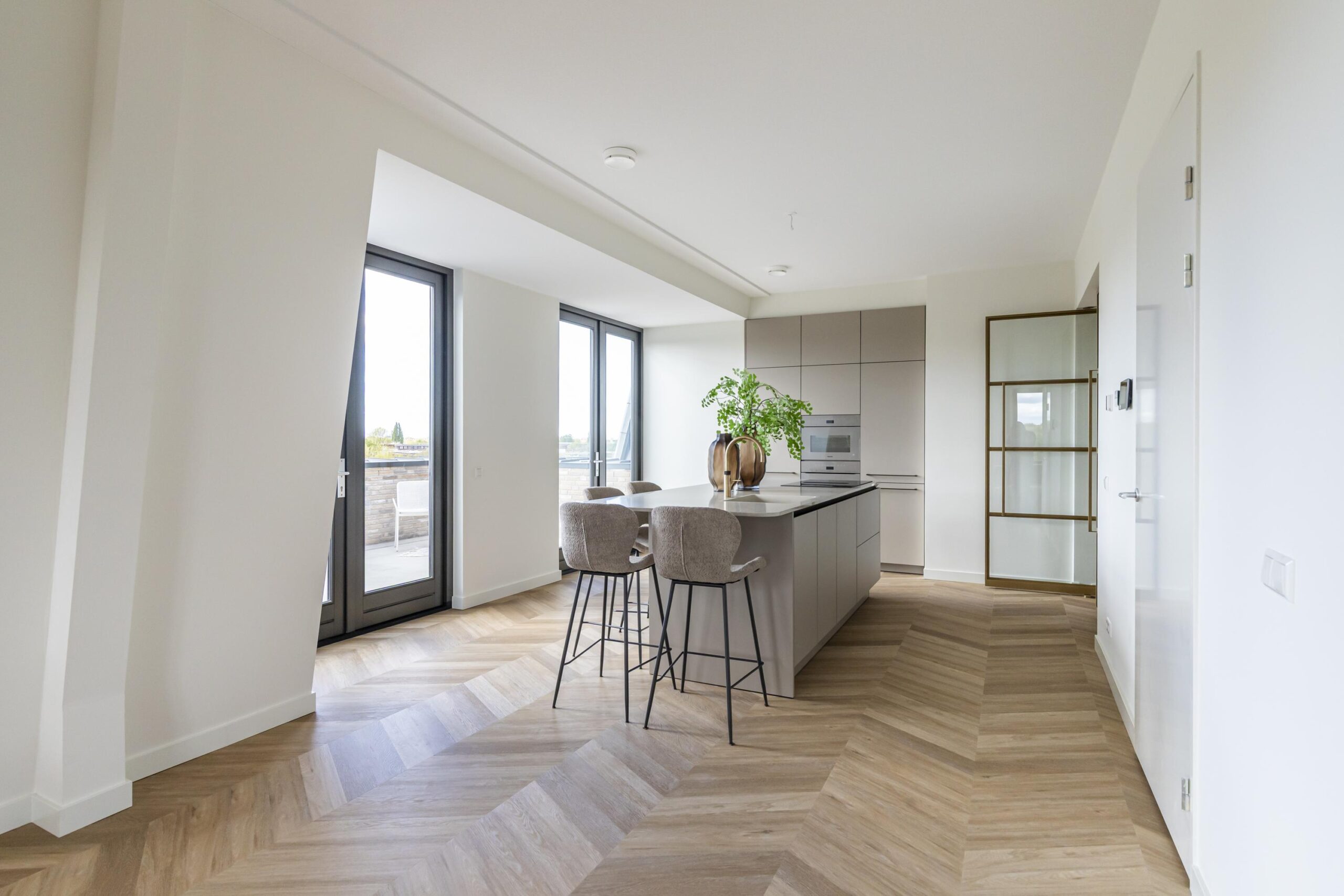 The elevator takes you to the front door, which opens onto a spacious hall with access to the toilet and meter cupboard. French doors lead to the living room/kitchen (approx. 66 m² in total) with a unique and spacious terrace, which is also accessible via two French doors. This west-facing terrace offers sweeping views of the surrounding greenery.