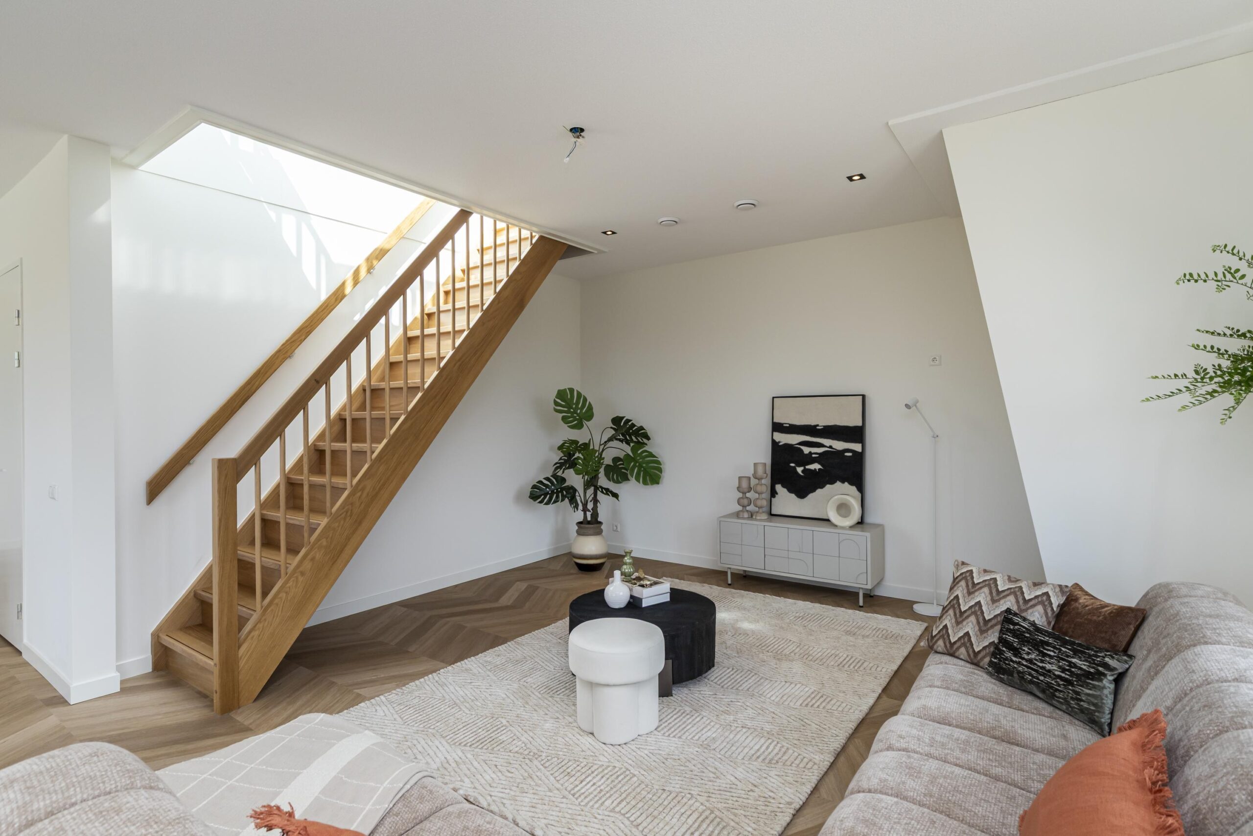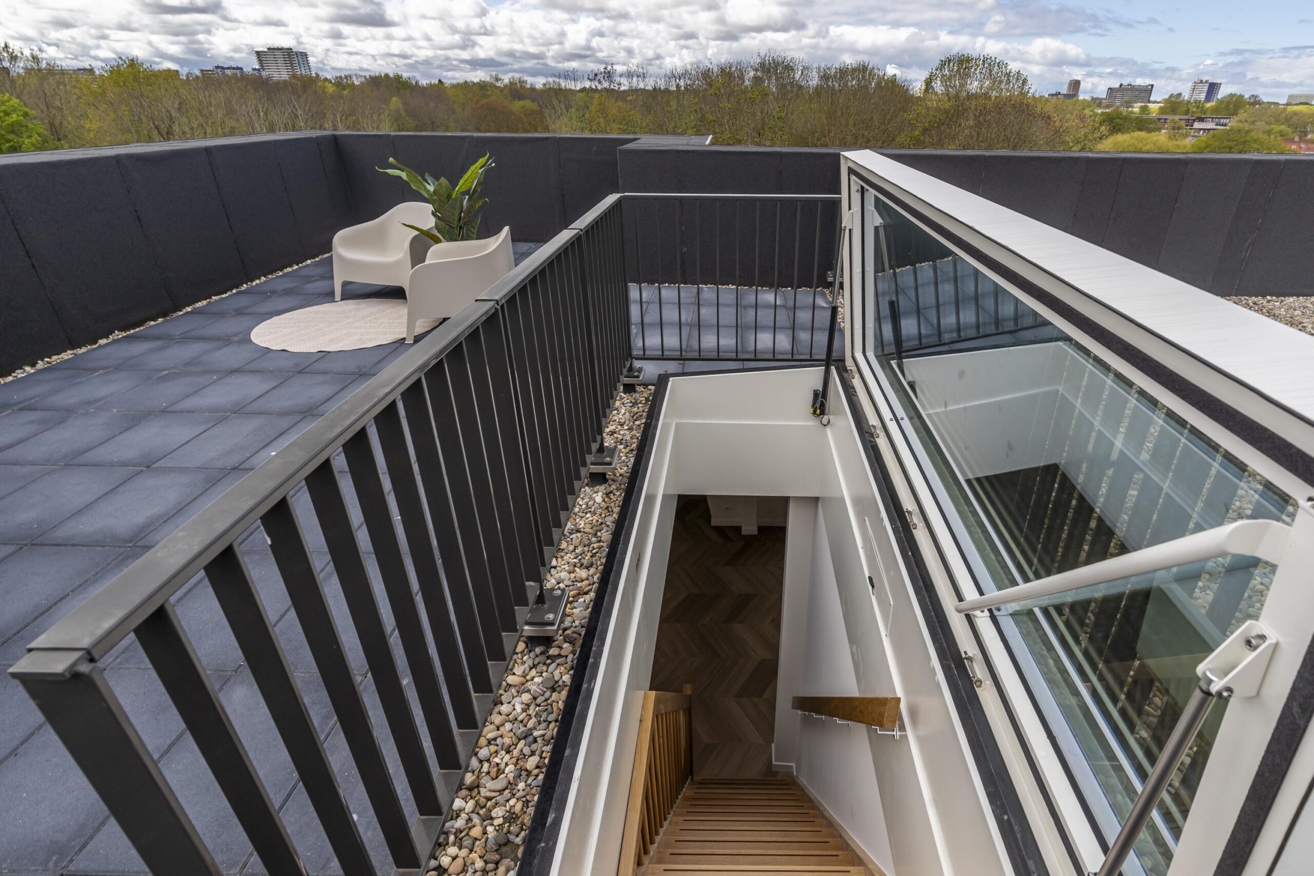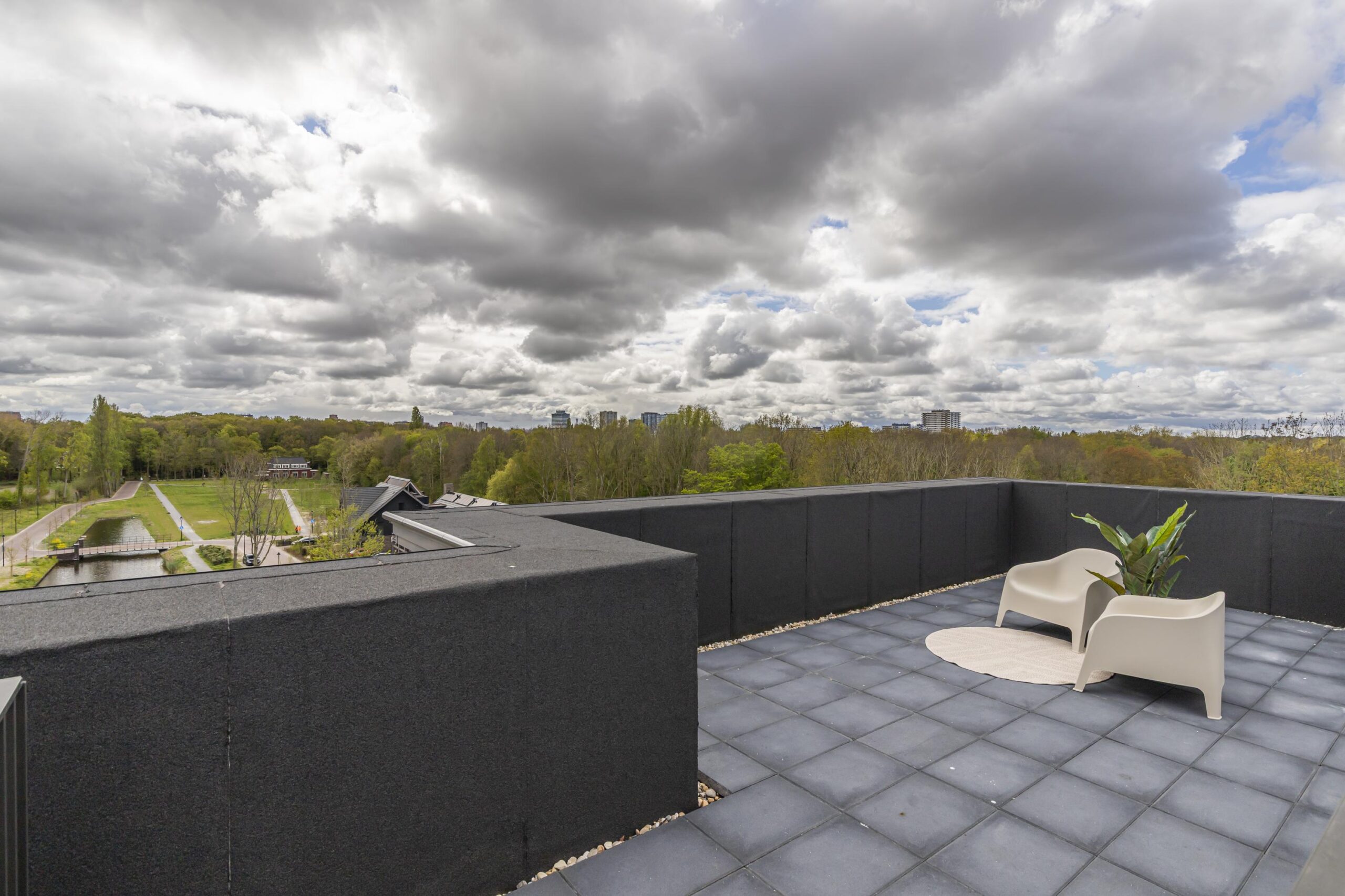 In de woonkamer is een trap aangebracht die via een dakluik toegang geeft tot het dakterras van ruim 36m² met uitzicht over het vele groen in de omgeving en de fraaie waterpartij aan de voorzijde.