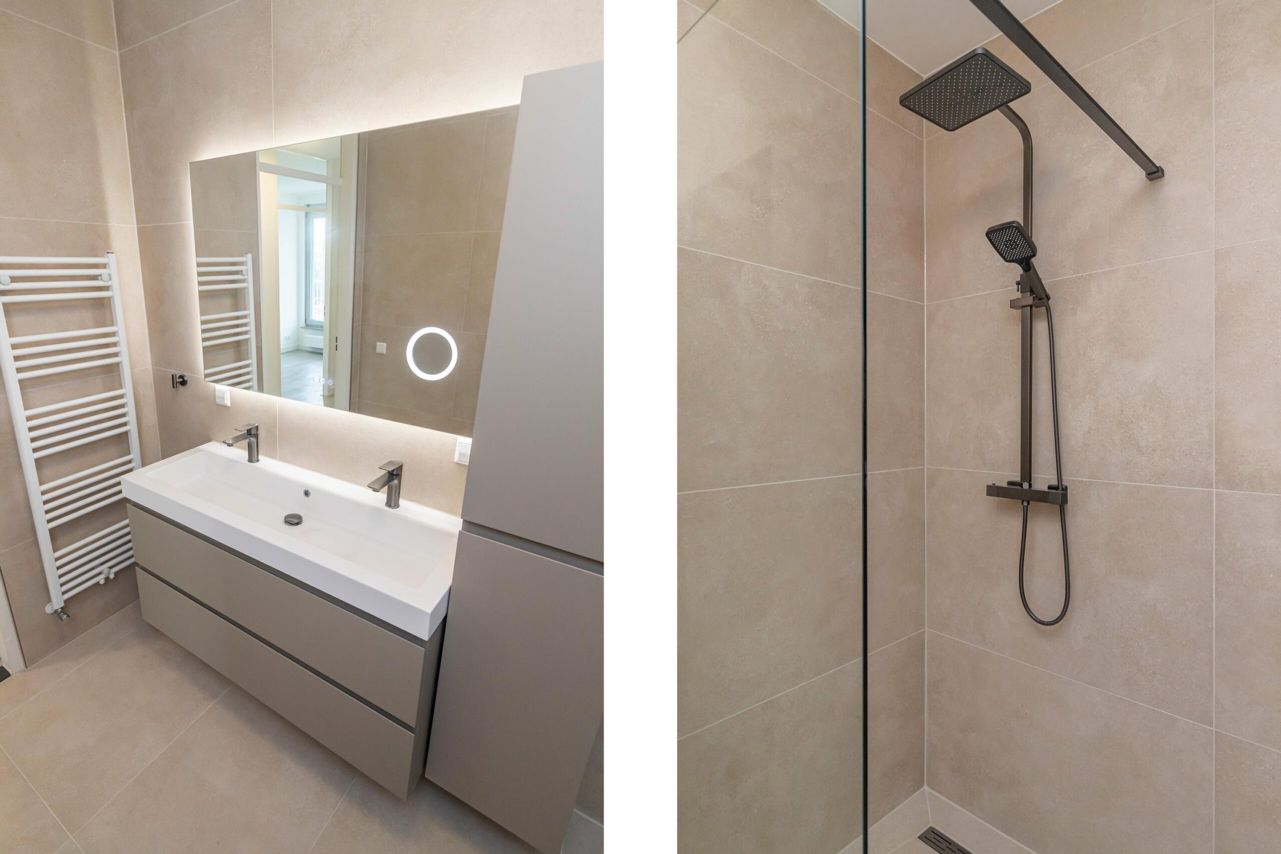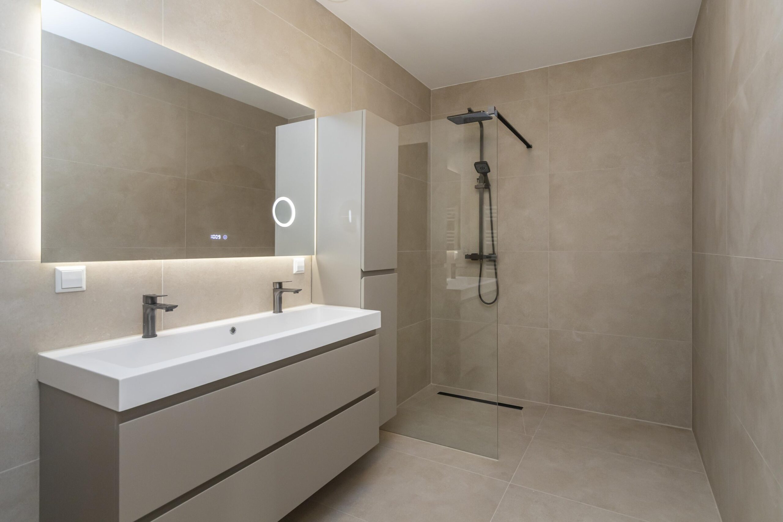 De badkamer (2025) is modern en tijdloos afgewerkt met crèmekleurige, beige tegels. Hier vind je een dubbele wastafel met brede lades, een verlichte spiegel, een hoge opbergkast en een ruime inloopdouche.