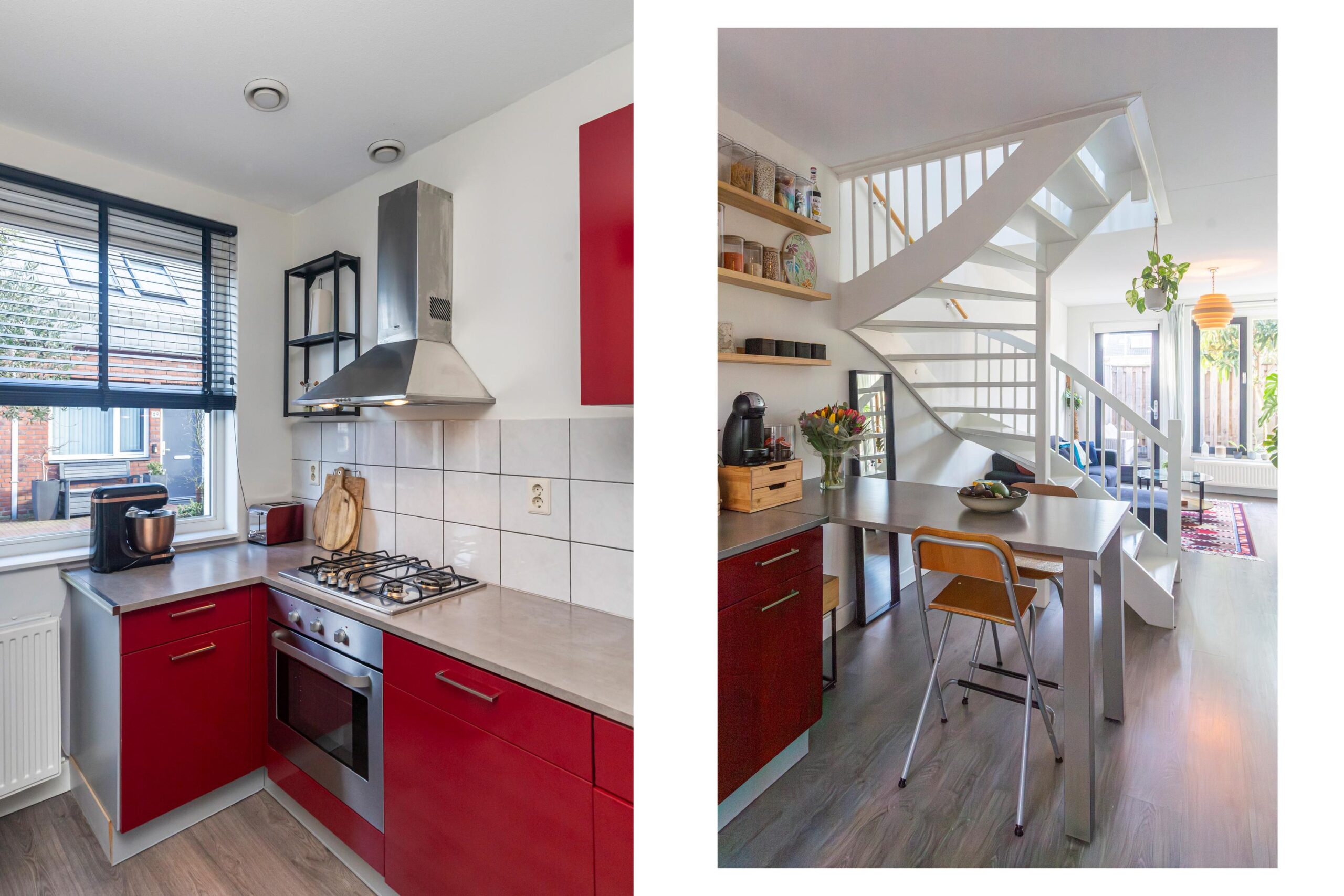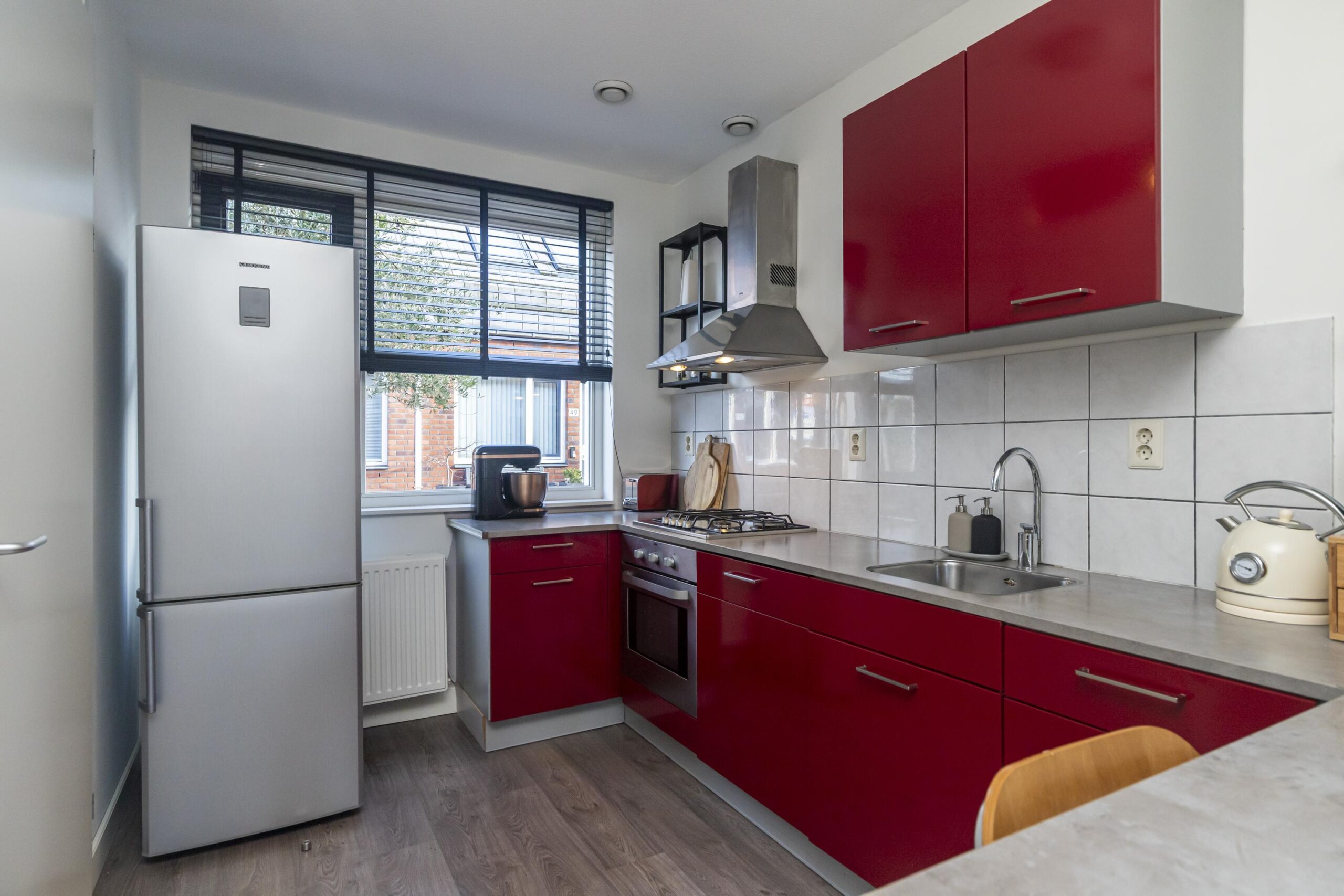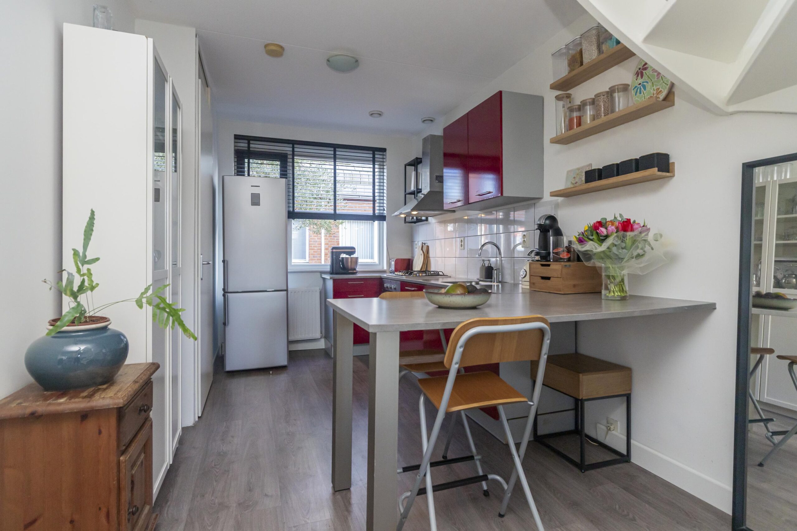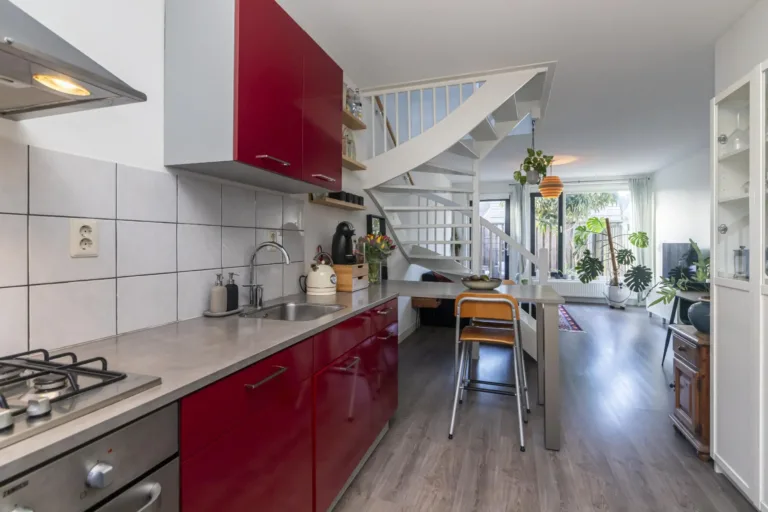 Via de voordeur kom je binnen in de hal met meterkast en een modern toilet met fonteintje. Vanuit de hal stap je via de keuken de lichte woon-/eetkamer in, waar de hoge ramen zorgen voor veel natuurlijk licht. De keuken ligt aan de voorzijde van de woning en is uitgerust met diverse inbouwapparatuur, waaronder een vierpits gaskookplaat, oven, afzuigkap en vaatwasser. Vanuit de woonkamer is er toegang tot de zonnige achtertuin op het zuidwesten.