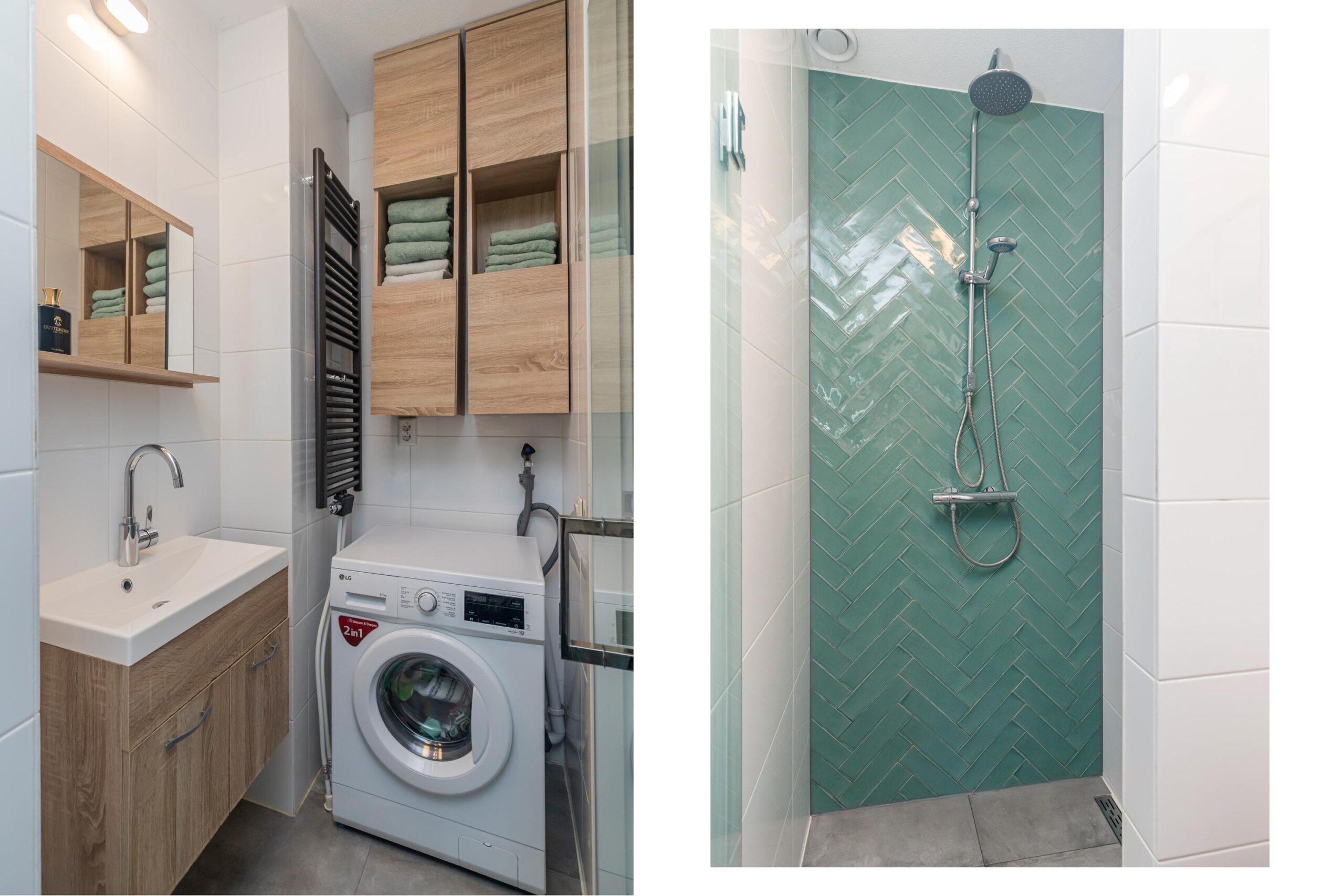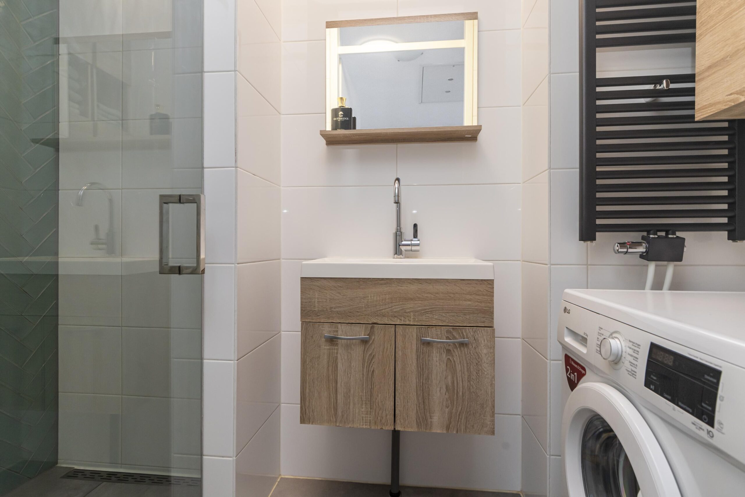 - Badkamervoorzieningen Wastafelmeubel, inloopdouche, wasmachineaansluiting