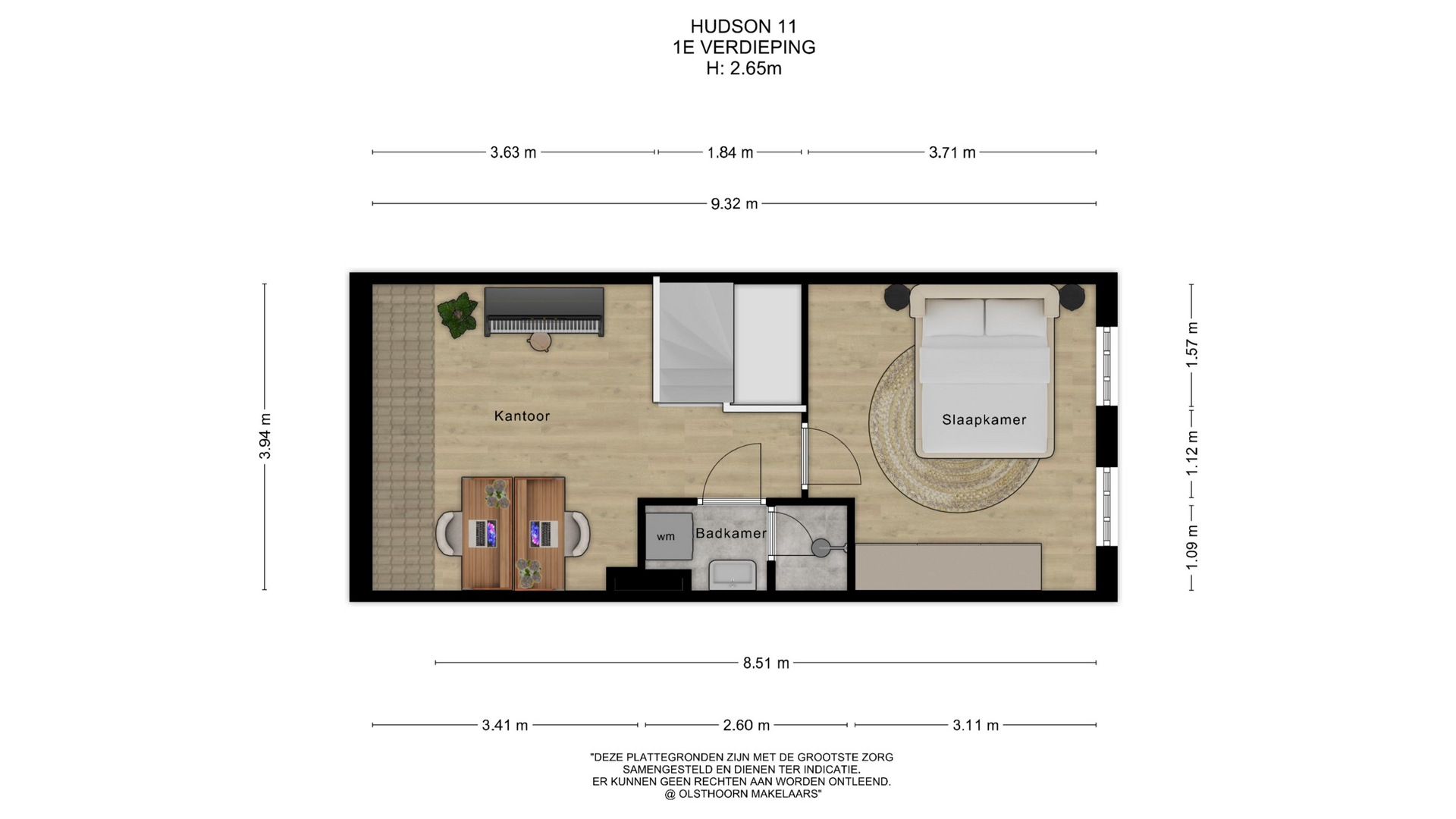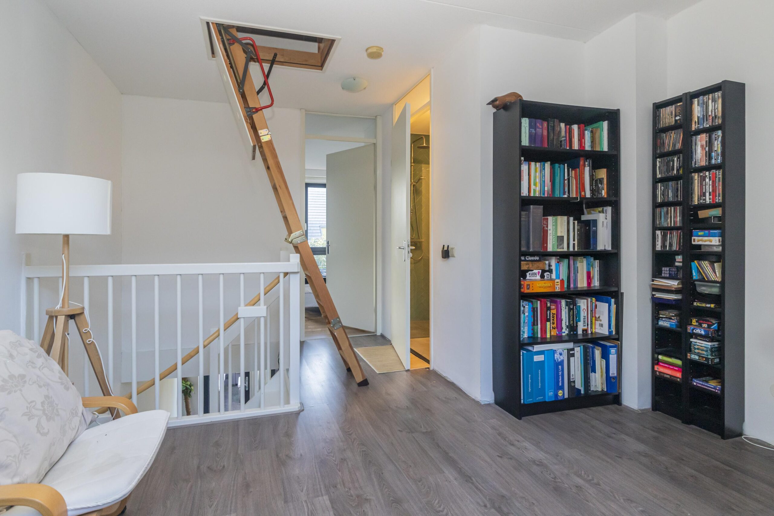 De ruime overloop biedt mogelijkheden voor een werkplek, hobbyruimte of het creëren van een extra slaapkamer. De badkamer is modern afgewerkt met een inloopdouche, wastafelmeubel, handdoekradiator en aansluitingen voor wasmachine en droger. Aan de voorzijde ligt een ruime slaapkamer over de volledige breedte van de woning.