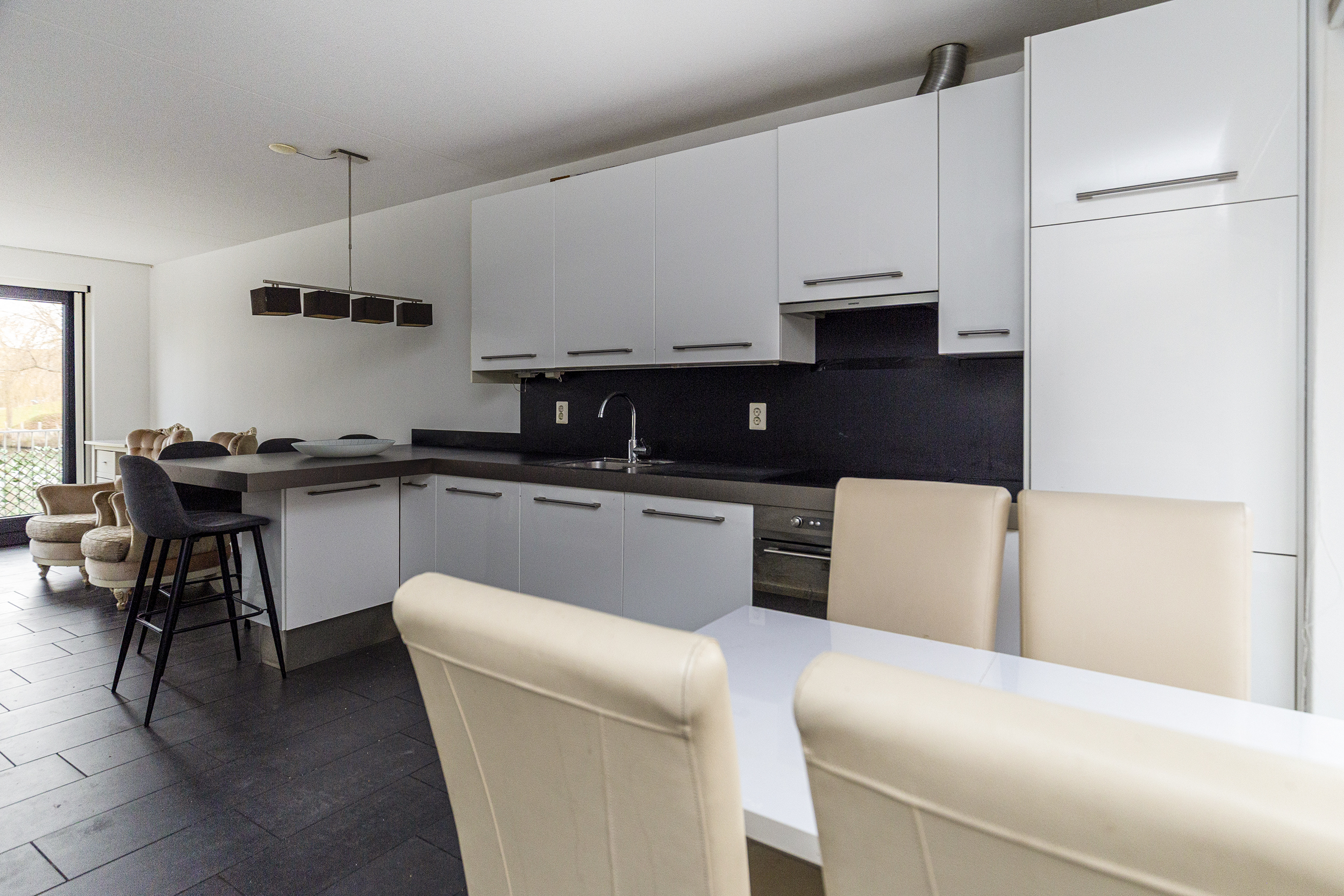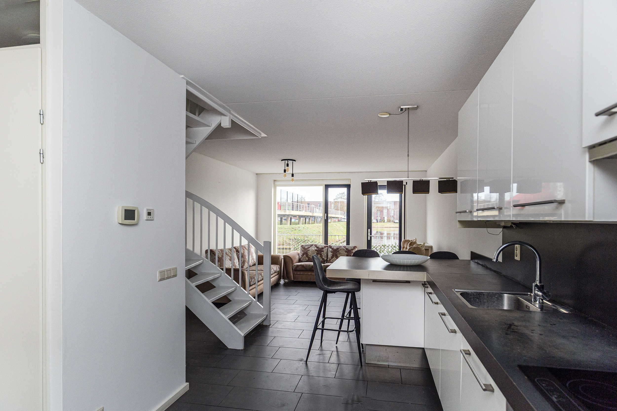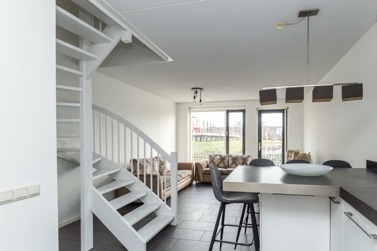 Entree, open hal met meterkast en toilet. Lichte open woonkeuken met onder- en bovenkasten, 4-pits elektrische kookplaat, afzuigkap, combimagnetron, koel/vriescombinatie en vaatwasser. Wooneetkamer met deur naar het terras en fraai uitzicht over het water. Fraai en zonnig terras aan de achterzijde direct aan het water gelegen.