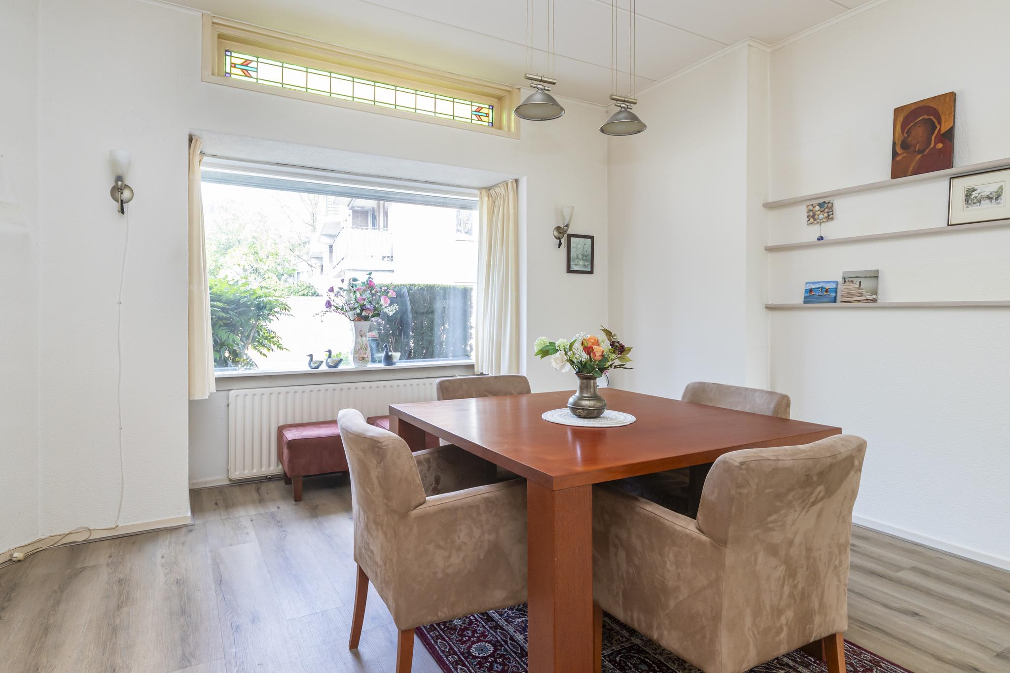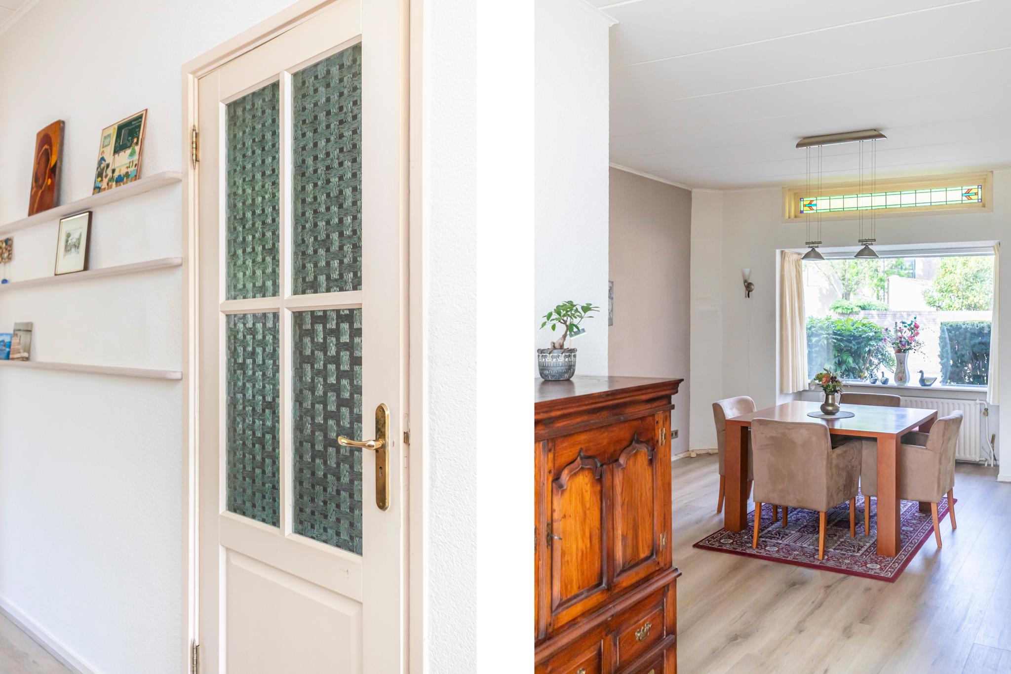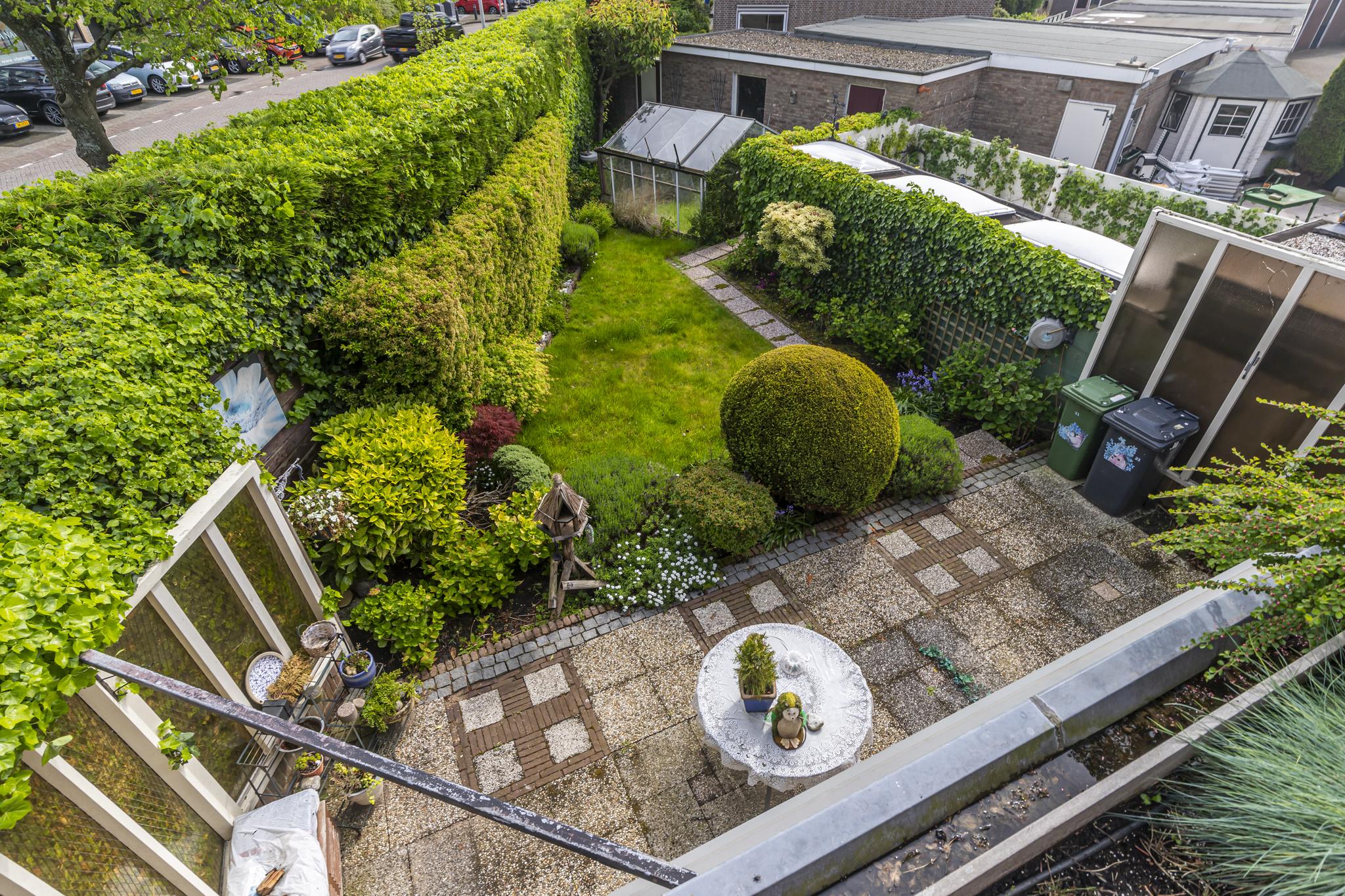 De achtertuin heeft een speelse indeling en is gelegen op het noordoosten; ideaal voor een zonnig ontbijt of een kopje koffie in de ochtendzon. De wens om zelf groente of fruit te verbouwen? Dat kan in het glazen kasje! En zoeken naar een parkeerplek behoort tot het verleden, want er is parkeergelegenheid op eigen terrein en in de garage.