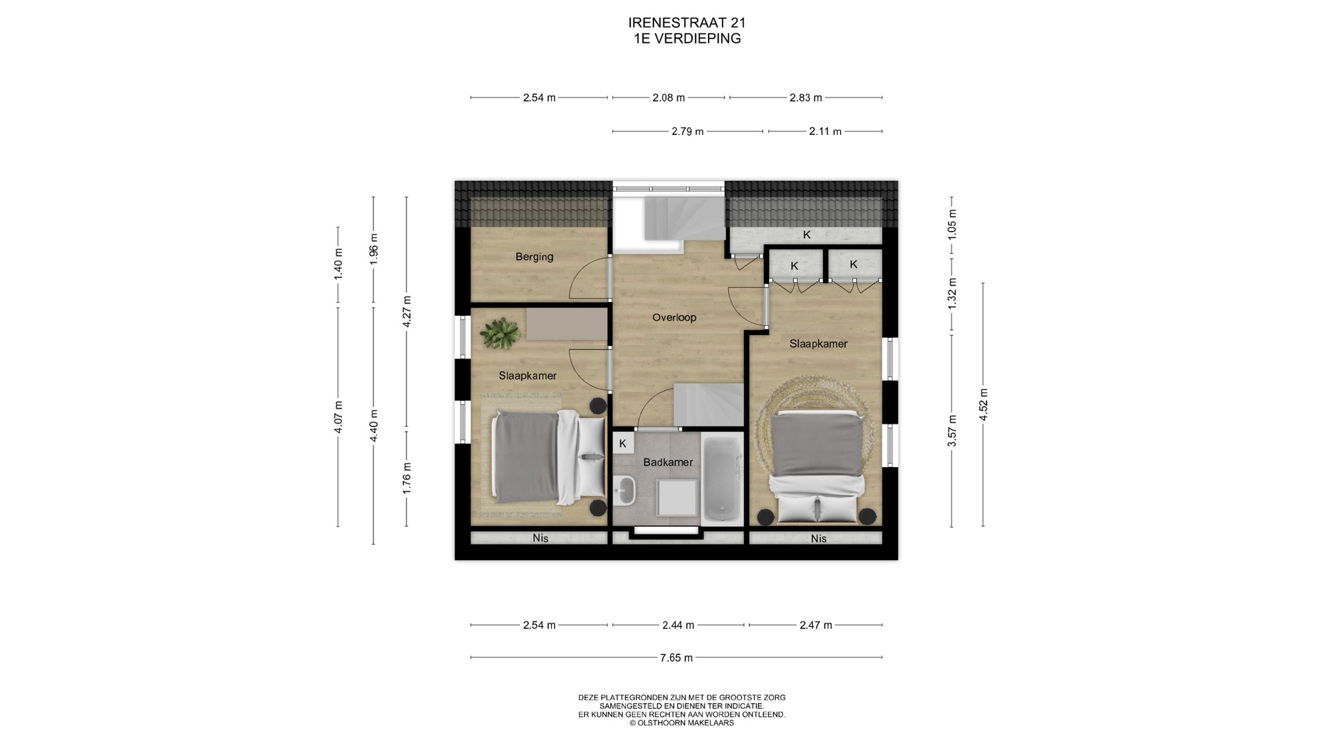 Op de eerste etage bevinden zich twee ruime slaapkamers, een bergkamer en een tweede badkamer. De vaste kasten zorgen voor veel extra bergruimte. De tweede verdieping herbergt nog eens twee slaapkamers en vaste kasten.