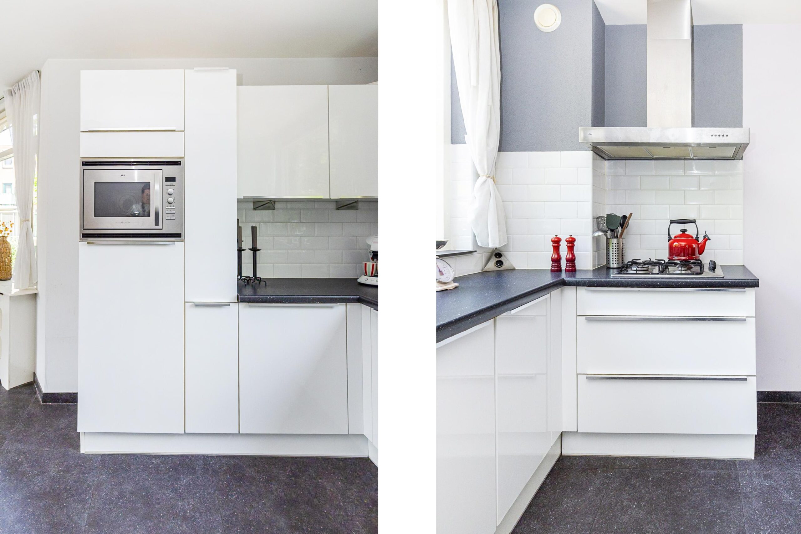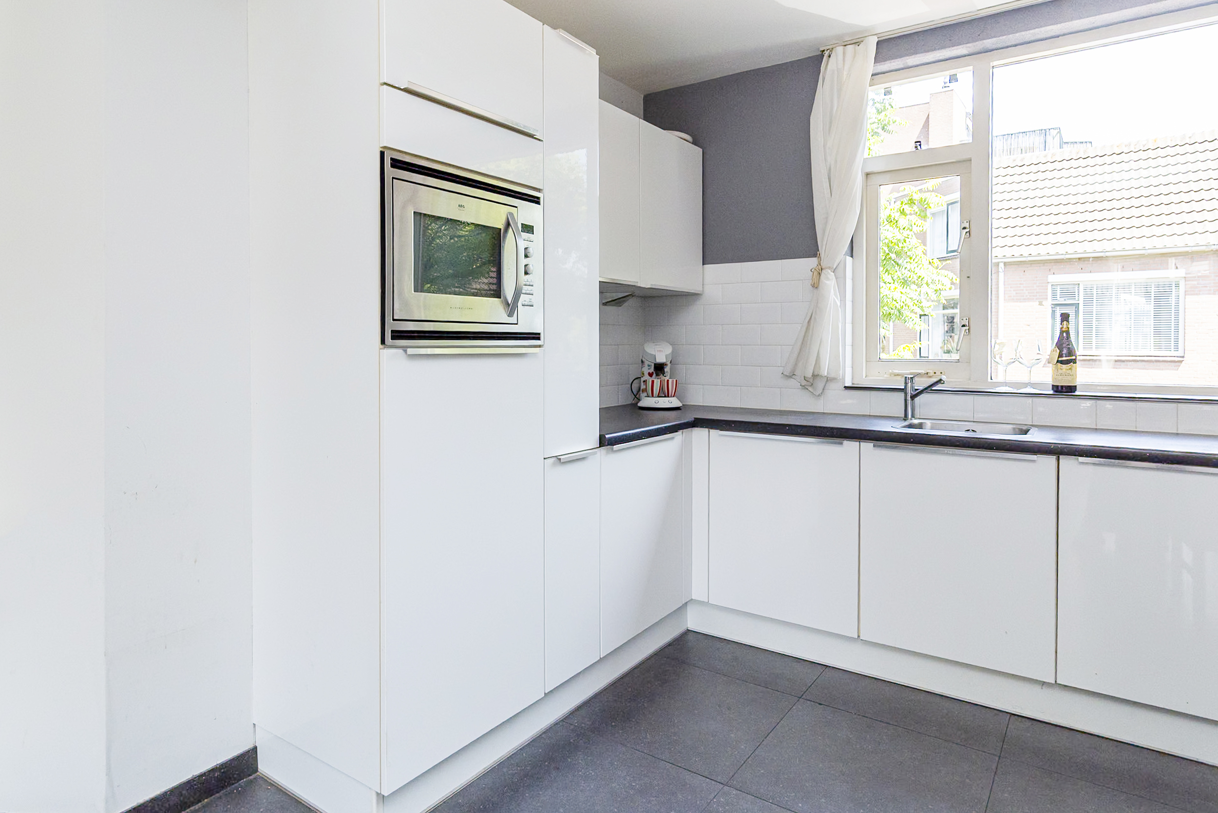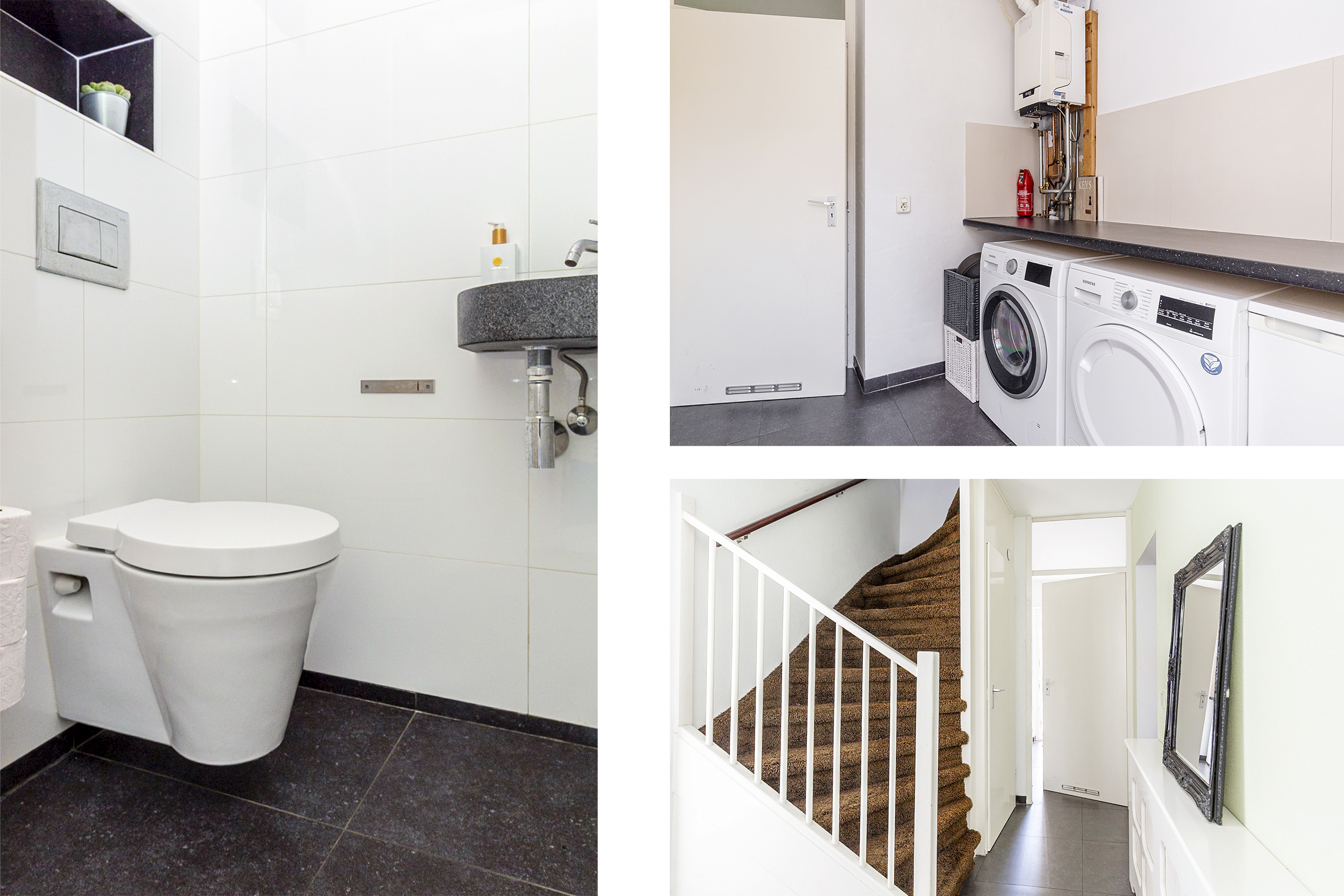 Via een beschutte buitentrap bereik je de voordeur van de woning. Je stapt binnen in een ruime hal met toegang tot de lichte woonkamer met open keuken, een multifunctionele kamer die nu dienst doet als wasruimte, een separaat toilet, een bergkast met meterkast en de trap naar de bovenverdieping. De woonkamer heeft een prettige sfeer en veel lichtinval. De moderne open keuken is uitgevoerd in wit hoogglans met een zwart werkblad en is voorzien van diverse inbouwapparatuur, waaronder een 4-pits gasfornuis, RVS afzuigkap, vaatwasser, koelkast en combi magnetron.
