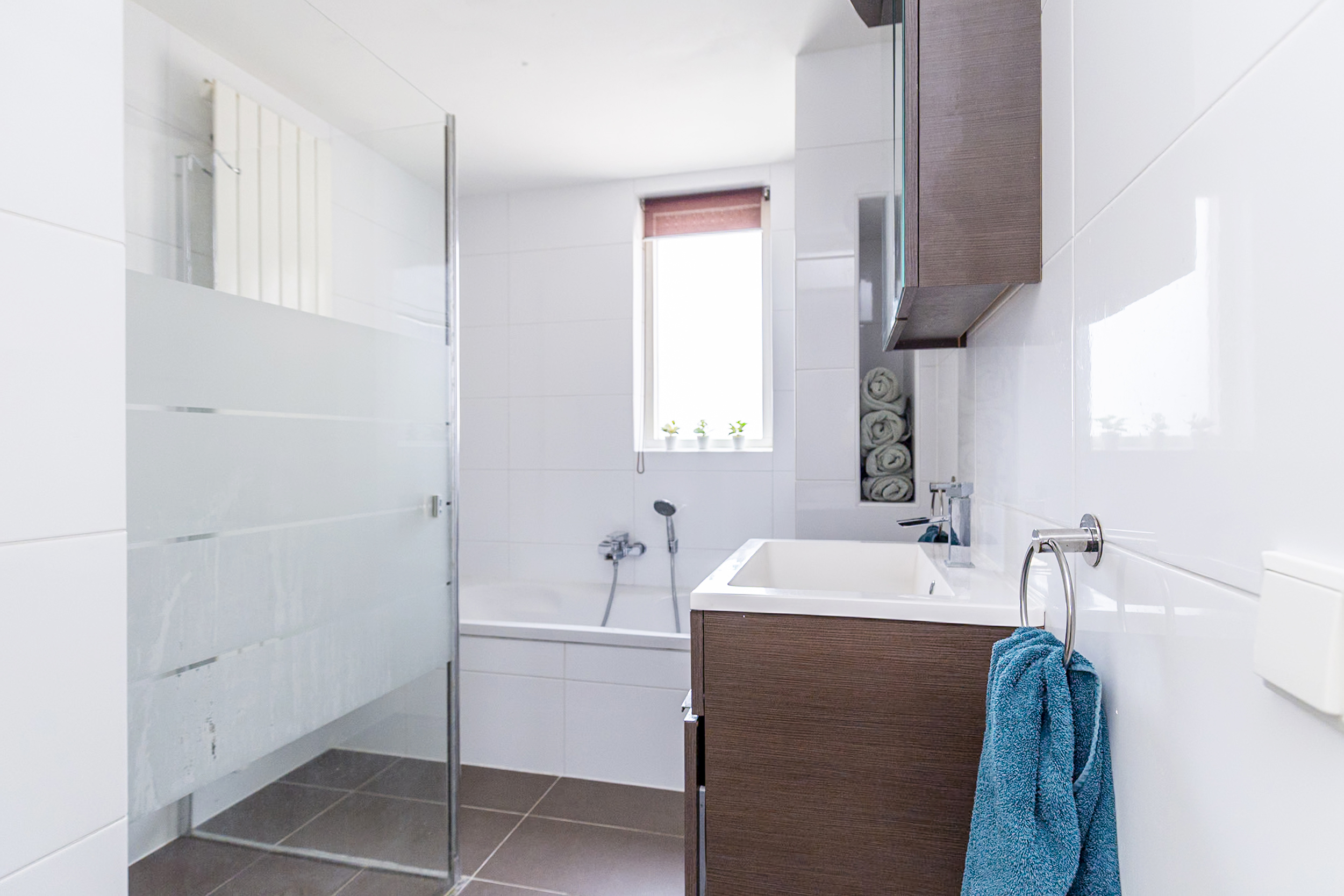 Op de bovenverdieping bevinden zich twee ruime slaapkamers, waarvan één met een royale inloopkast. De luxe badkamer is uitgerust met een ligbad, een inloopdouche, een wastafelmeubel en een handdoekradiator. Een leuk extraatje is dat je vanuit het bad tv kunt kijken.