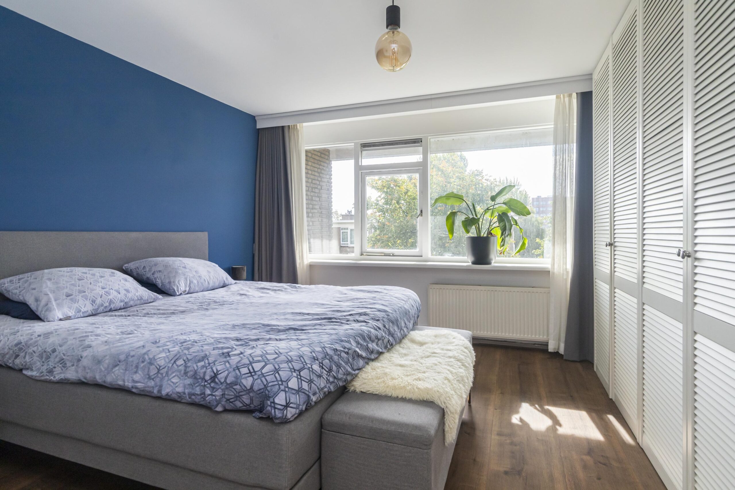 Vanuit de hal bereikt u de vierde verdieping door middel van de trap. De overloop is praktisch ingericht met bergruimte in kasten met louvredeuren en geeft toegang tot alle kamers. De hoofdslaapkamer aan de achterzijde is ruim opgezet en voorzien van een vaste kastenwand. Er is een aparte kast vanuit de hal bereikbaar waarin de wasmachine is gepositioneerd. Op de vierde verdieping liggen nog eens twee goed bemeten slaapkamers. Beide kamers geven toegang tot het tweede balkon, dat is uitgerust met een bergkast met de cv-installatie. De nette badkamer is volledig betegeld en voorzien van een ligbad, douche, wastafelmeubel en handdoekradiator.