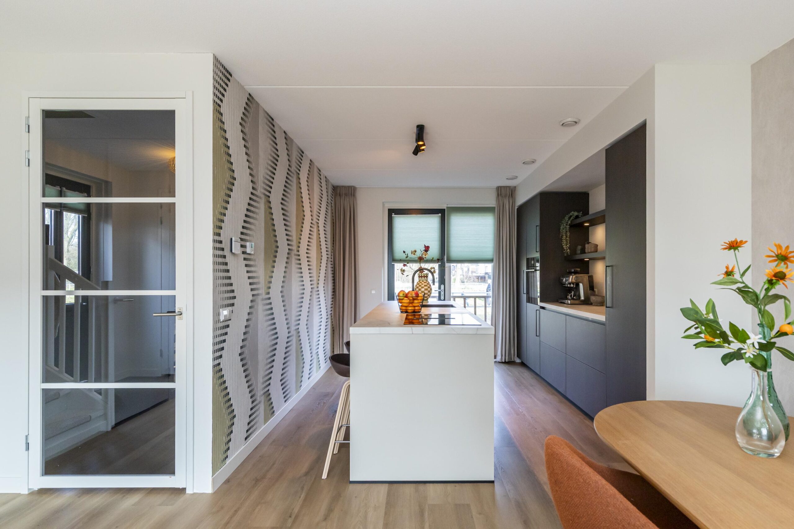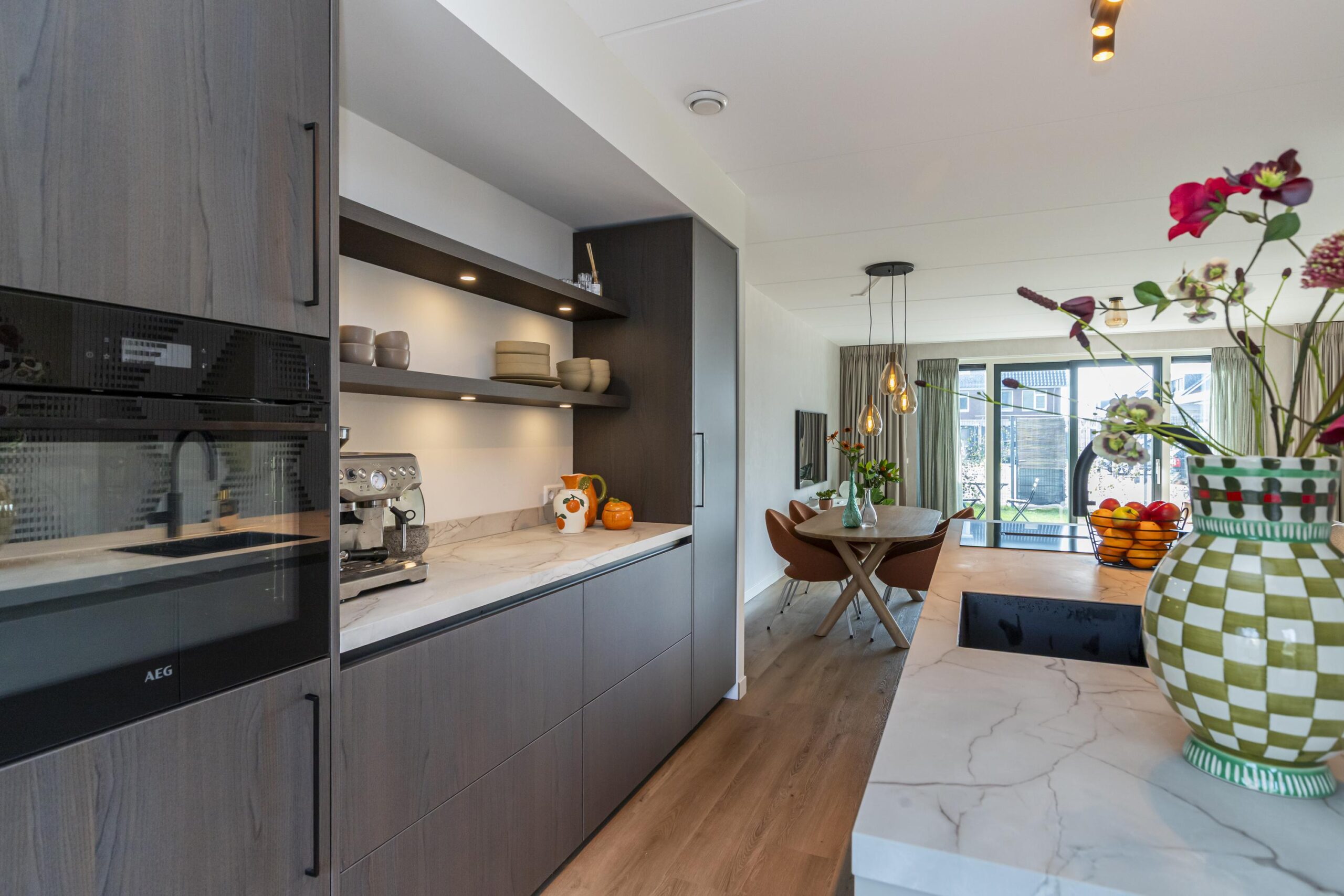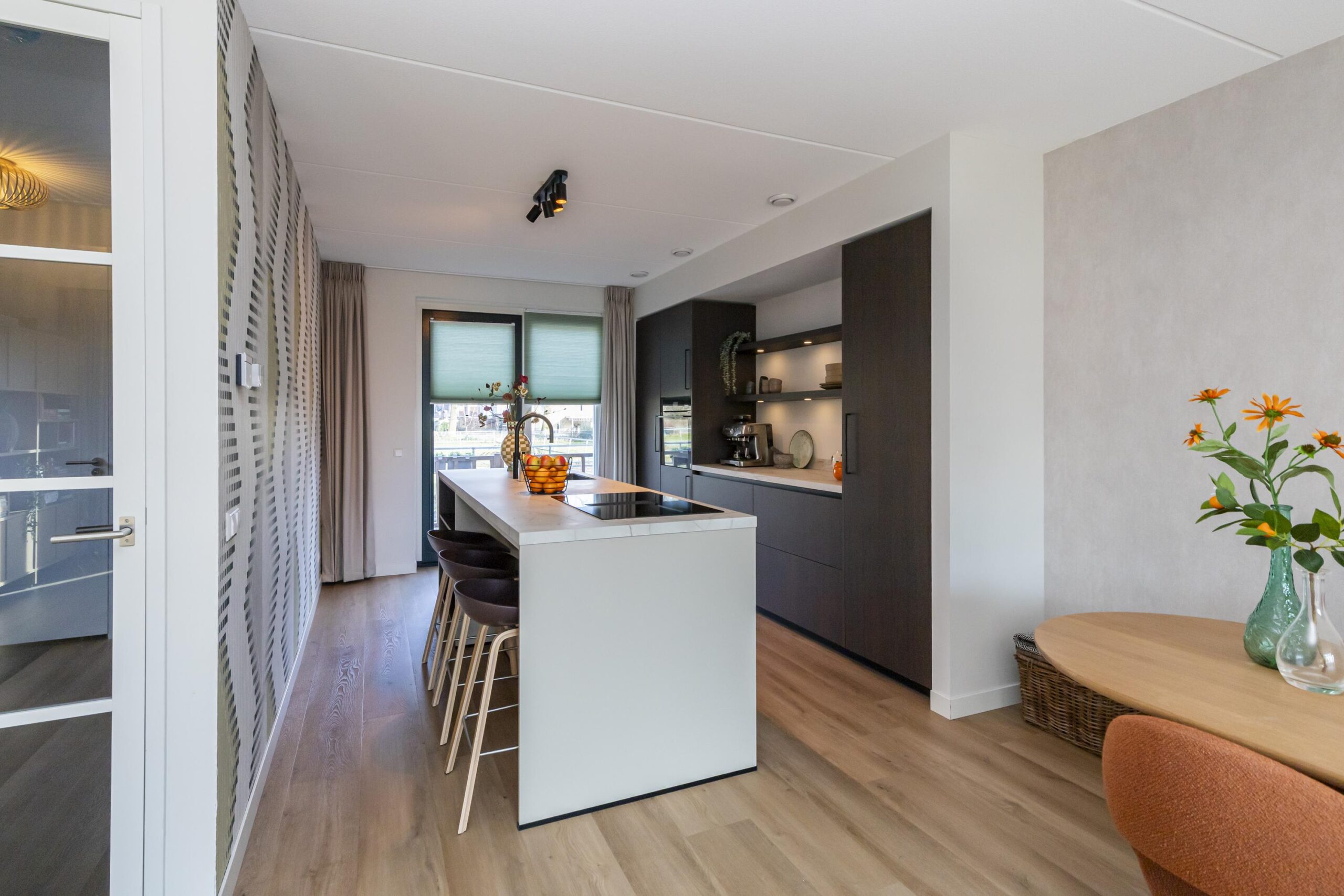 Aan de voorzijde bevindt zich de keuken, een echte eyecatcher. De donker bruine afwerking in combinatie met het marmeren werkblad geeft de ruimte een chique uitstraling. Het kookeiland met inductiekookplaat en geïntegreerde afzuiging vormt het centrale punt, terwijl de bar een fijne plek biedt voor een snelle koffie of een gezellige borrel. De keuken is compleet uitgerust met hoogwaardige inbouwapparatuur, waaronder een Quooker en een stijlvolle coffee corner. Ingebouwde spots zorgen voor extra sfeer.