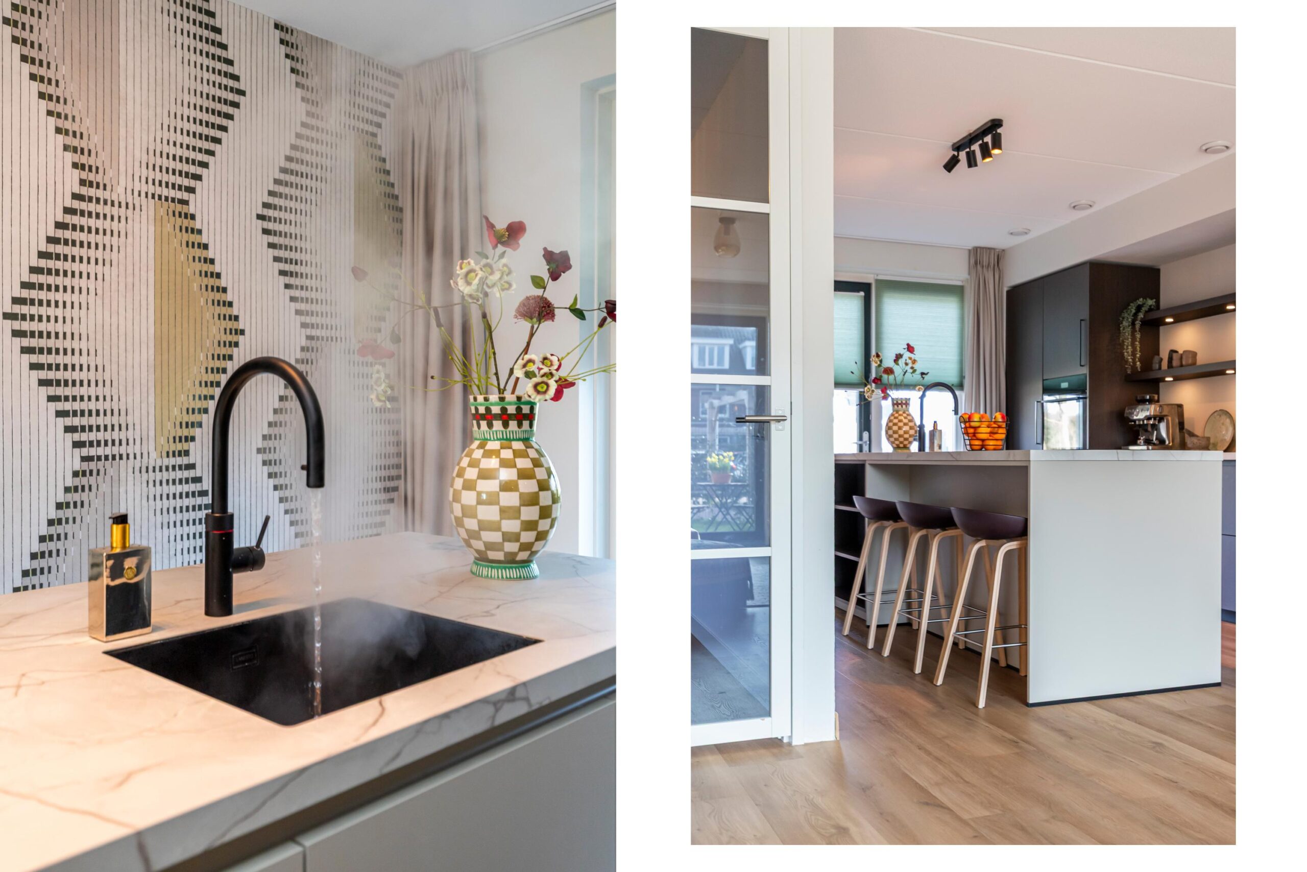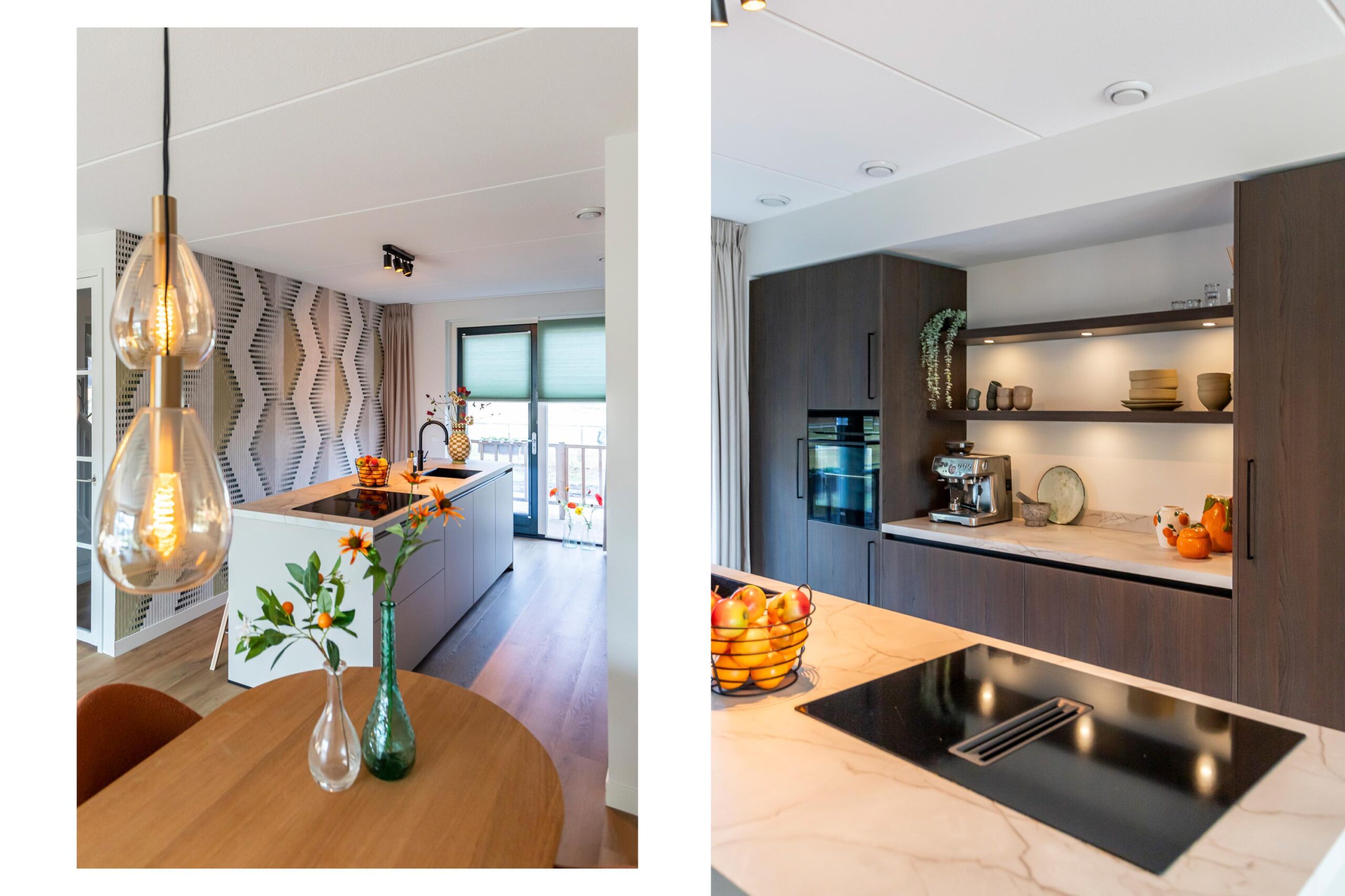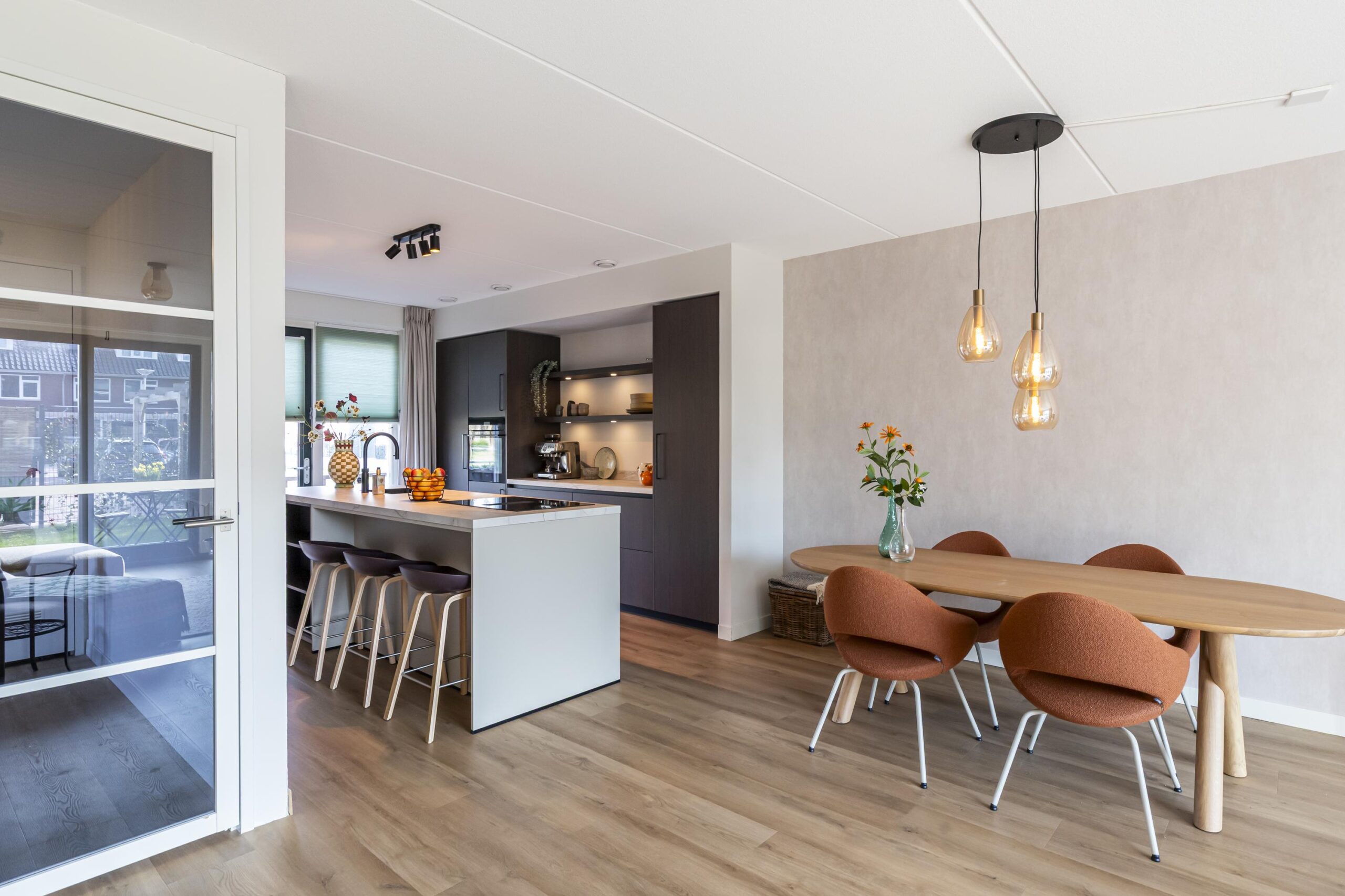 Aan de voorzijde bevindt zich de keuken, een echte eyecatcher. De donker bruine afwerking in combinatie met het marmeren werkblad geeft de ruimte een chique uitstraling. Het kookeiland met inductiekookplaat en geïntegreerde afzuiging vormt het centrale punt, terwijl de bar een fijne plek biedt voor een snelle koffie of een gezellige borrel. De keuken is compleet uitgerust met hoogwaardige inbouwapparatuur, waaronder een Quooker en een stijlvolle coffee corner. Ingebouwde spots zorgen voor extra sfeer.