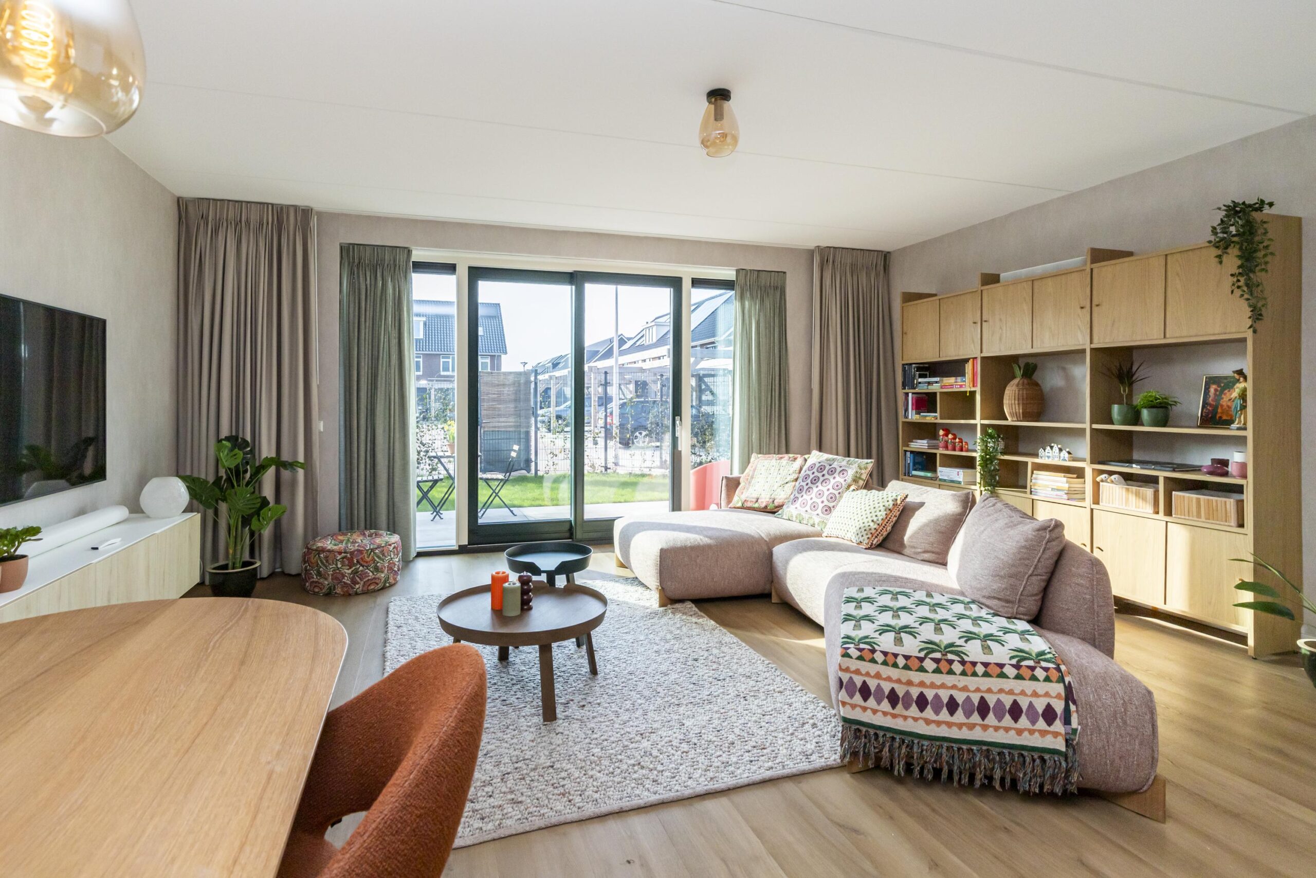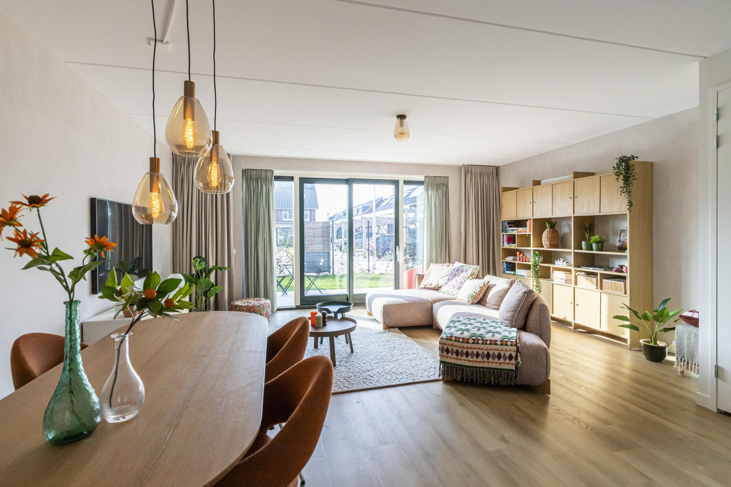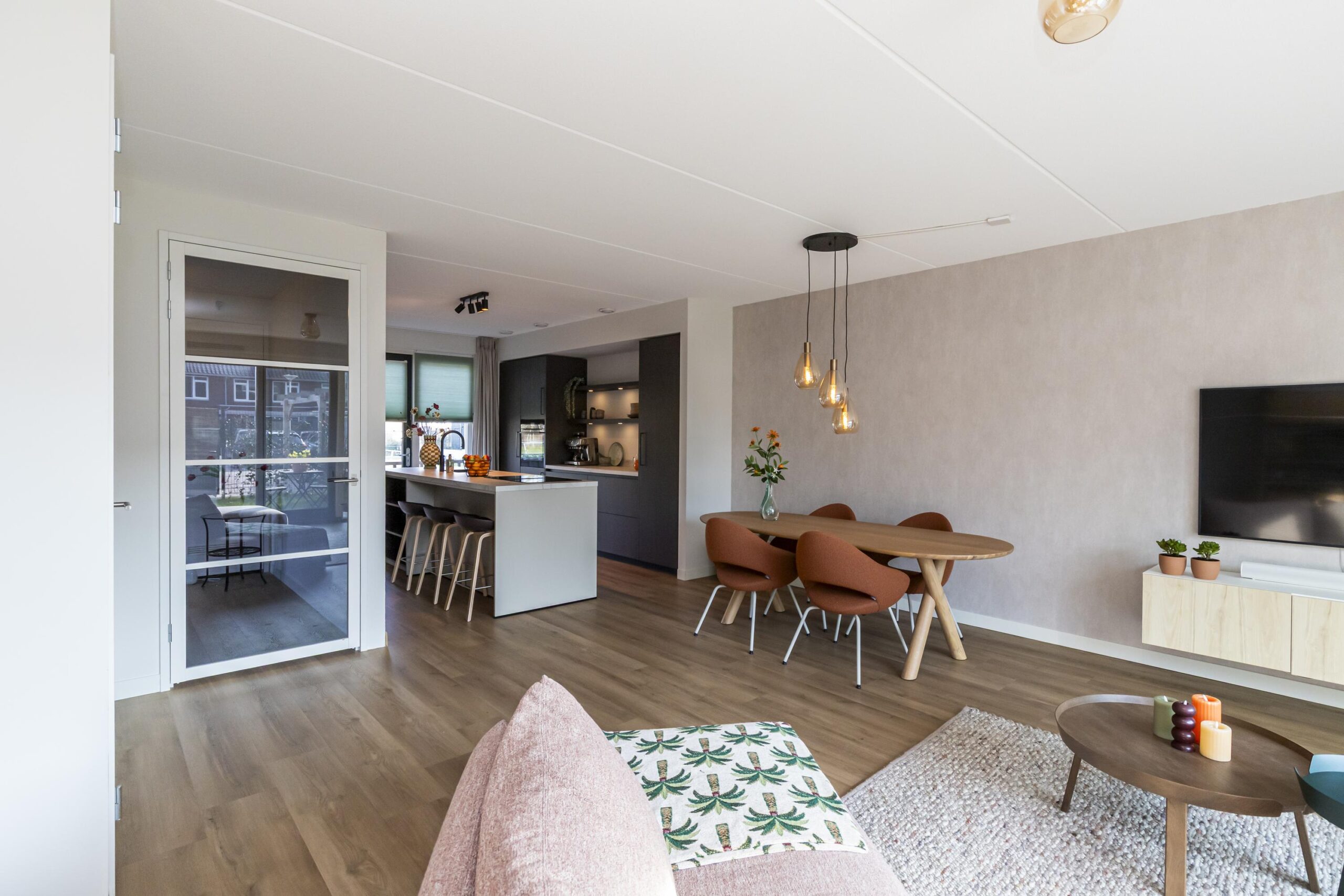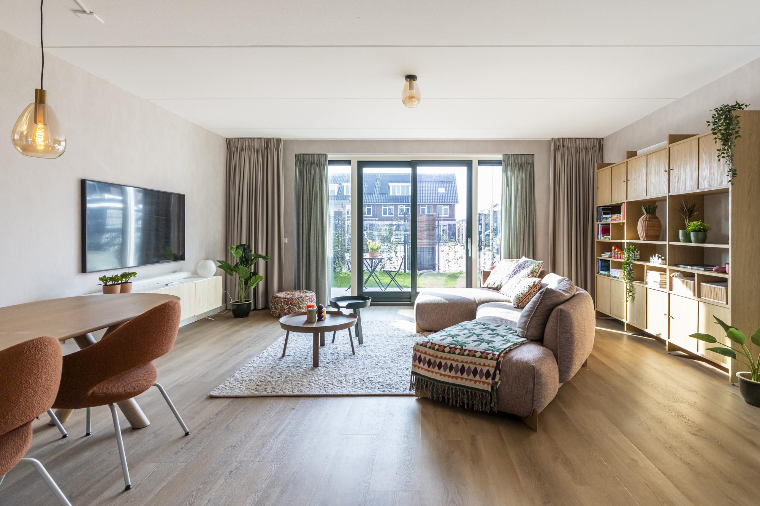De woonkamer staat in open verbinding met de keuken en voelt heerlijk ruim aan. Grote raampartijen zorgen voor veel natuurlijk licht. Hier is alle ruimte voor een royale zithoek en een grote eettafel. De indeling is praktisch en geeft een prettig ruimtelijk gevoel.
