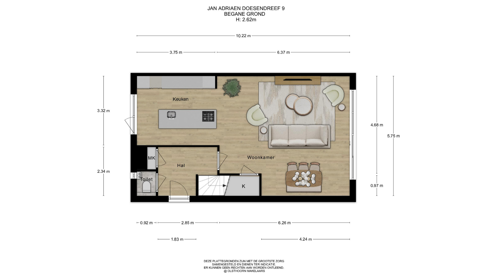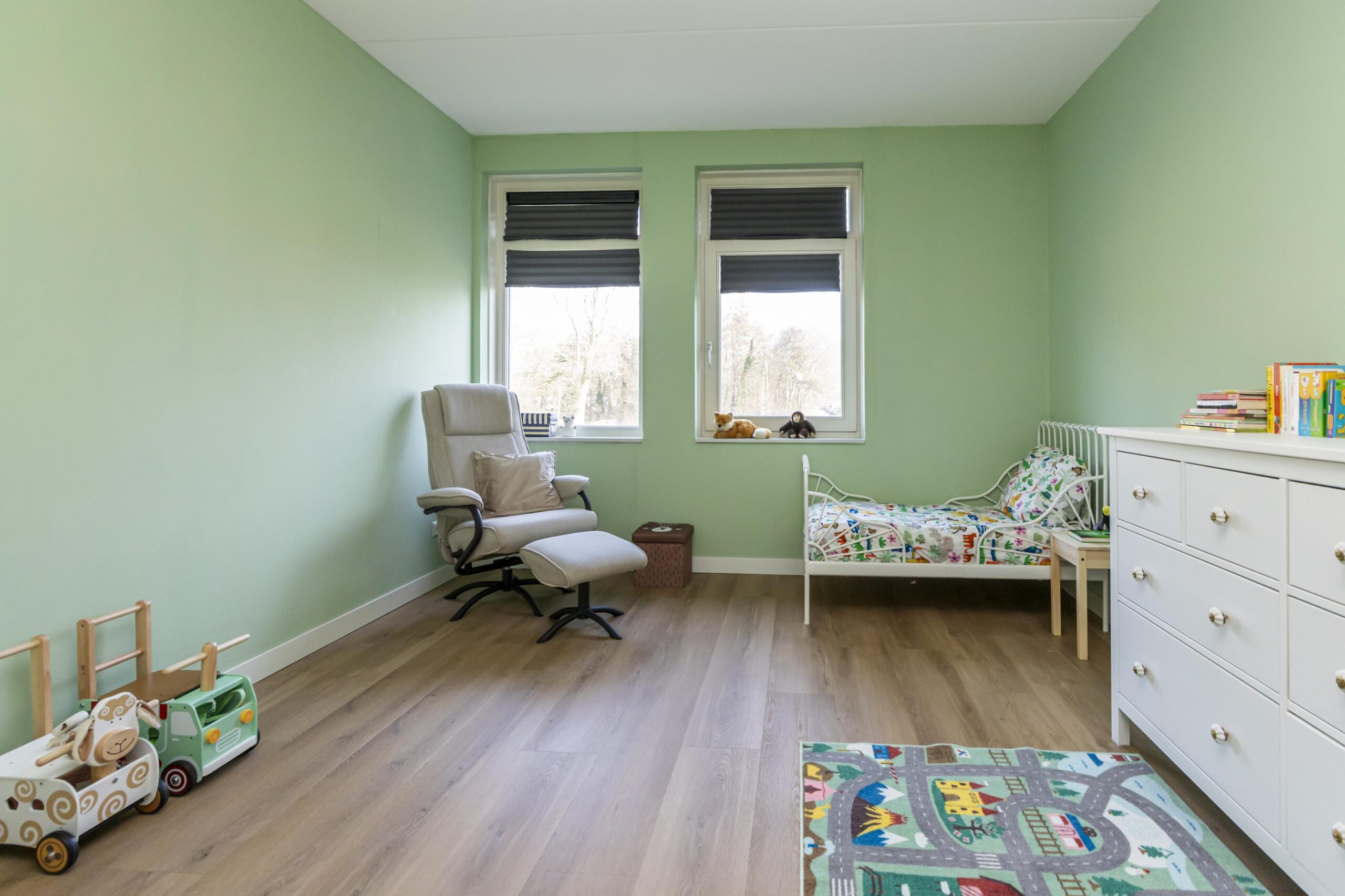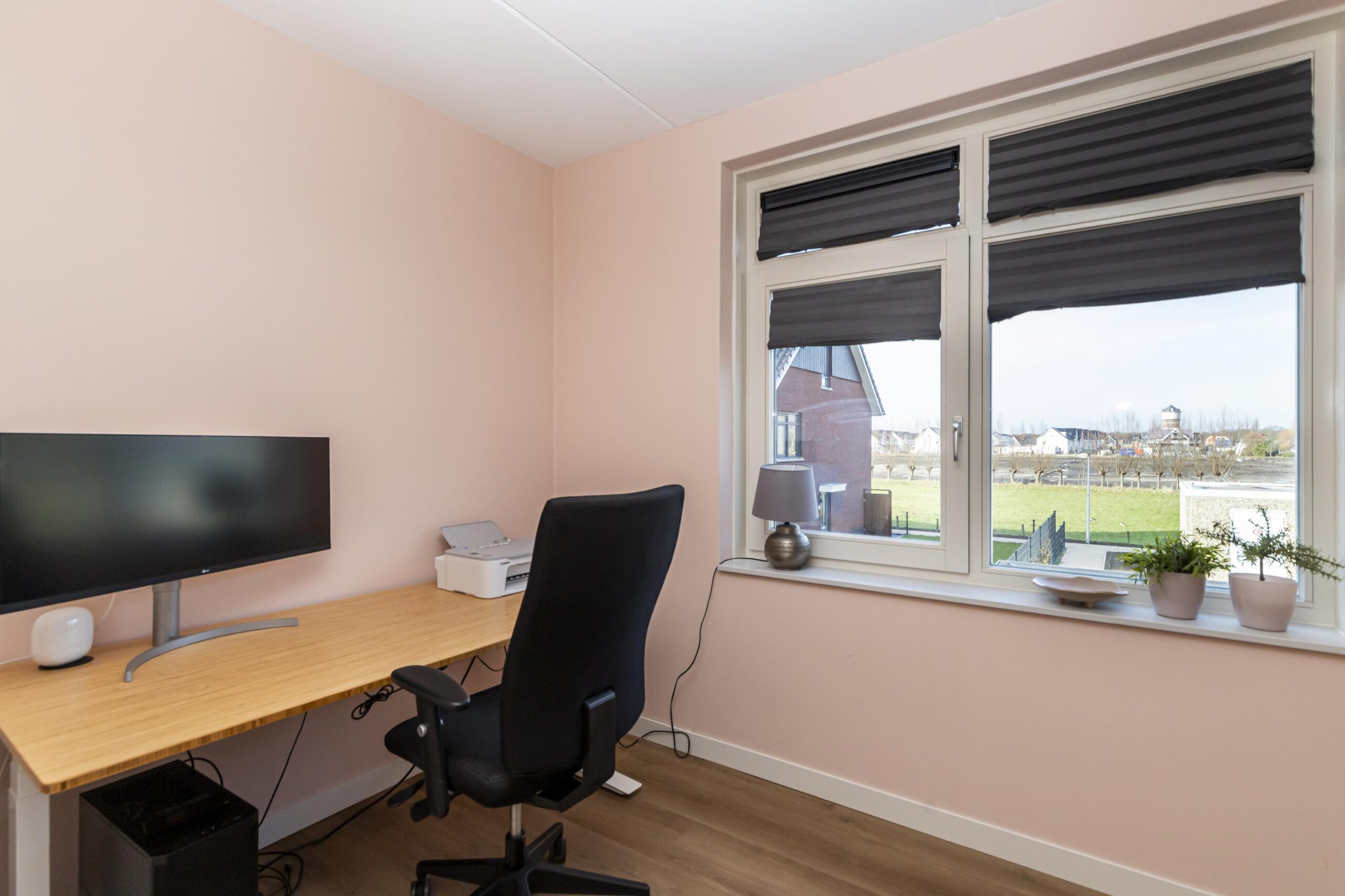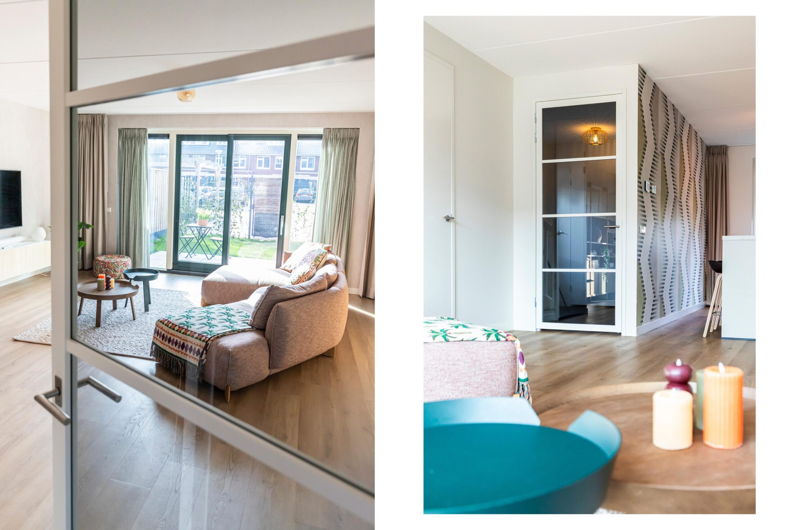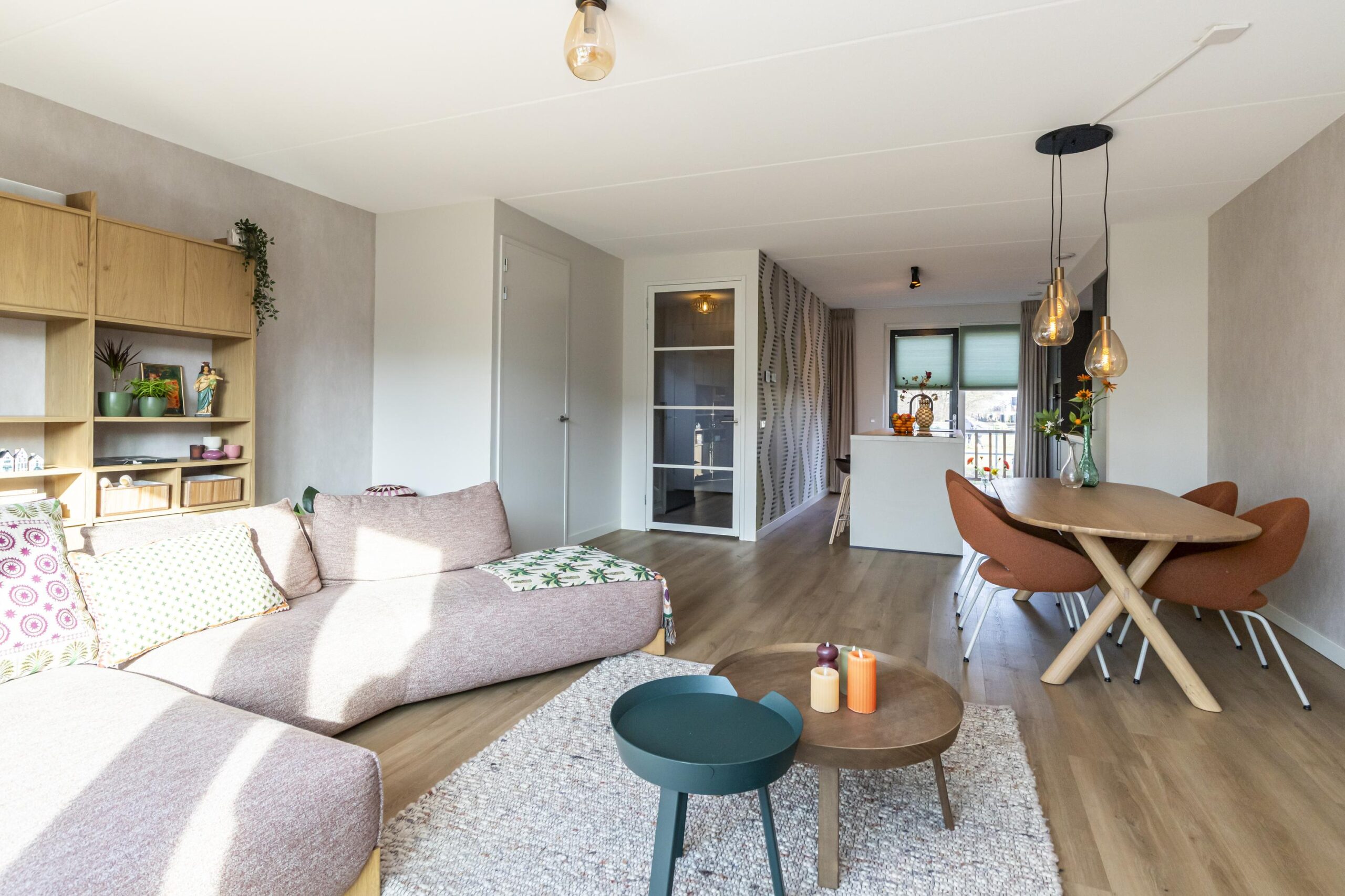 De woonkamer staat in open verbinding met de keuken en voelt heerlijk ruim aan. Grote raampartijen zorgen voor veel natuurlijk licht. Hier is alle ruimte voor een royale zithoek en een grote eettafel. De indeling is praktisch en geeft een prettig ruimtelijk gevoel.