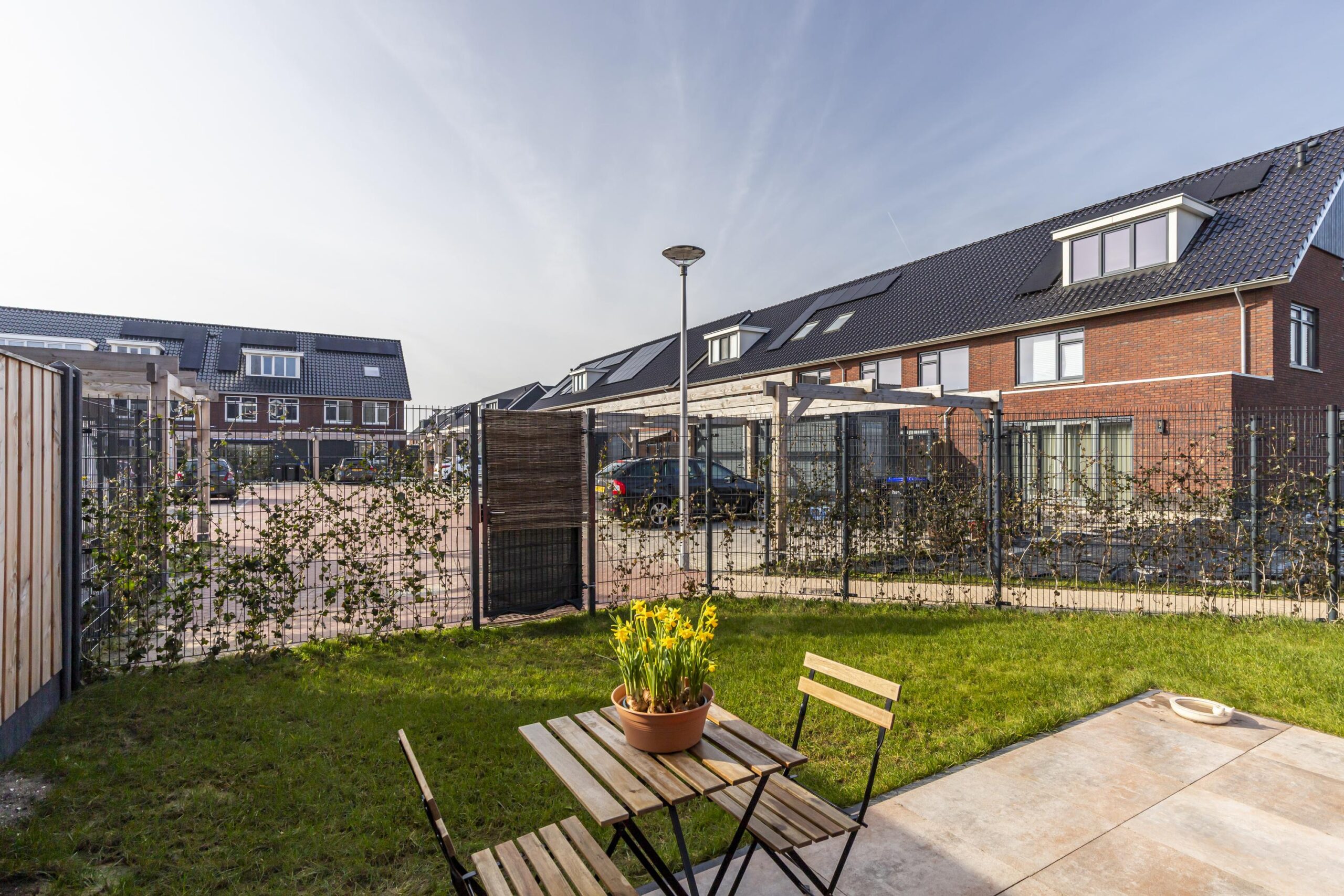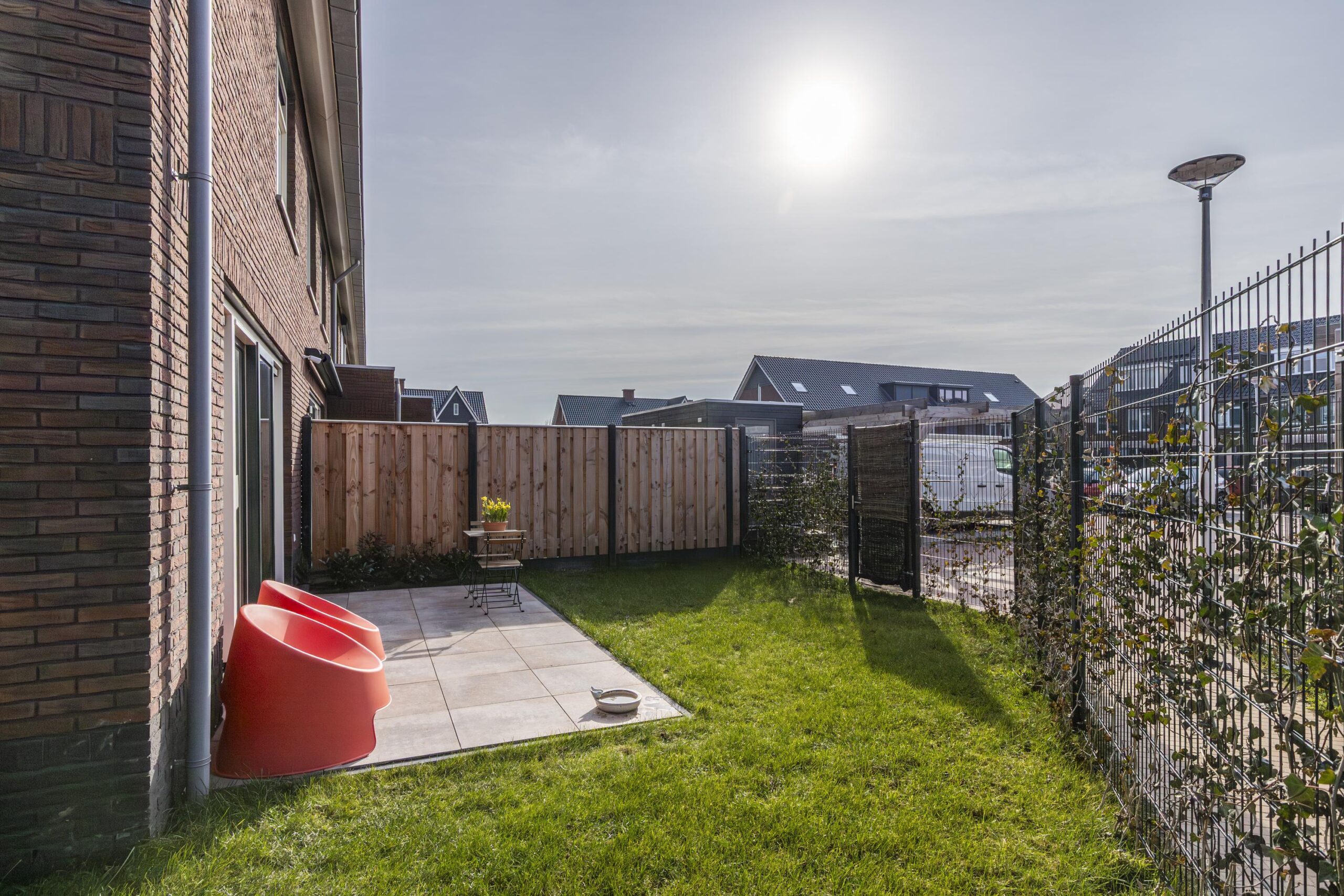 De tuin ligt op het zuidwesten, waardoor je hier volop geniet van de middag- en avondzon. Door de hoekligging ervaar je extra ruimte en een open gevoel. Er is voldoende plaats voor een loungehoek en een eettafel voor lange zomeravonden buiten.