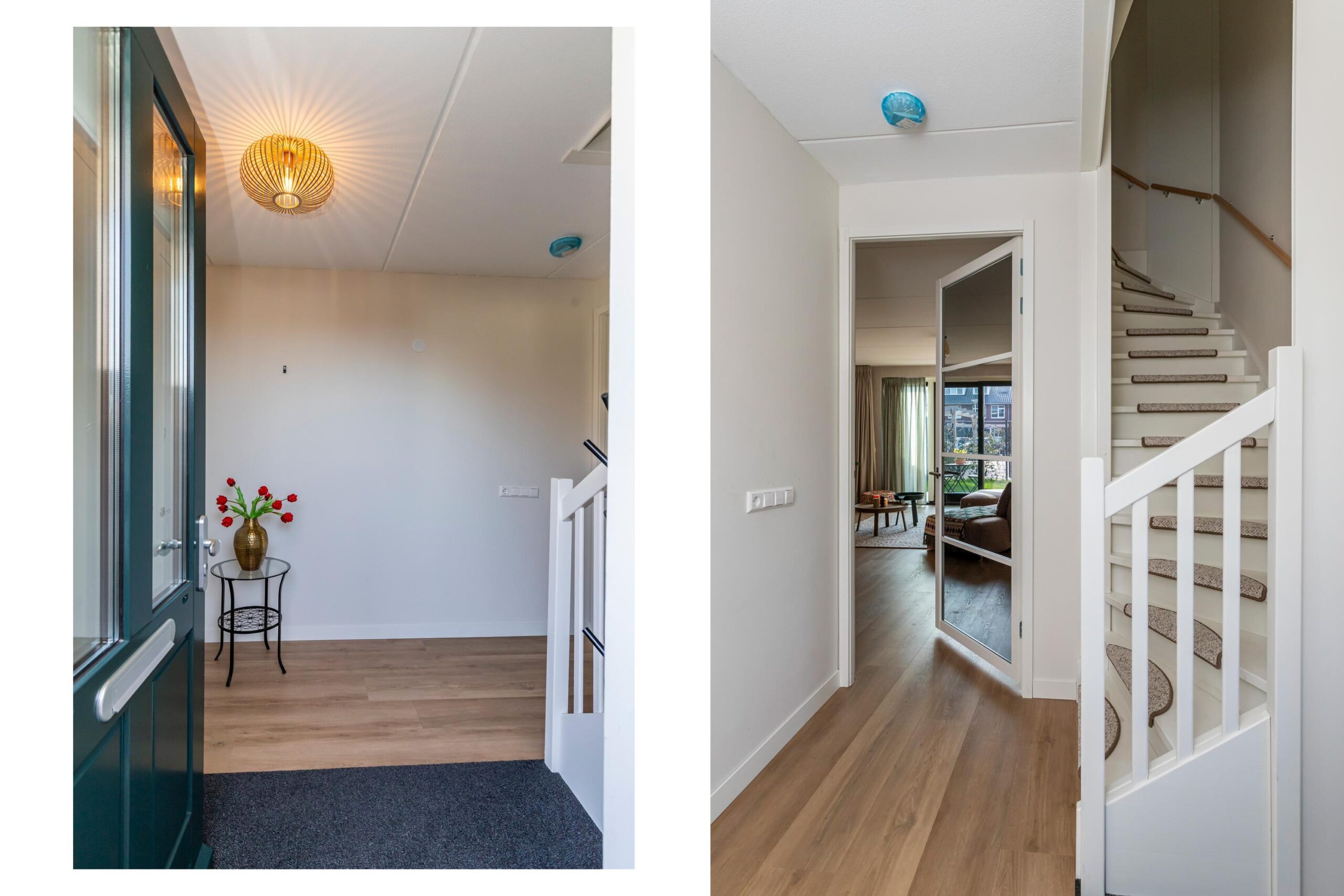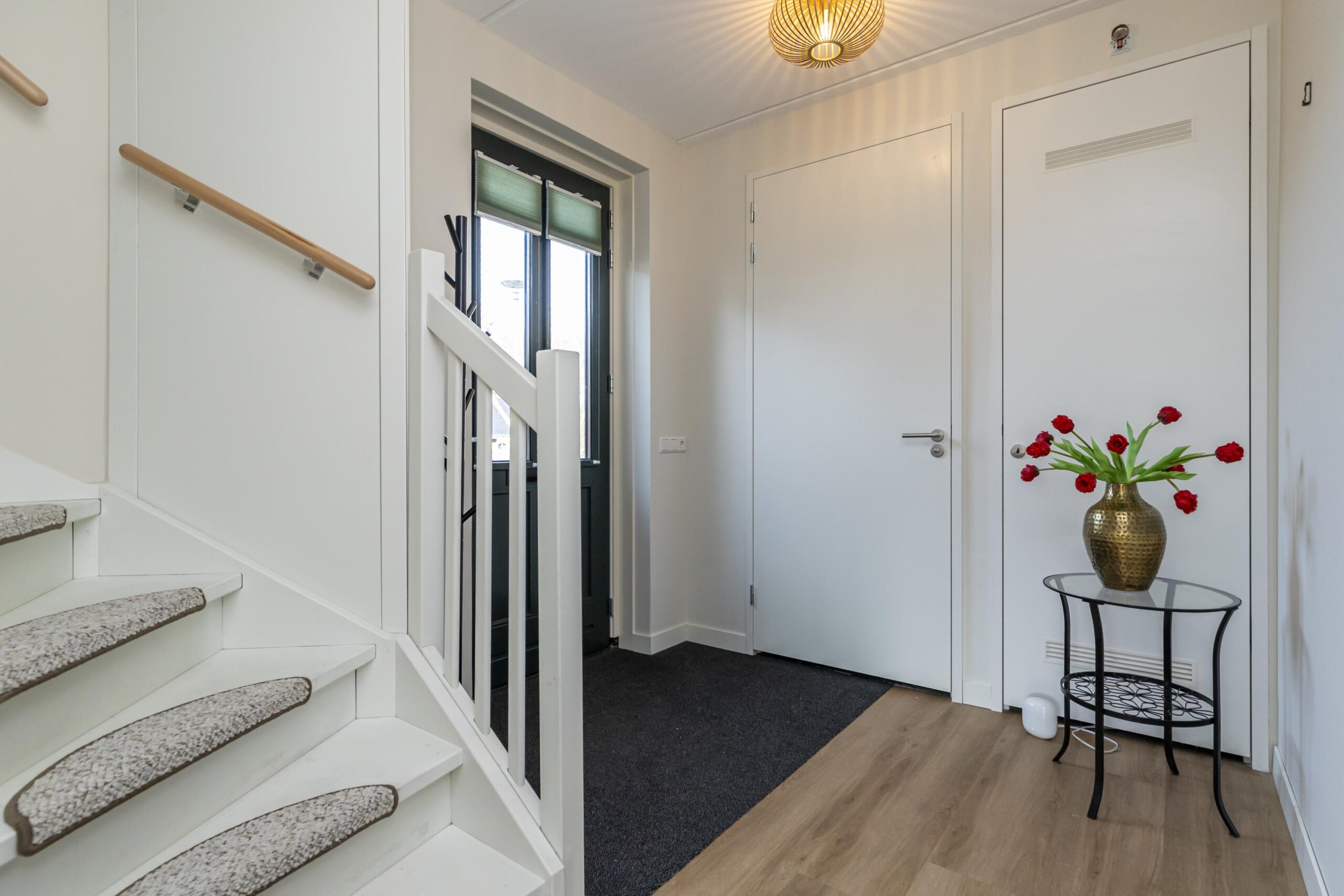 Via de zijentree kom je in de hal met toilet en praktische bergruimte. De begane grond is strak afgewerkt met een fraaie pvc-vloer, stompe deuren van Berkvens, hoge deurposten van circa 2,30 m en vloerverwarming over de gehele verdieping.