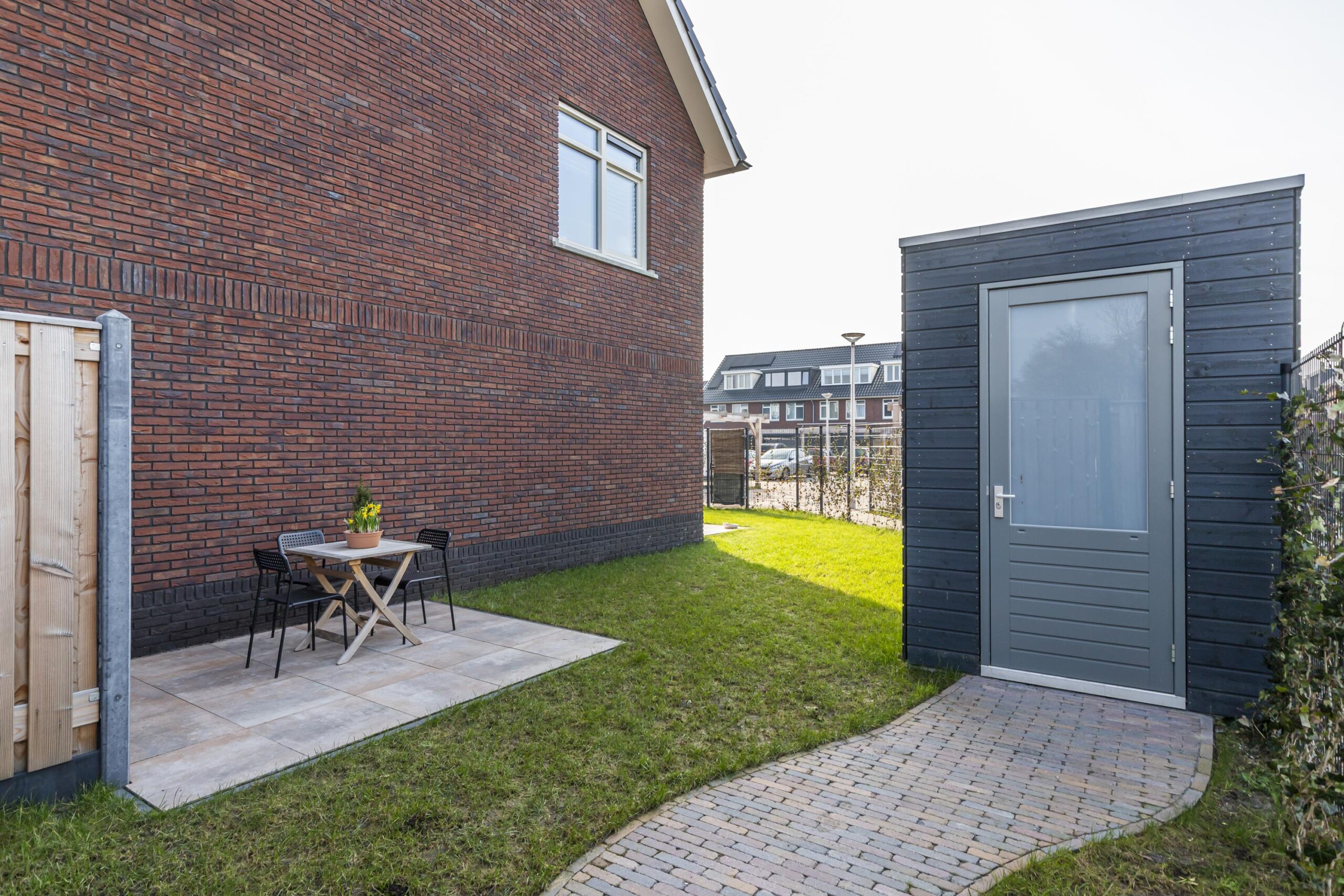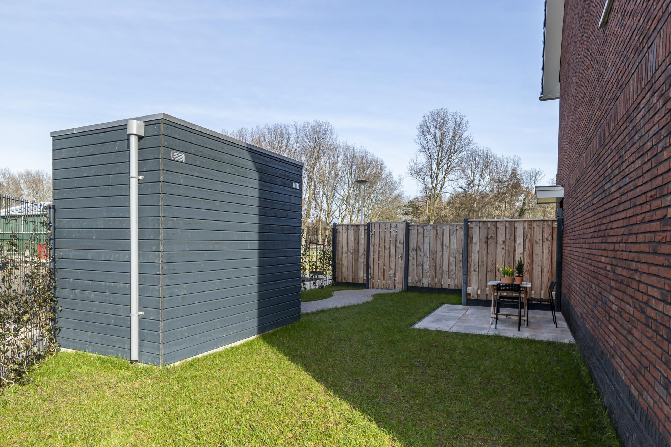 Achterin de tuin staat een vrijstaande berging, ideaal voor fietsen en tuingereedschap.