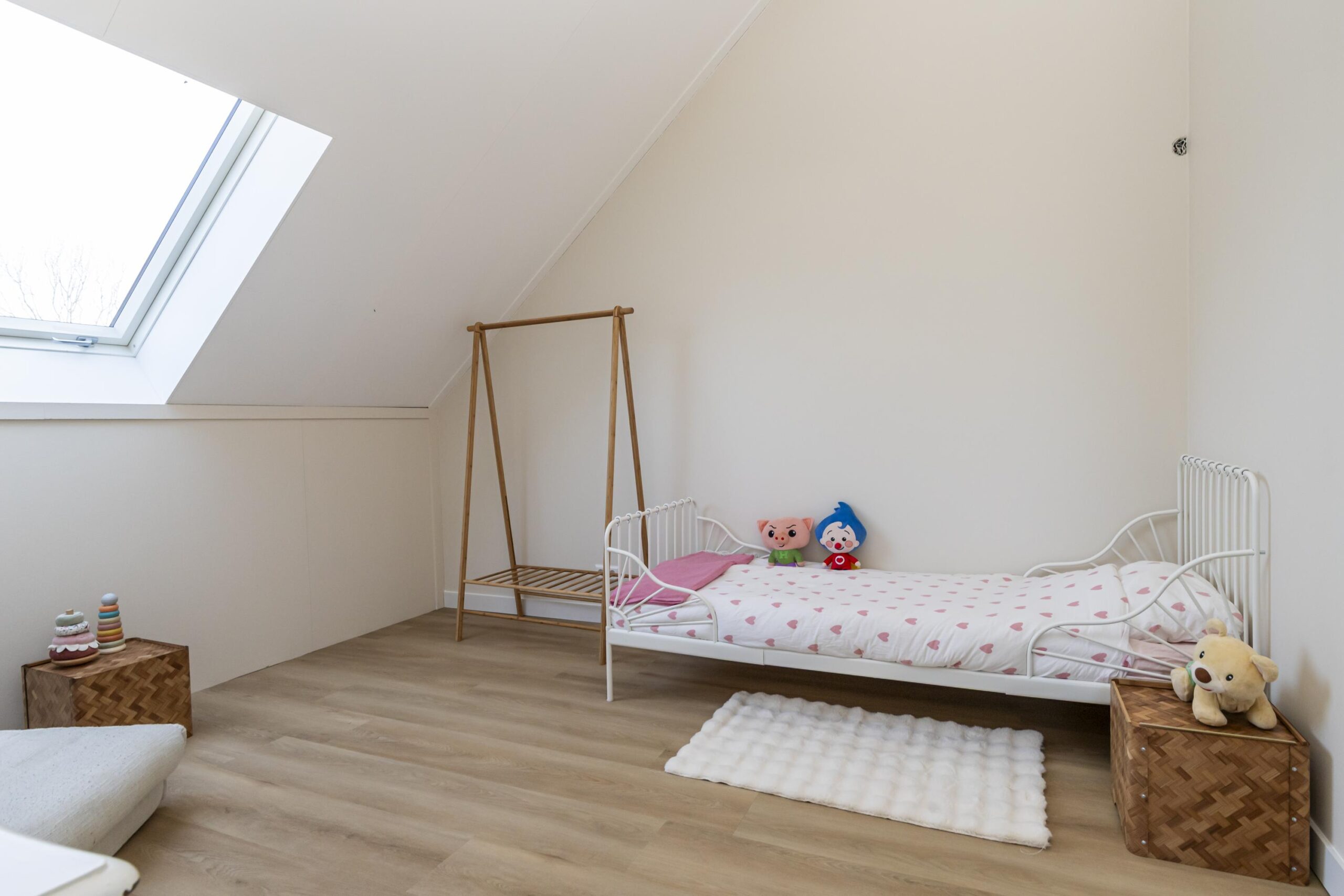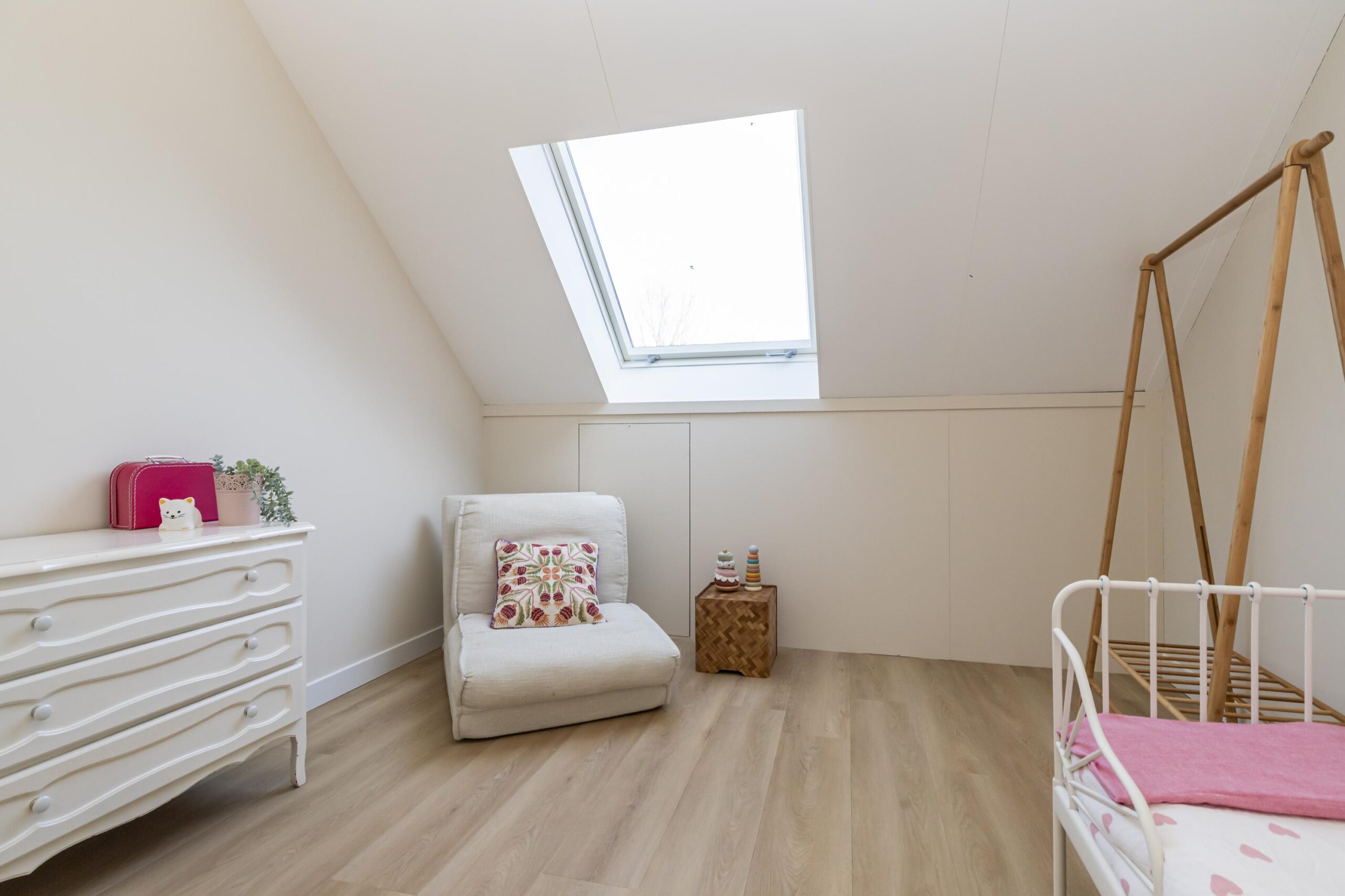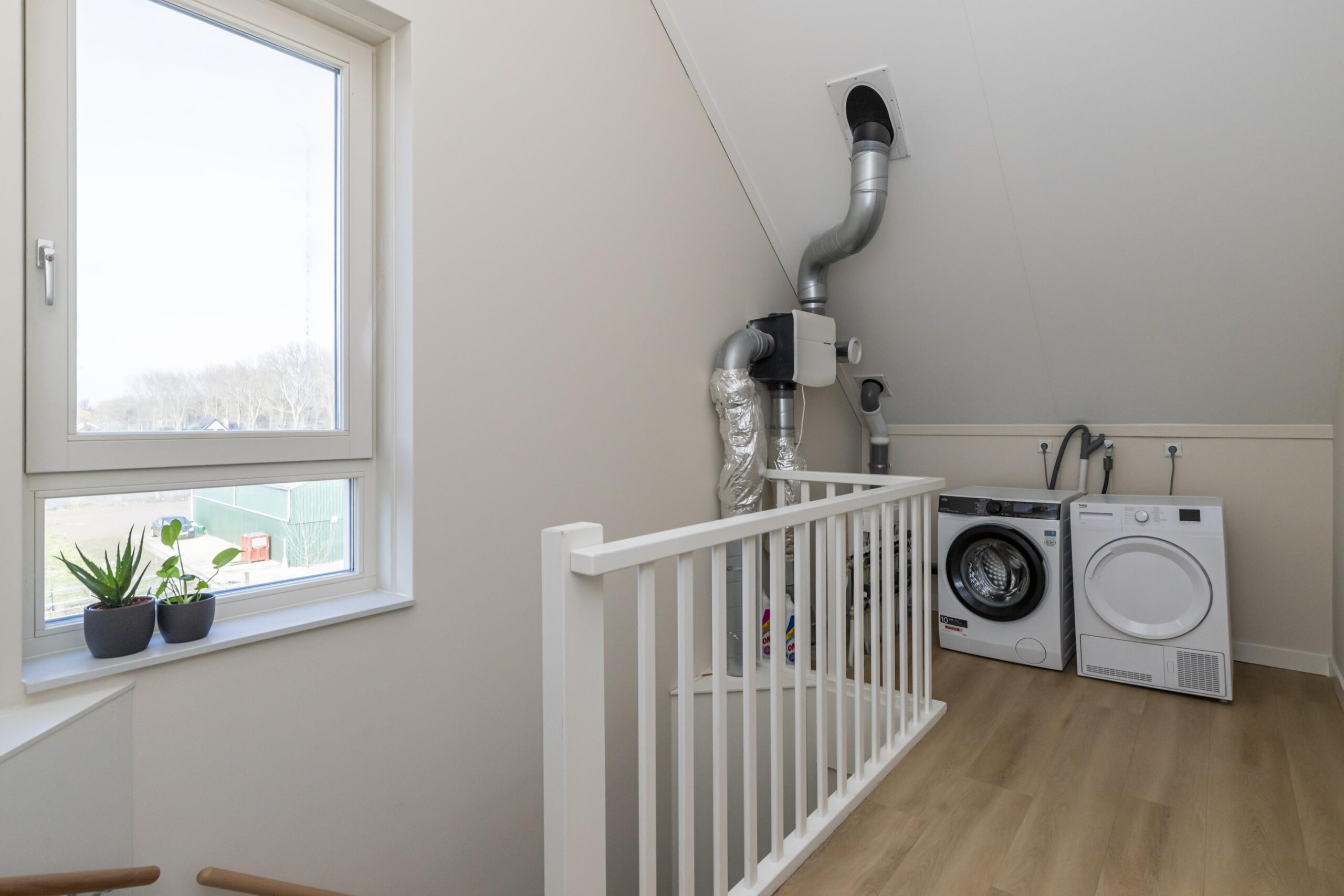 De tweede verdieping is verrassend ruim en praktisch ingedeeld. Op de overloop is plaats voor de wasmachine en droger, met daarnaast extra bergruimte. Vanaf hier bereik je drie kamers: een fijne ruimte aan de achterzijde die uitstekend geschikt is als werk kamer of als tweede badkamer, een ruime slaapkamer aan de voorzijde en nog een ruime kamer aan de achterzijde. Dankzij de slimme indeling en de bergruimte achter de knieschotten is deze verdieping optimaal benut en biedt zij volop mogelijkheden.
