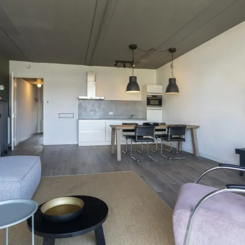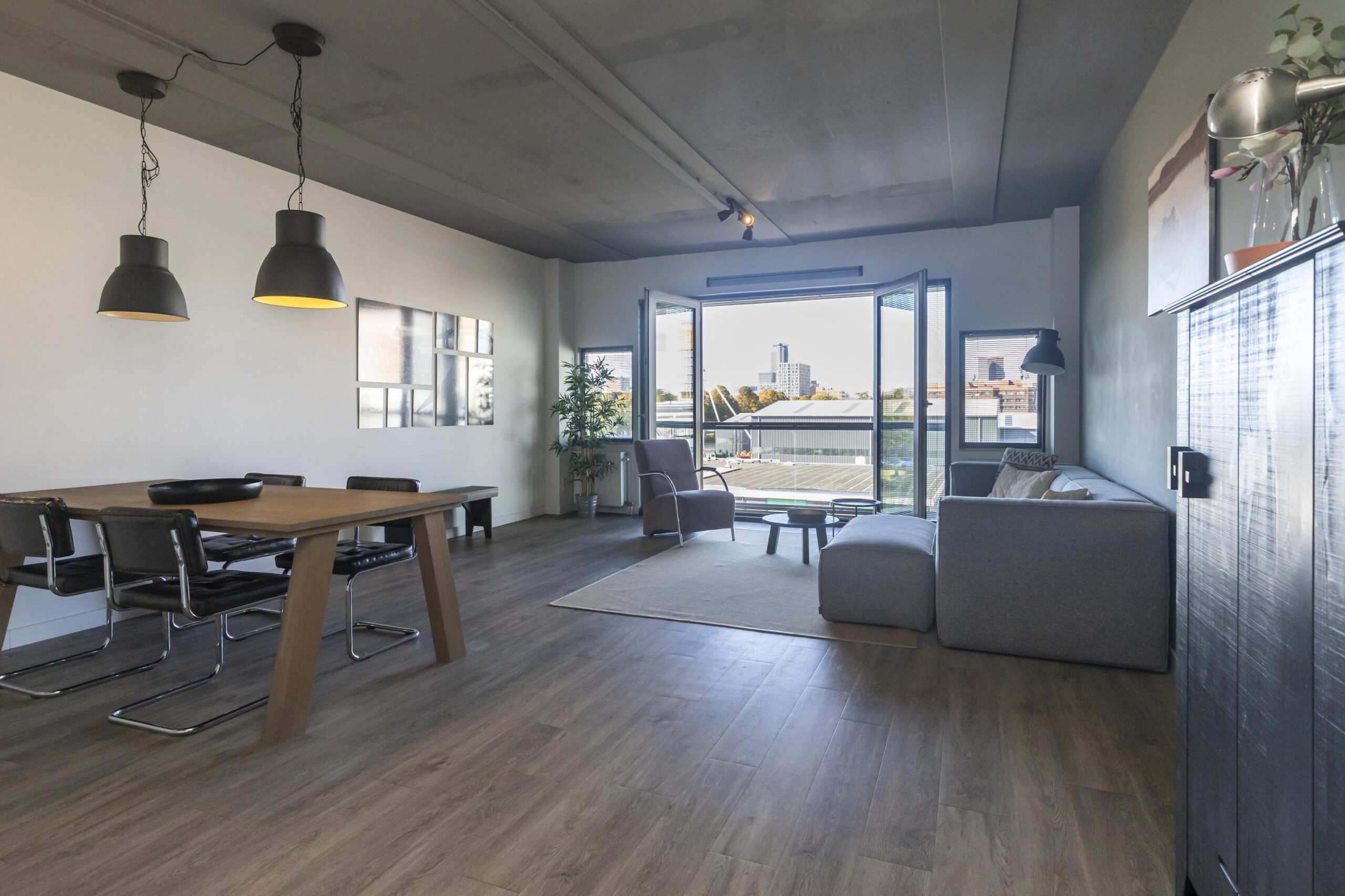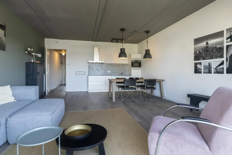 De modern afgewerkte badkamer is betegeld tot aan het plafond en uitgerust met een inloopdouche, wastafel, handdoekradiator en toilet. De lichte woonkamer biedt dankzij grote raampartijen veel daglicht en een prachtig uitzicht over de Trekvliet en de skyline van Den Haag. De keuken is voorzien van diverse inbouwapparatuur, waaronder een 4-pits inductiekookplaat, koelkast met vriesvak, combi oven en een recirculatie afzuigkap.
