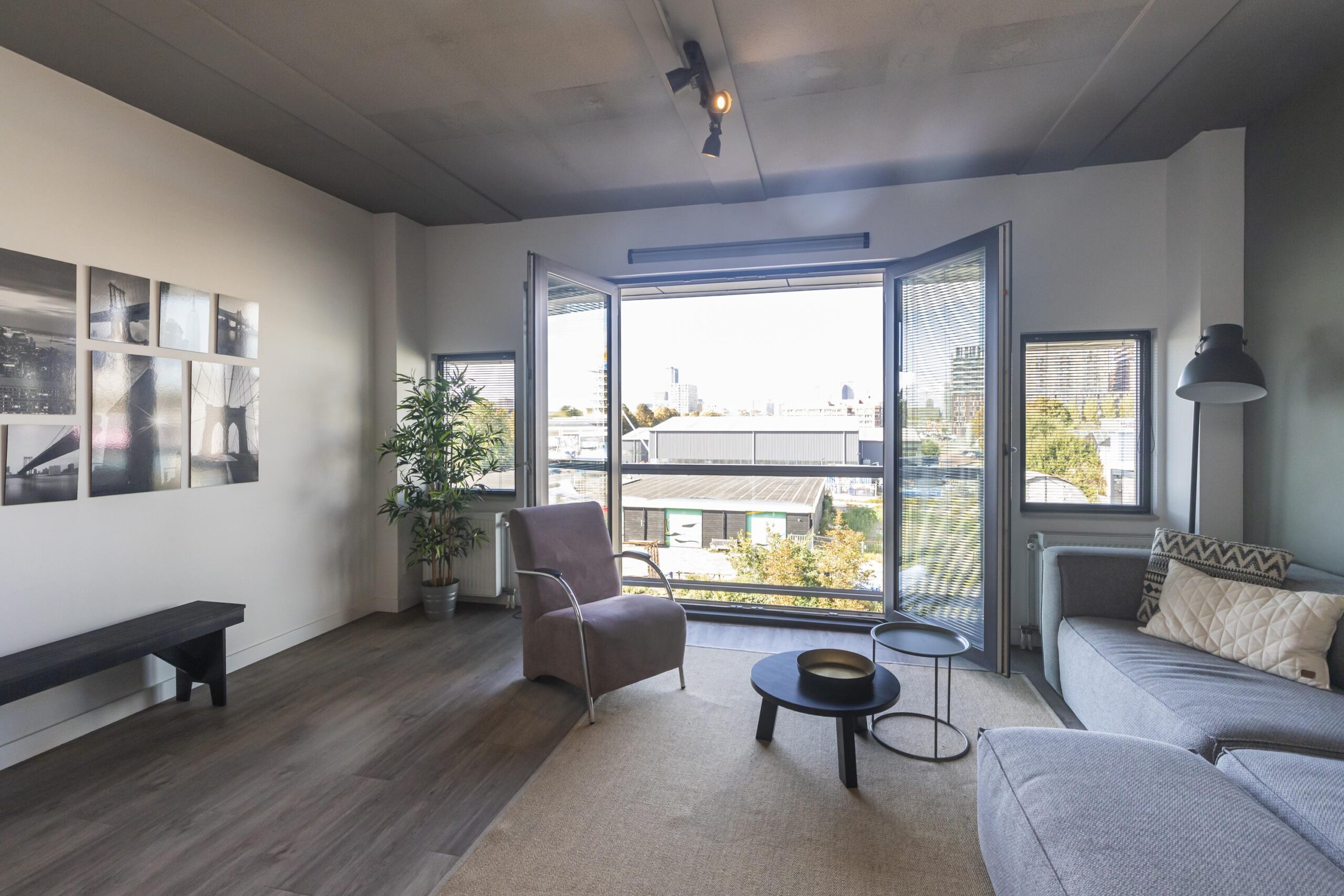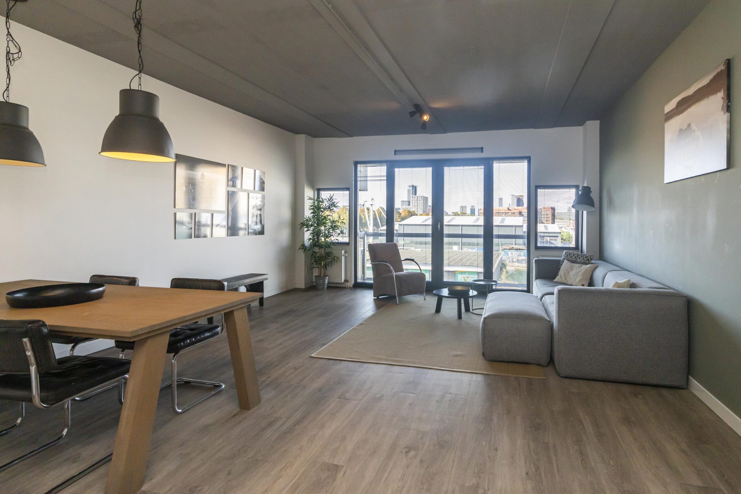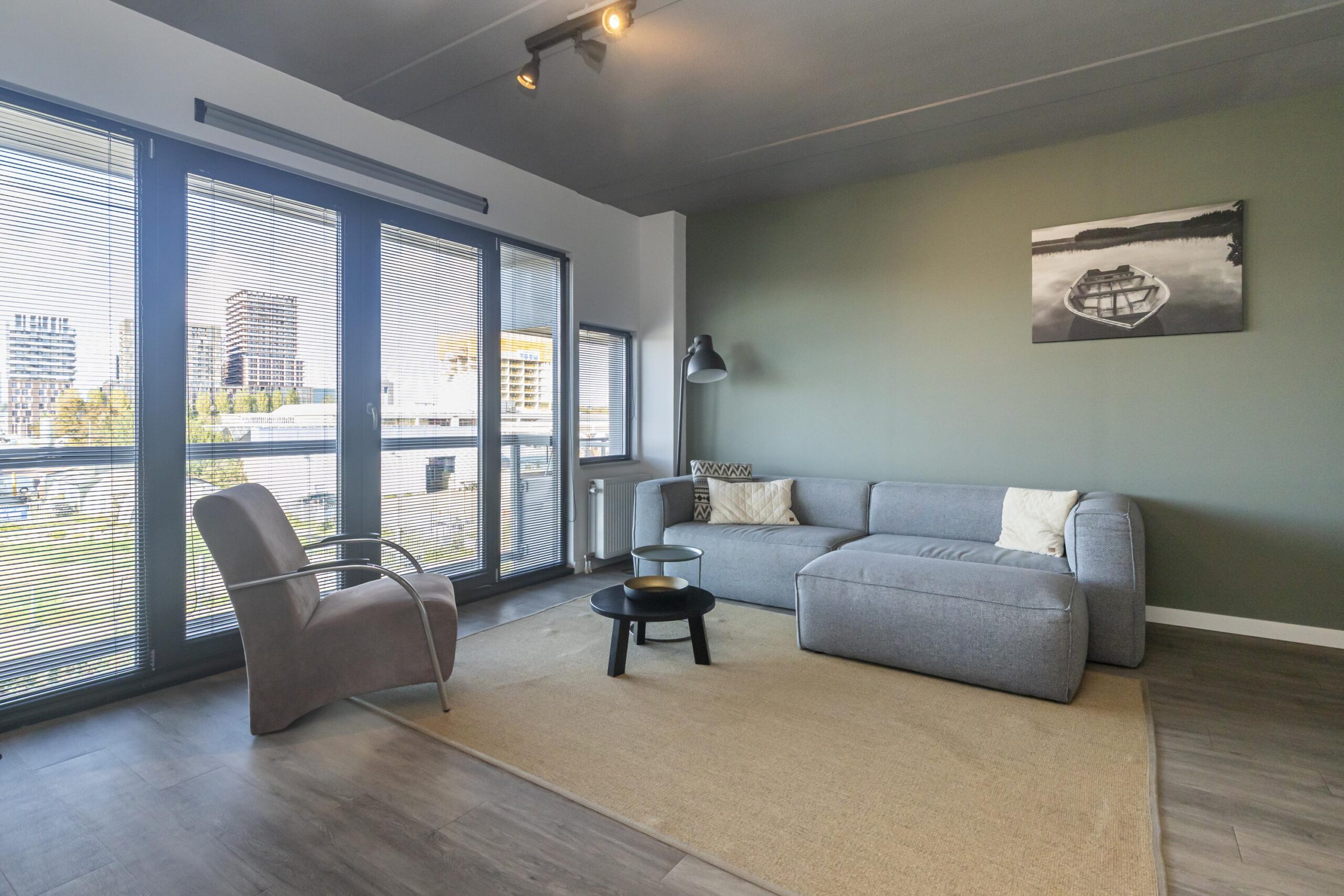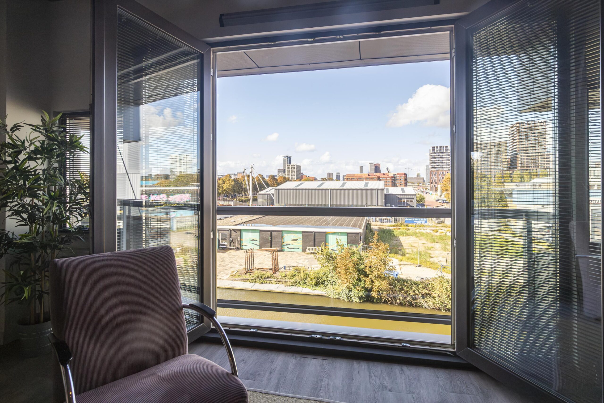 - Lichte woonkamer met grote raampartijen en uitzicht over de Trekvliet