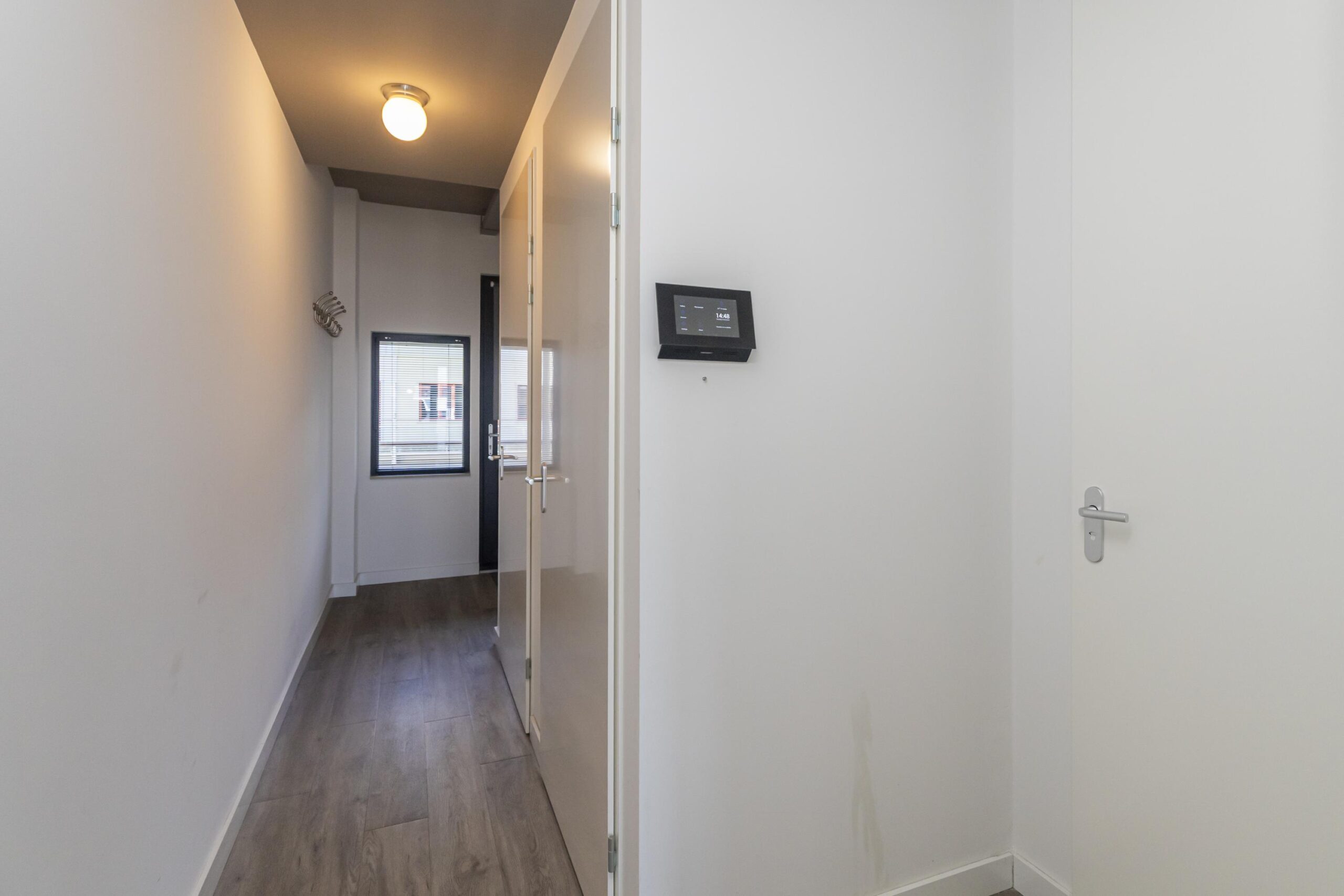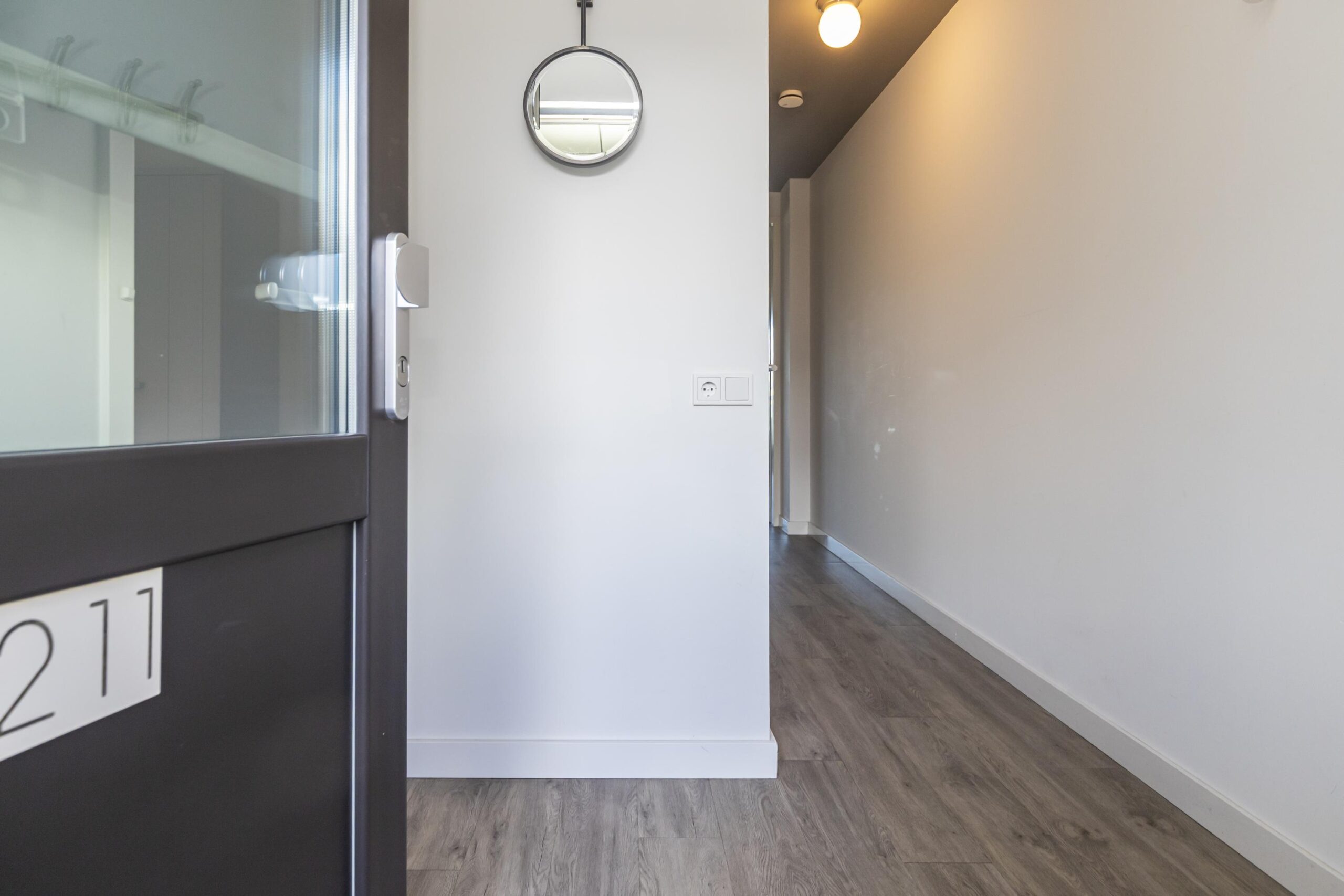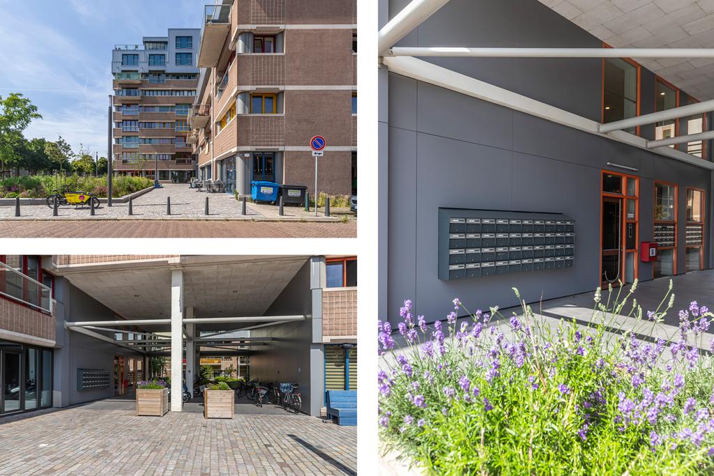 Bij binnenkomst via de gezamenlijke, afgesloten entree bereik je de tweede verdieping met trap of lift. De galerij leidt je naar de voordeur van de woning, waar de hal toegang biedt tot alle vertrekken. Aan de voorzijde bevindt zich een ruime slaapkamer met internetaansluiting. De inpandige berging herbergt de aansluitingen voor de wasmachine en de mechanische ventilatie unit. Daarnaast vind je hier ook de meterkast met stadsverwarming unit en groepenkast.