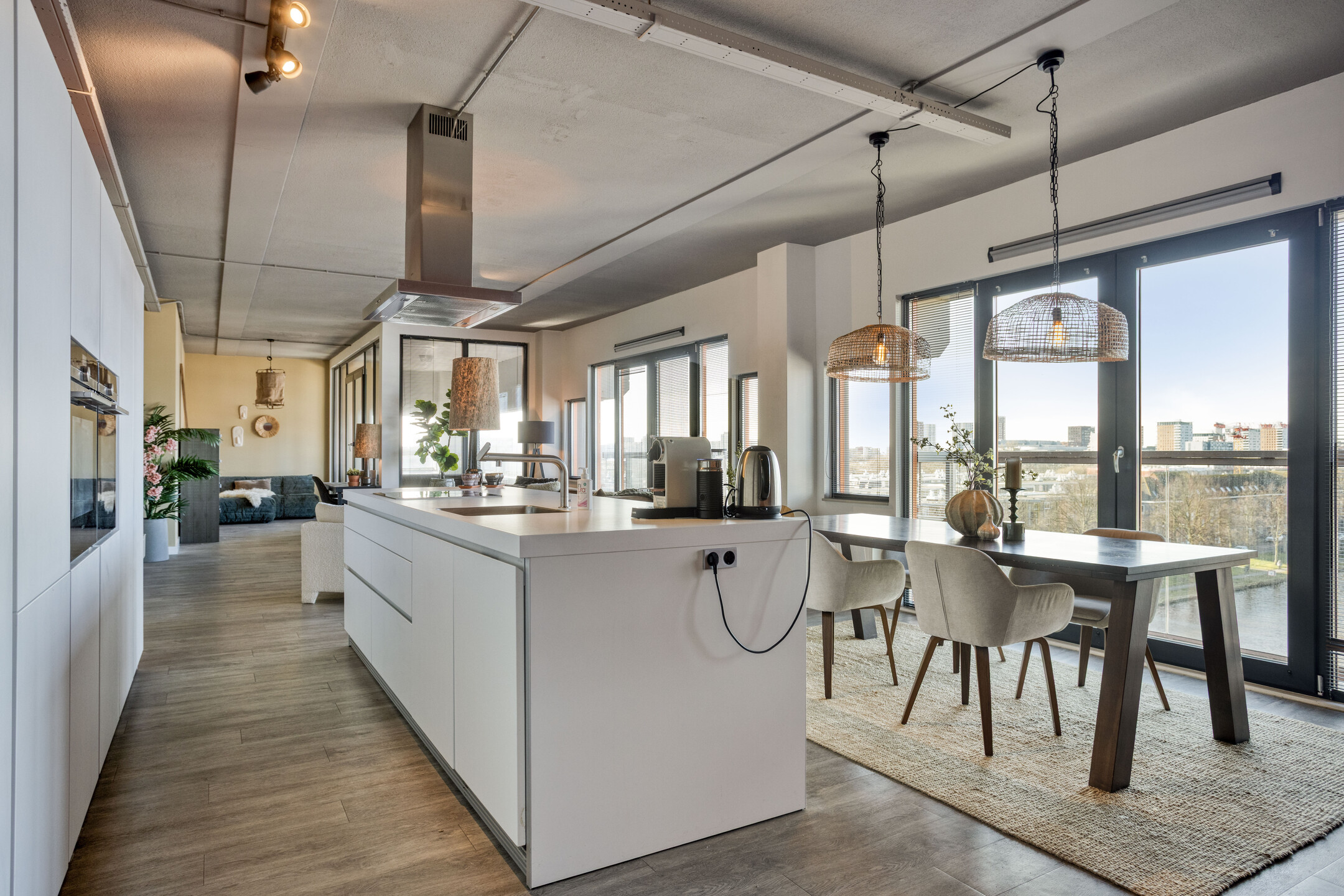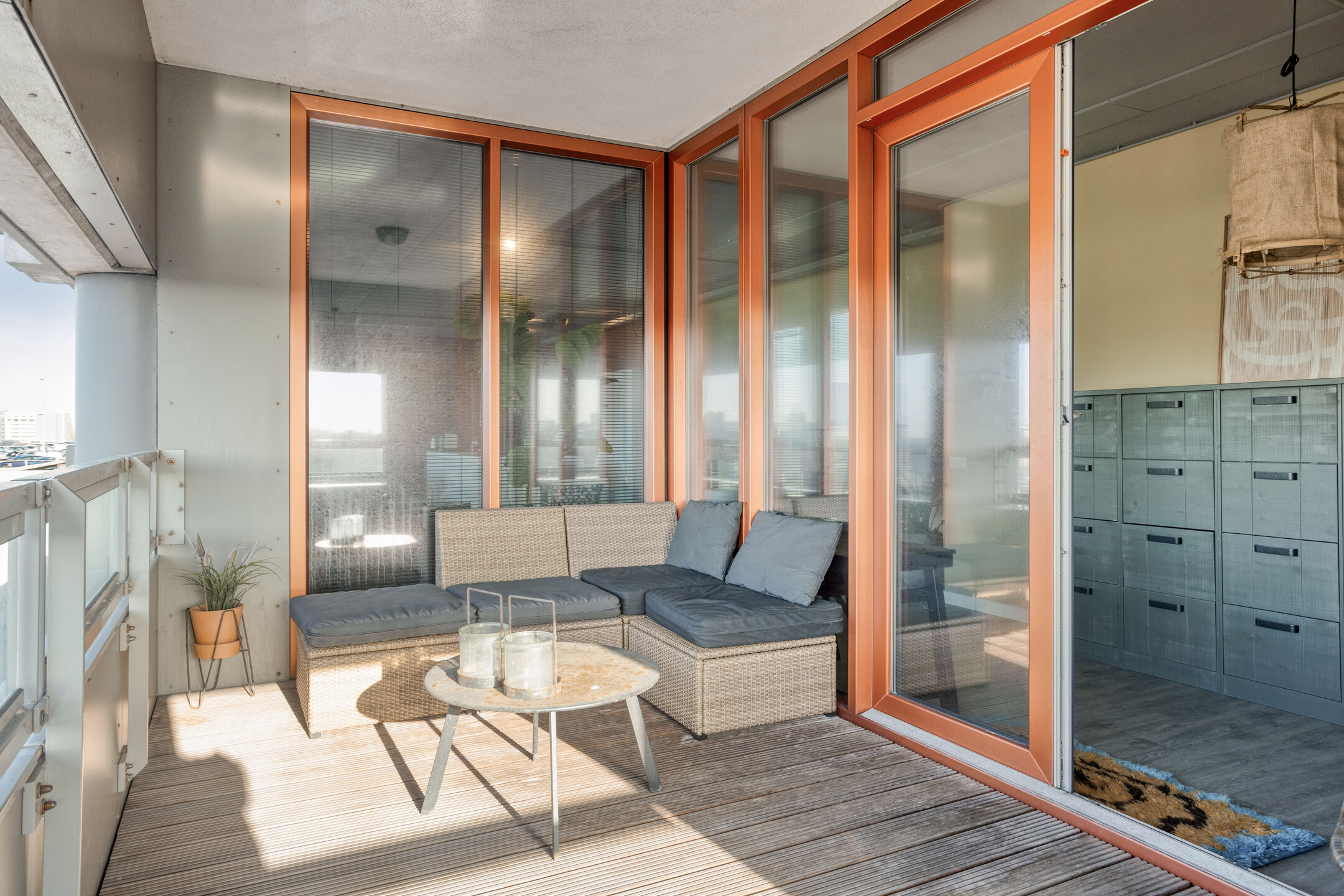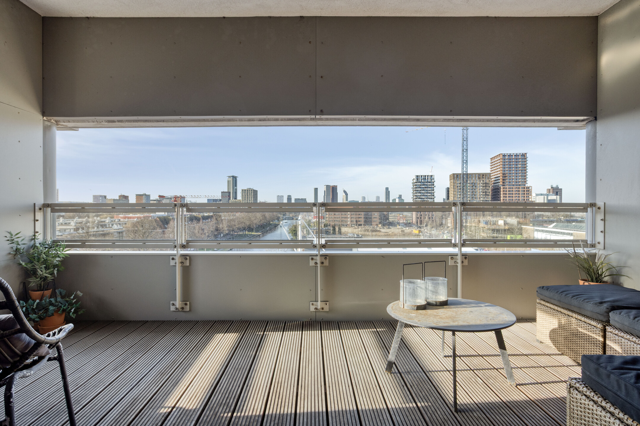 Via twee openslaande deuren bereik je de op het noordwesten gelegen loggia met een fraai uitzicht over de historische Trekvliet. Een heerlijke plek om buiten te zitten en te genieten van het water en de omgeving.