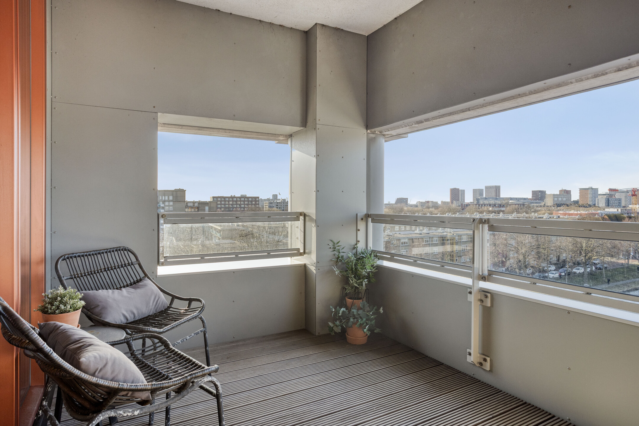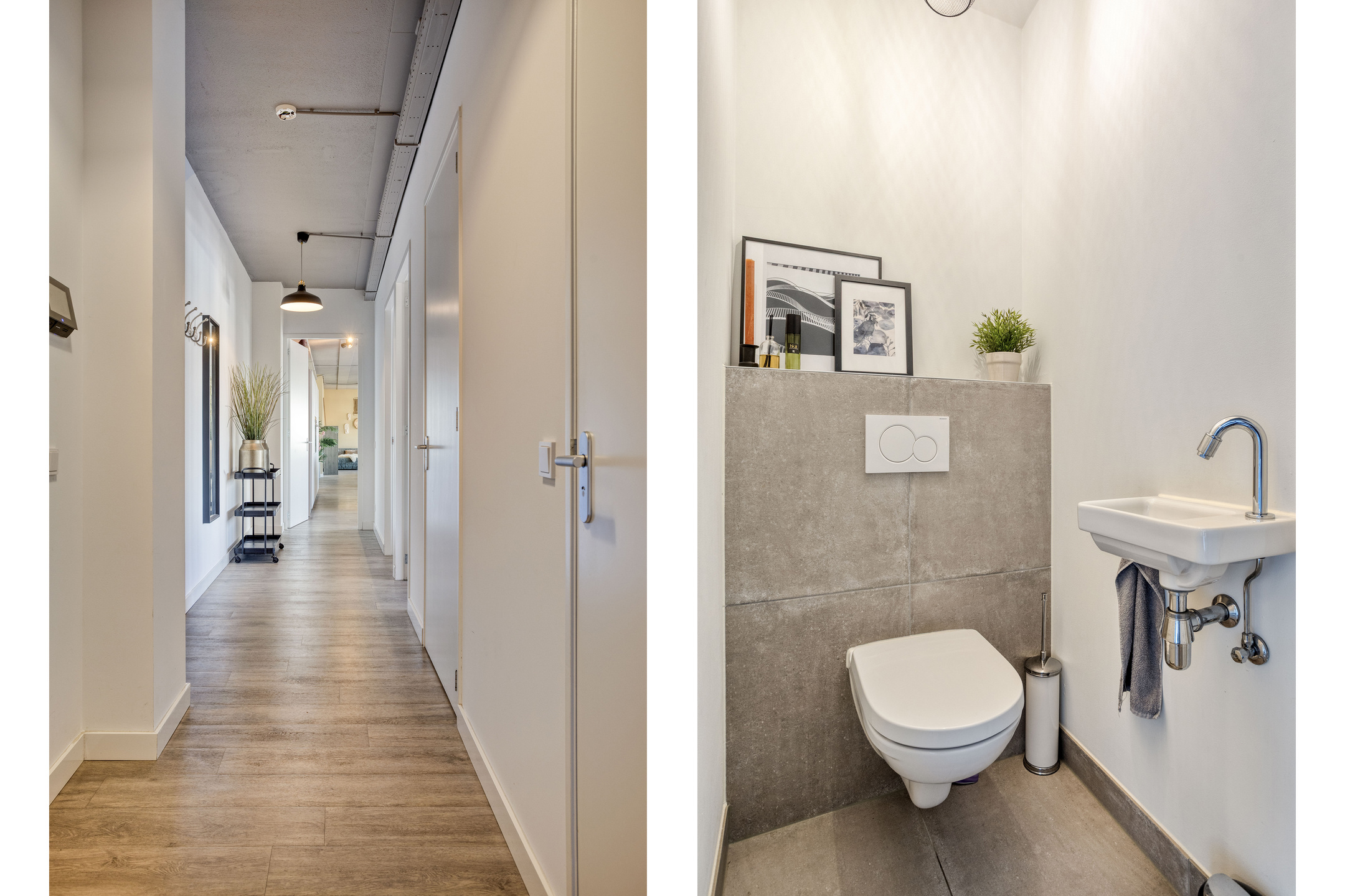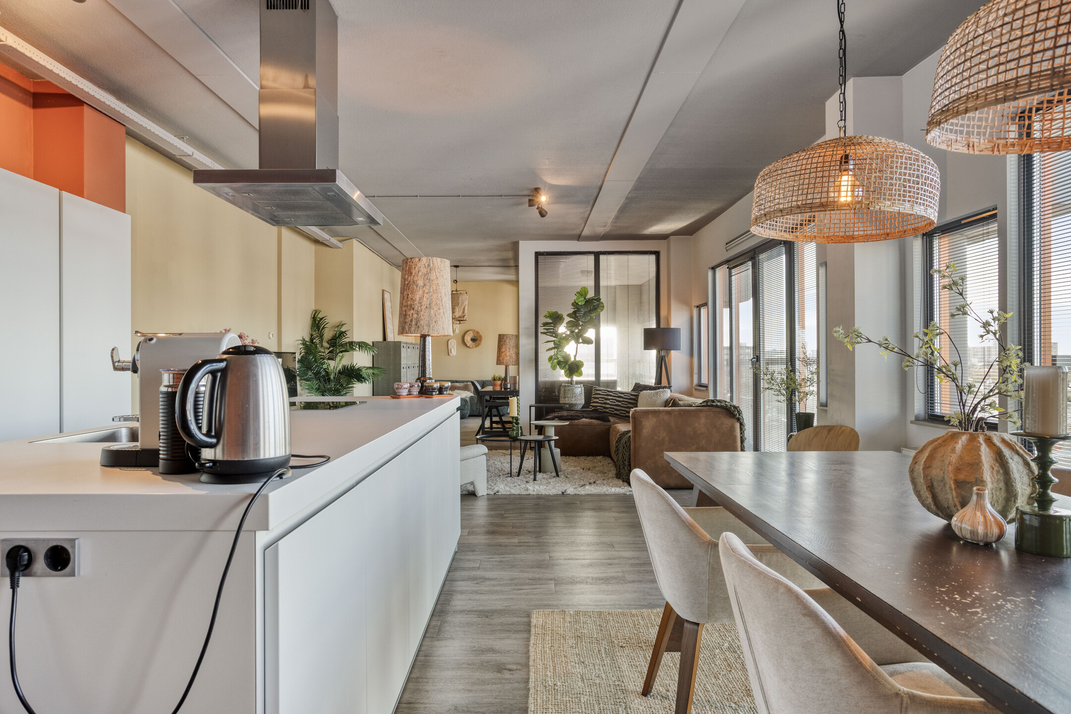 Via twee openslaande deuren bereik je de op het noordwesten gelegen loggia met een fraai uitzicht over de historische Trekvliet. Een heerlijke plek om buiten te zitten en te genieten van het water en de omgeving.