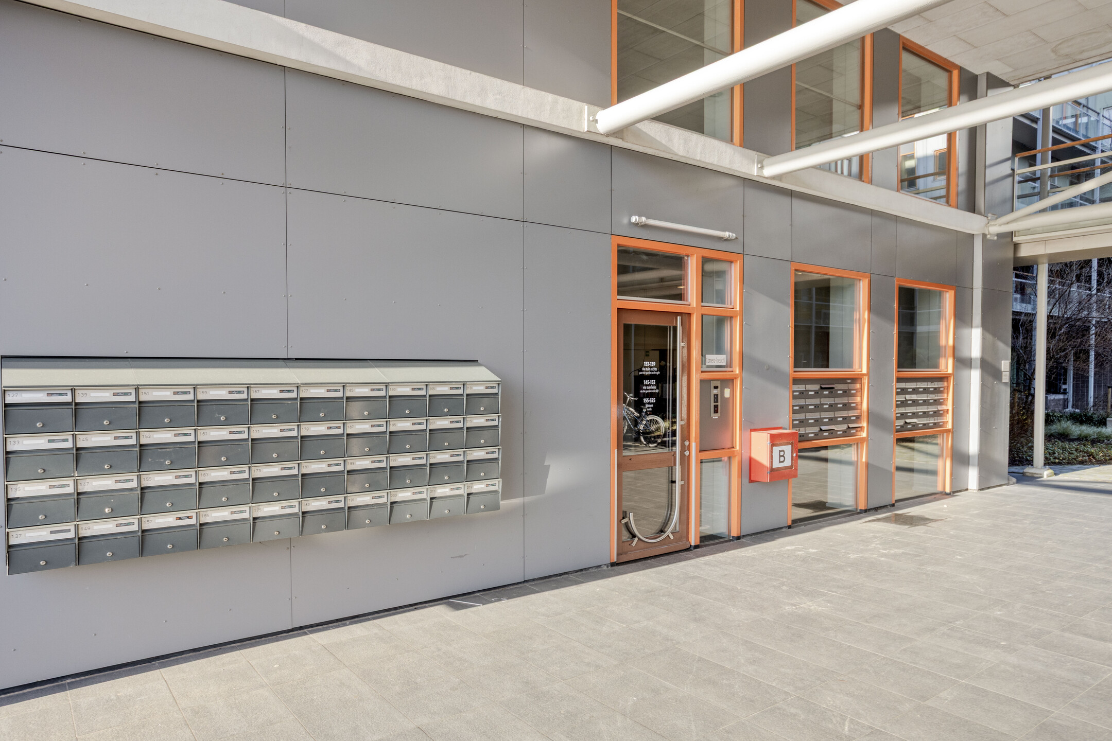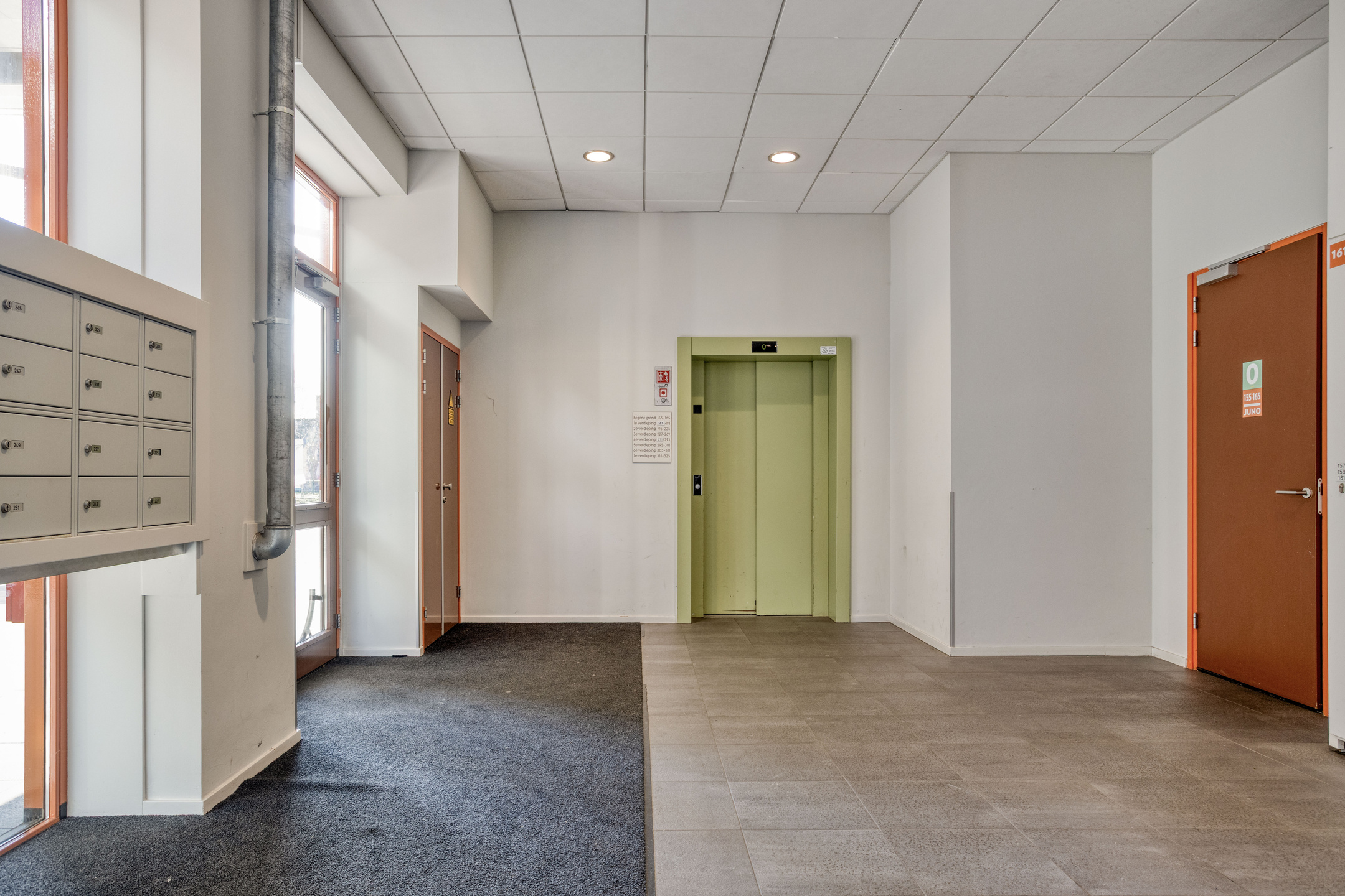 Bij binnenkomst via de gezamenlijke, afgesloten entree bereik je de vijfde verdieping middels trap of lift. De voordeur bevindt zich in een rustige portiek met één andere voordeur.
