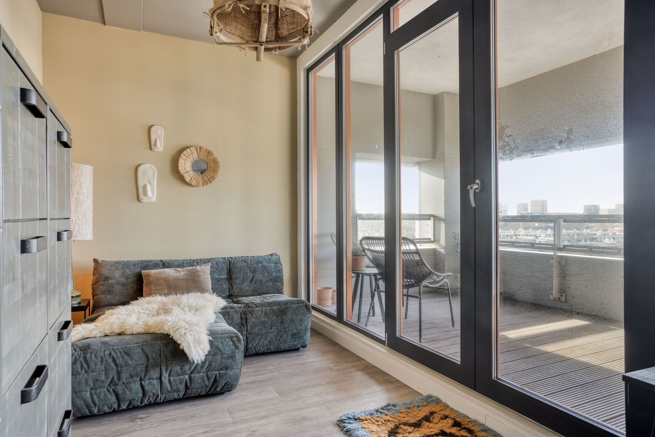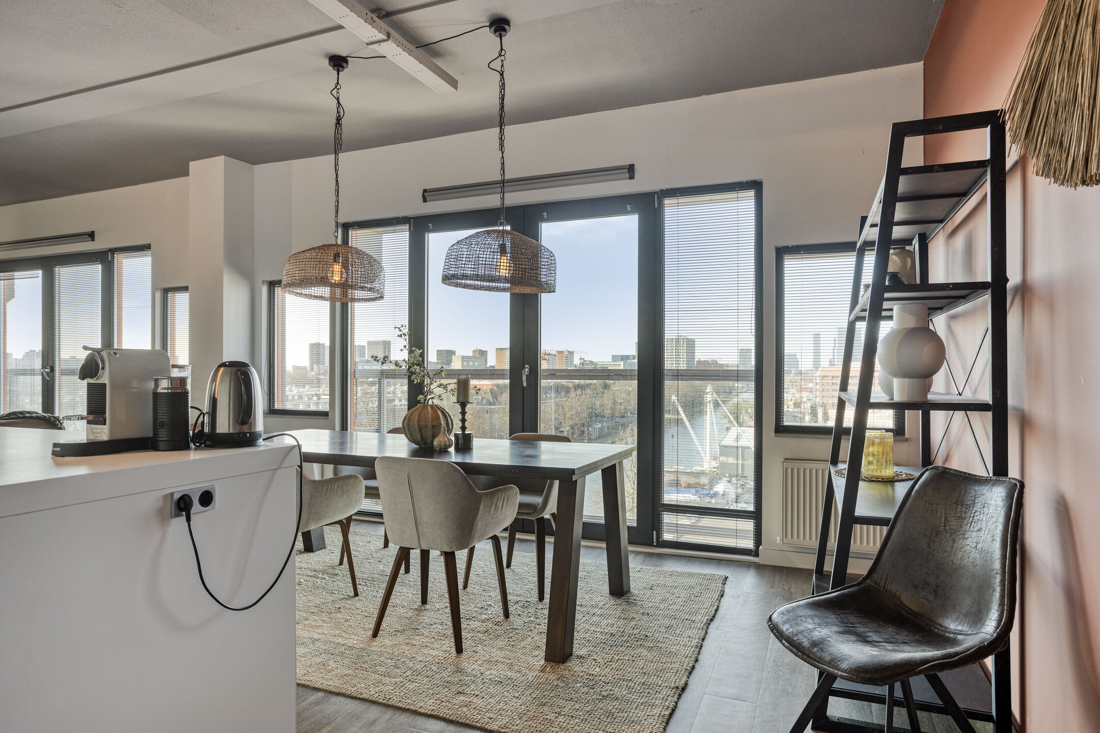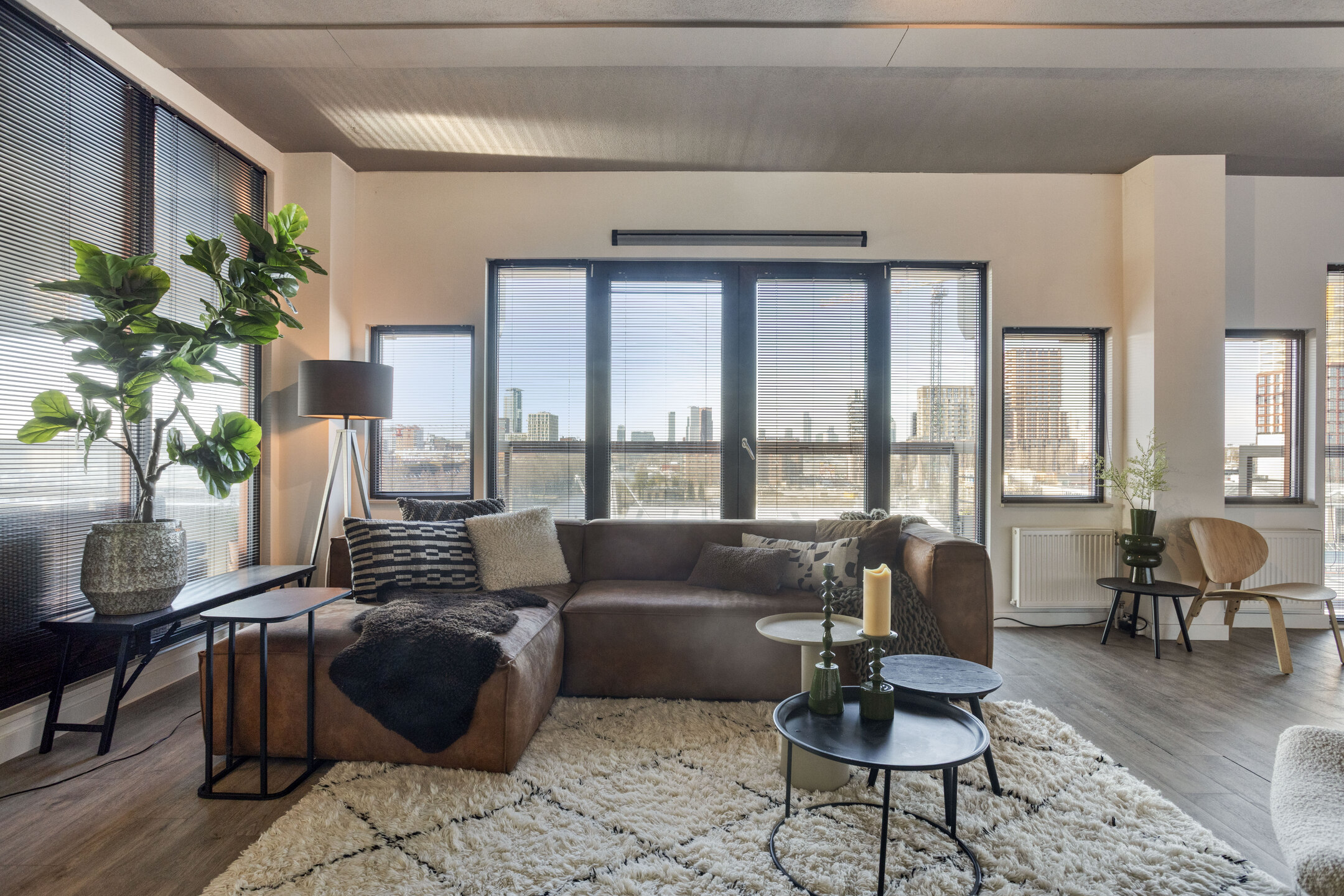 - Lichte woonkamer met grote raampartijen en uitzicht over de Trekvliet
