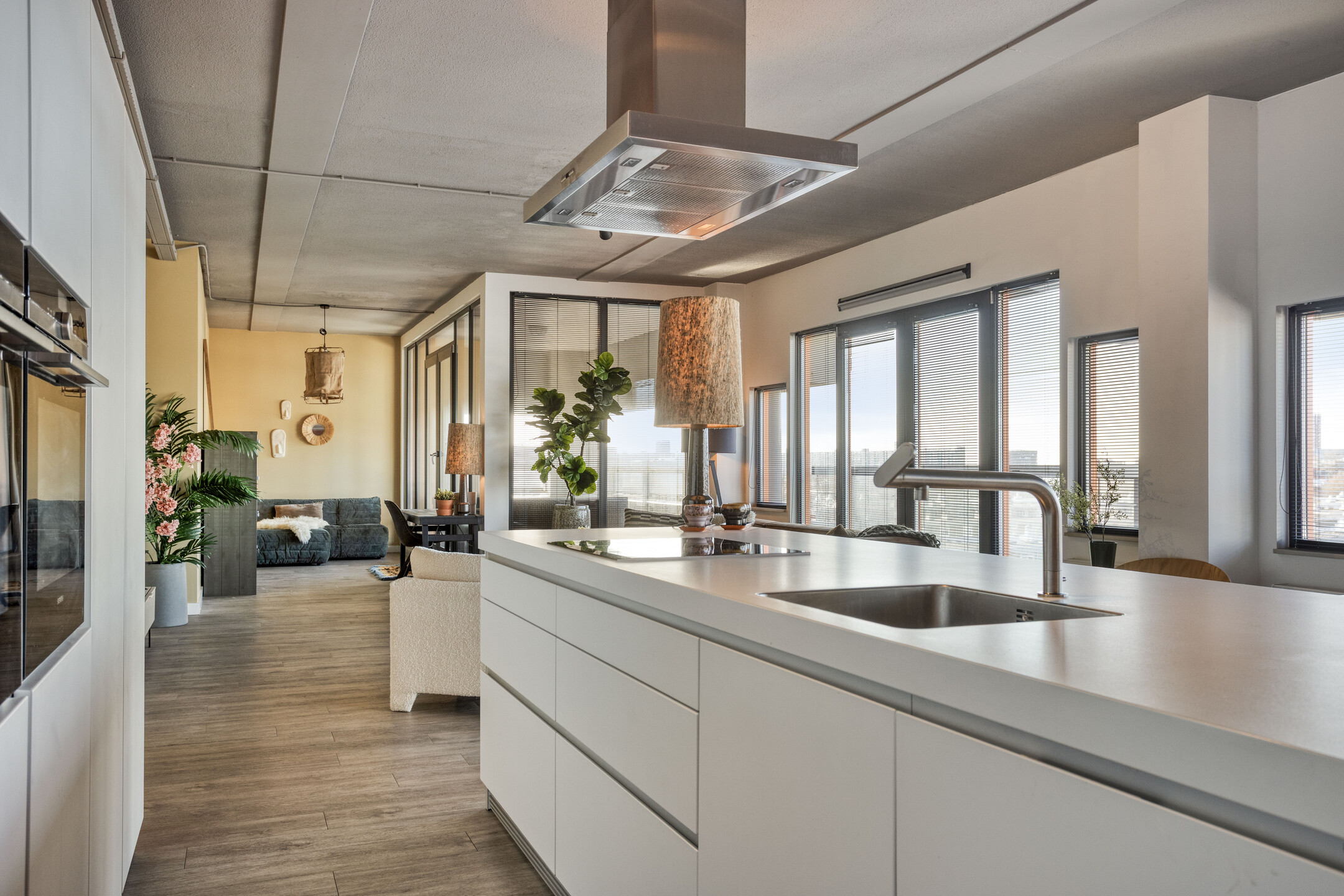 De luxe Bulthaup keuken met kookeiland vormt het hart van de leefruimte. De keuken is uitgerust met hoogwaardige Siemens inbouwapparatuur, waaronder een 4-pits inductiekookplaat, recirculatieafzuigkap, stoomoven, combi oven-magnetron, koel-/vriescombinatie en vaatwasmachine.