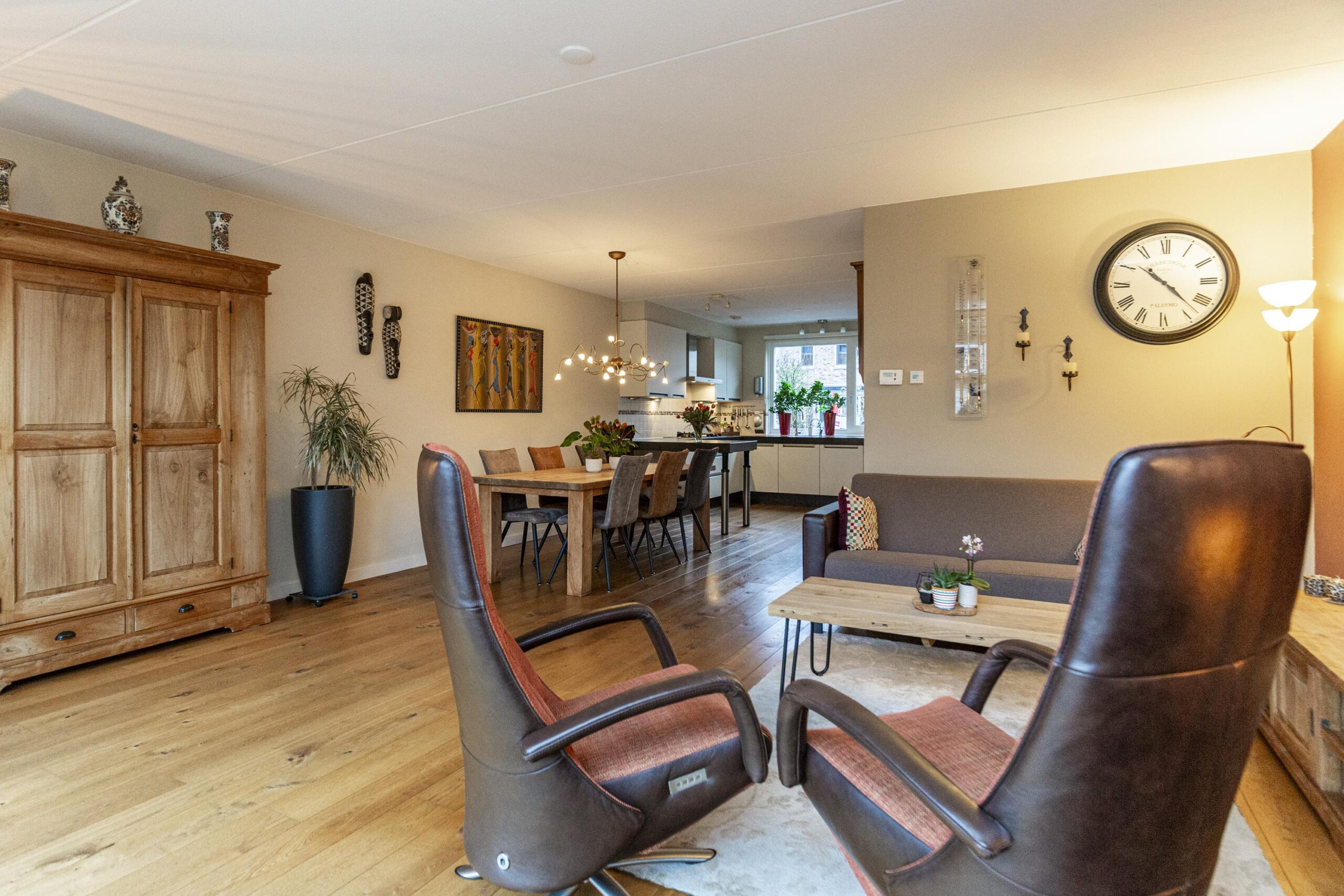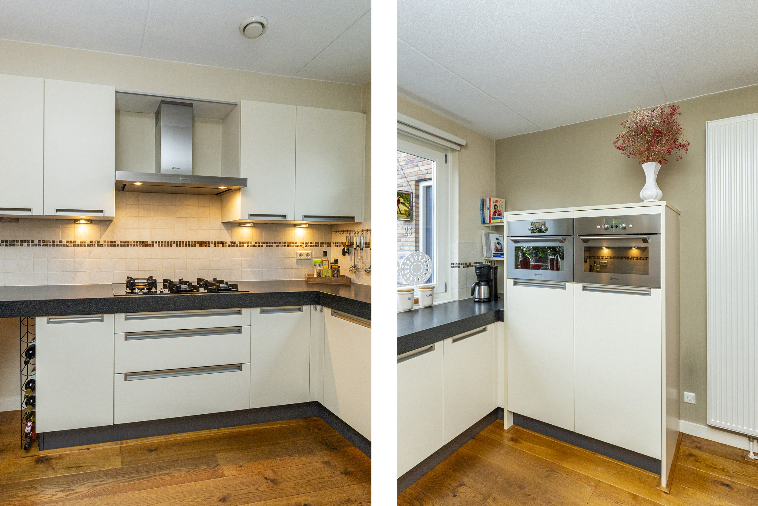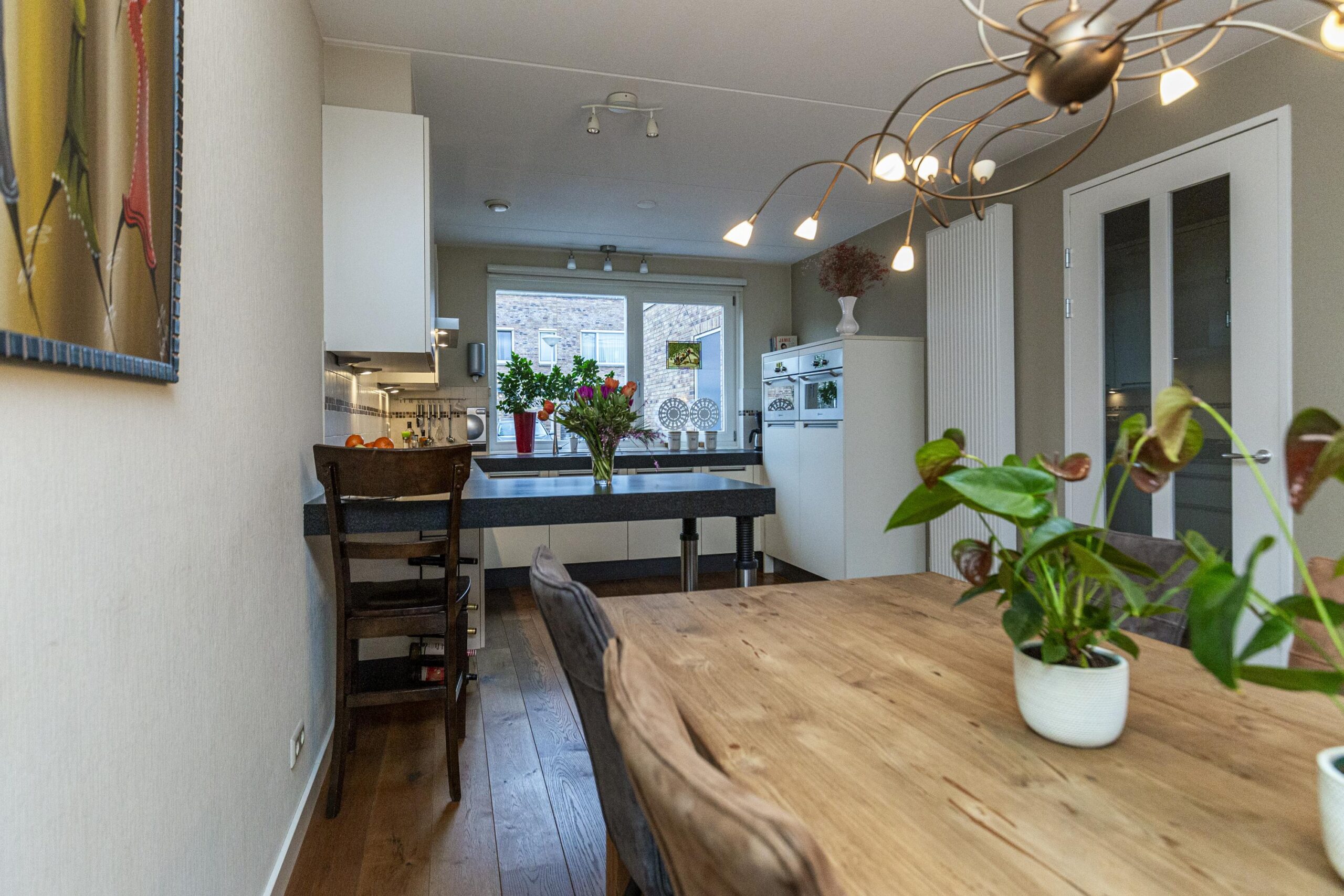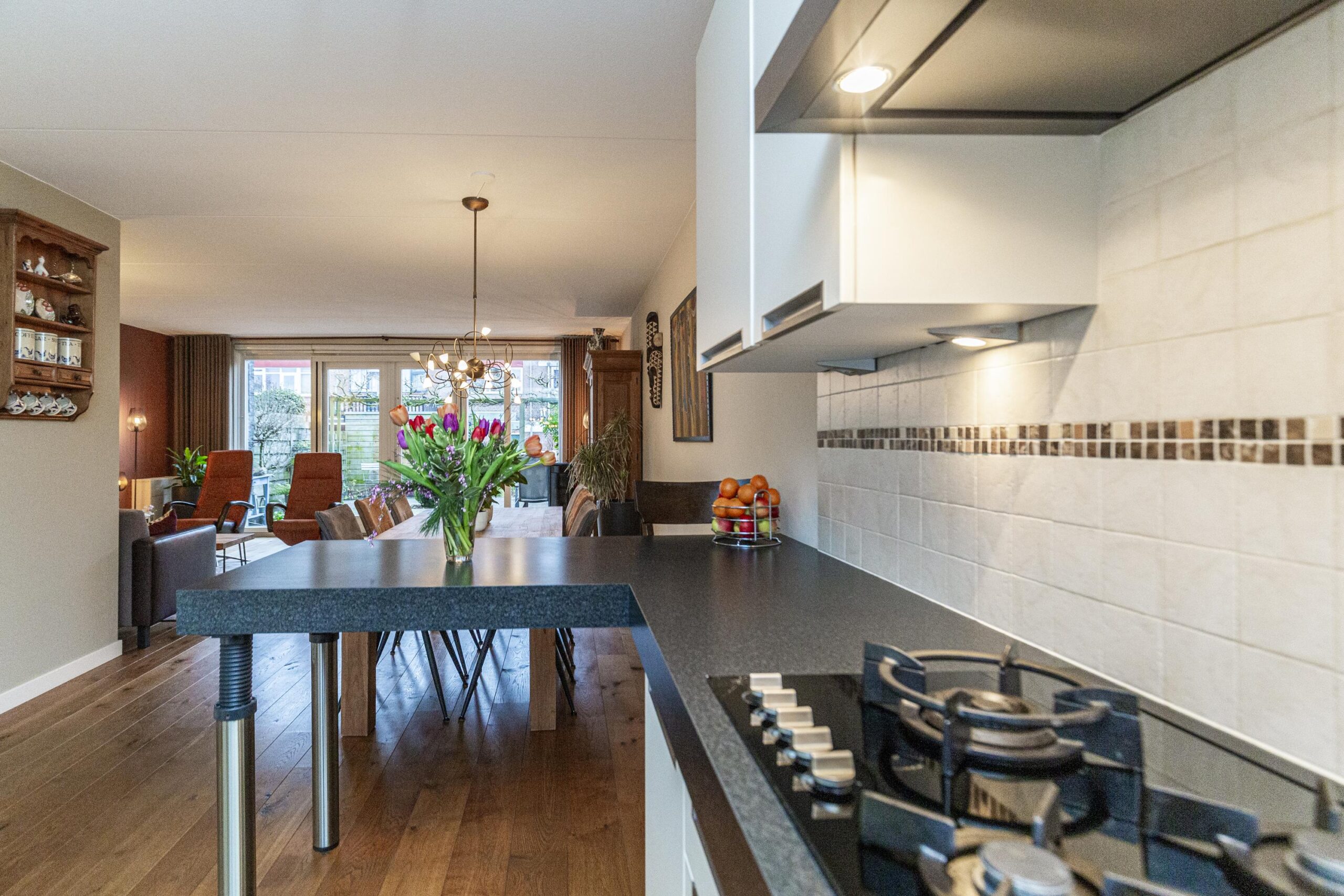 Via de hal met toilet, meterkast en trap naar de eerste verdieping, kom je in de ruime woonkamer. De gehele begane grond beschikt over een massief eiken vloer, wat direct een warme uitstraling geeft. Aan de voorzijde bevindt zich de nette keuken, uitgerust met diverse inbouwapparatuur waaronder een gaskookplaat, afzuigkap, oven, combimagnetron, koelkast, vriezer en Quooker.