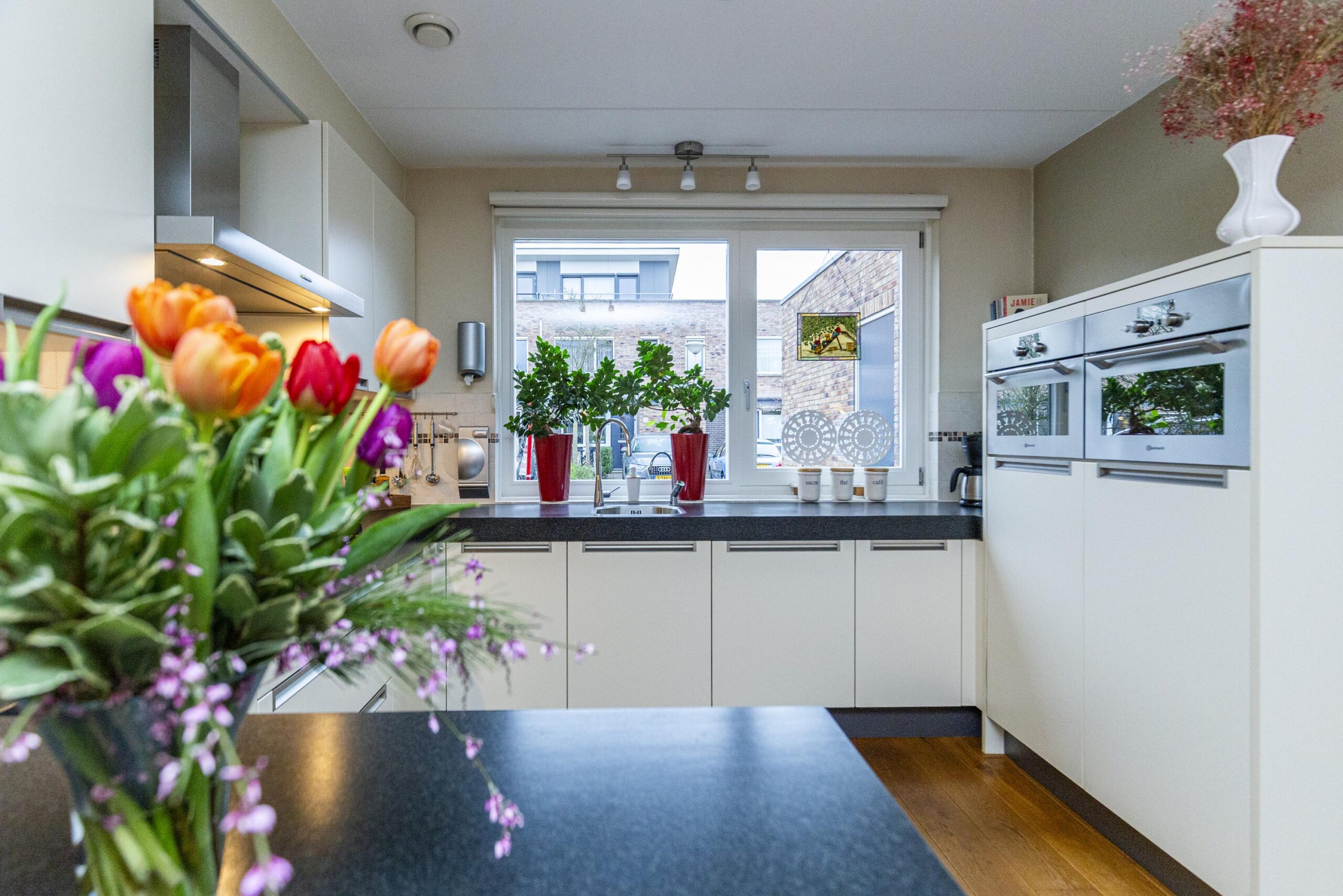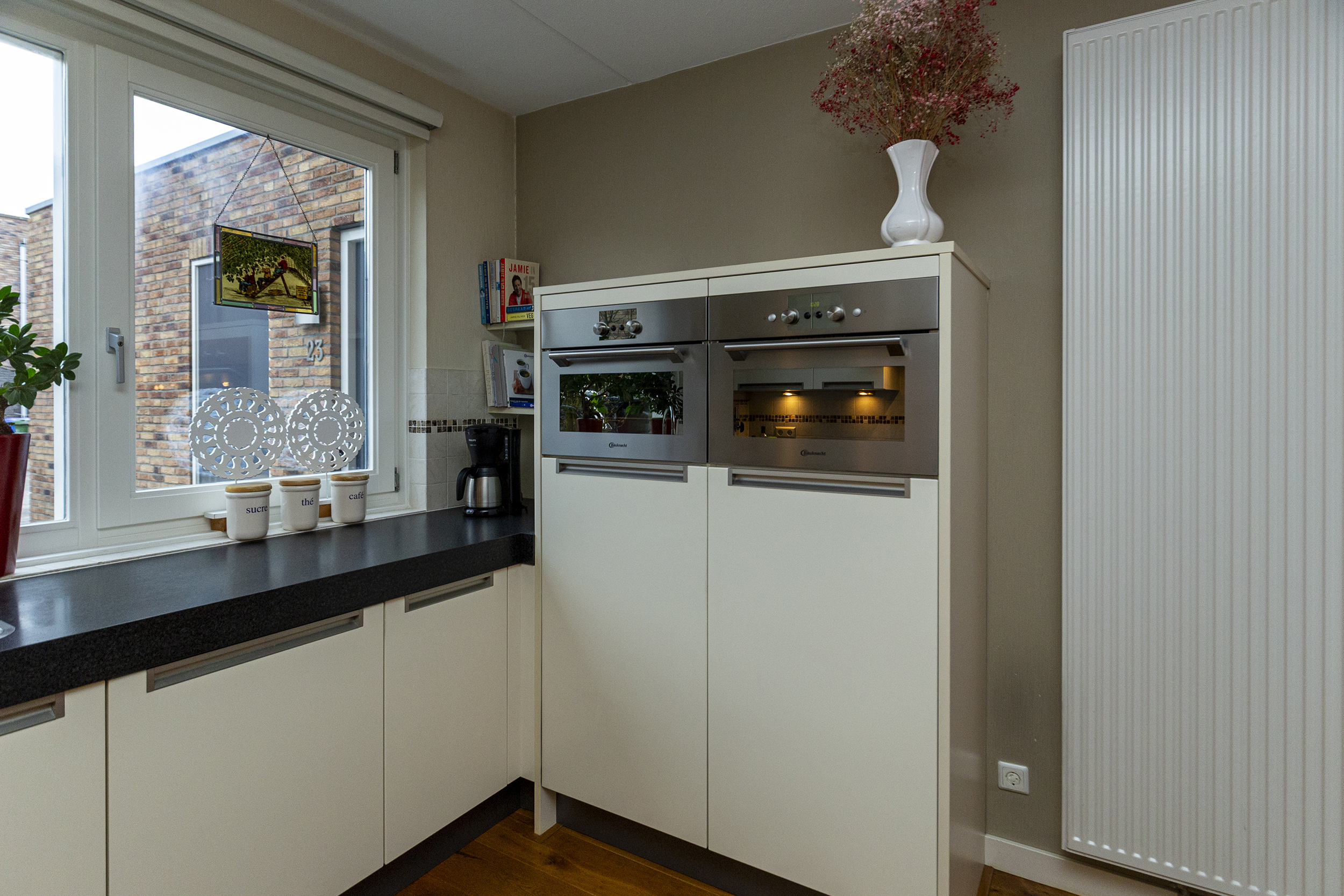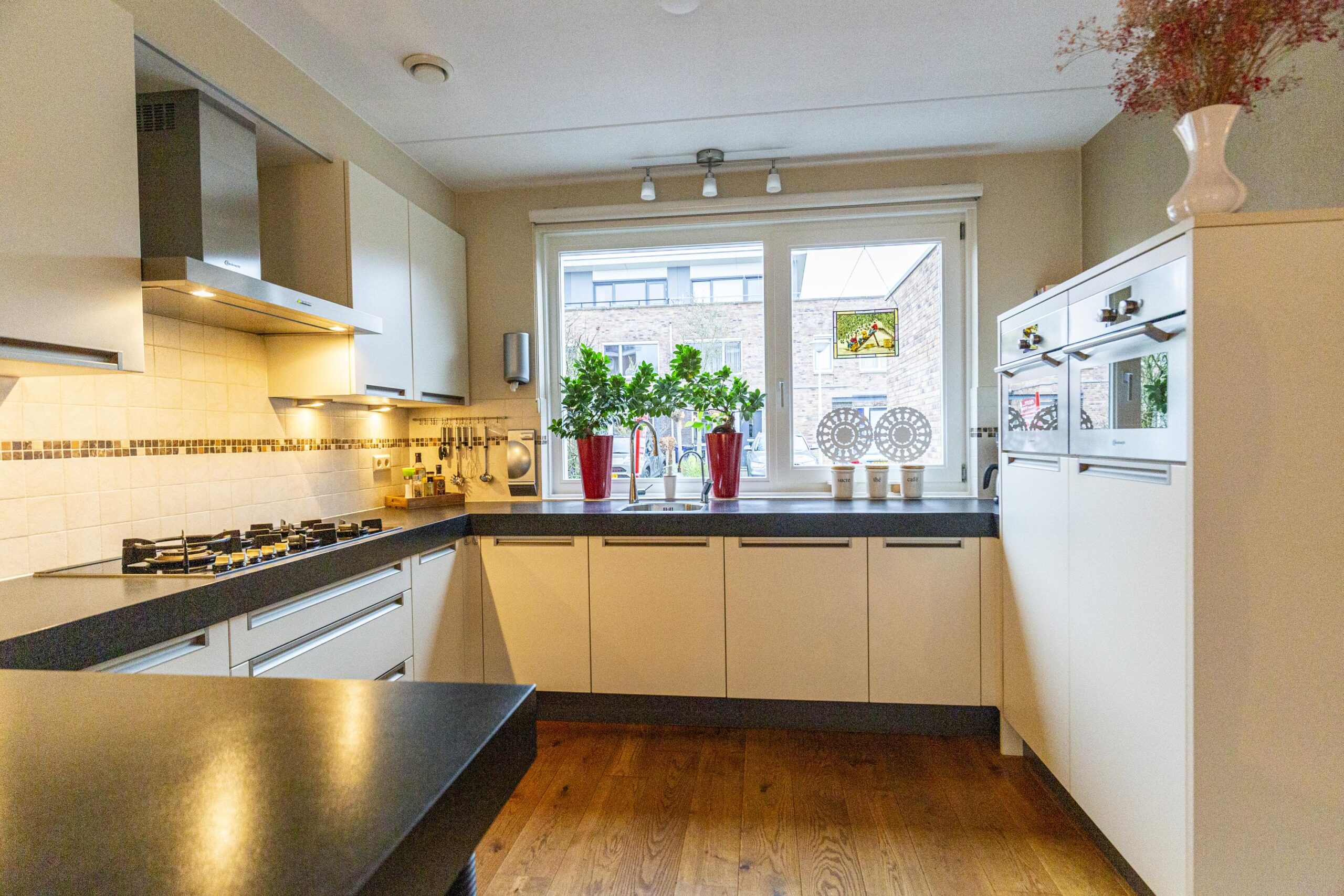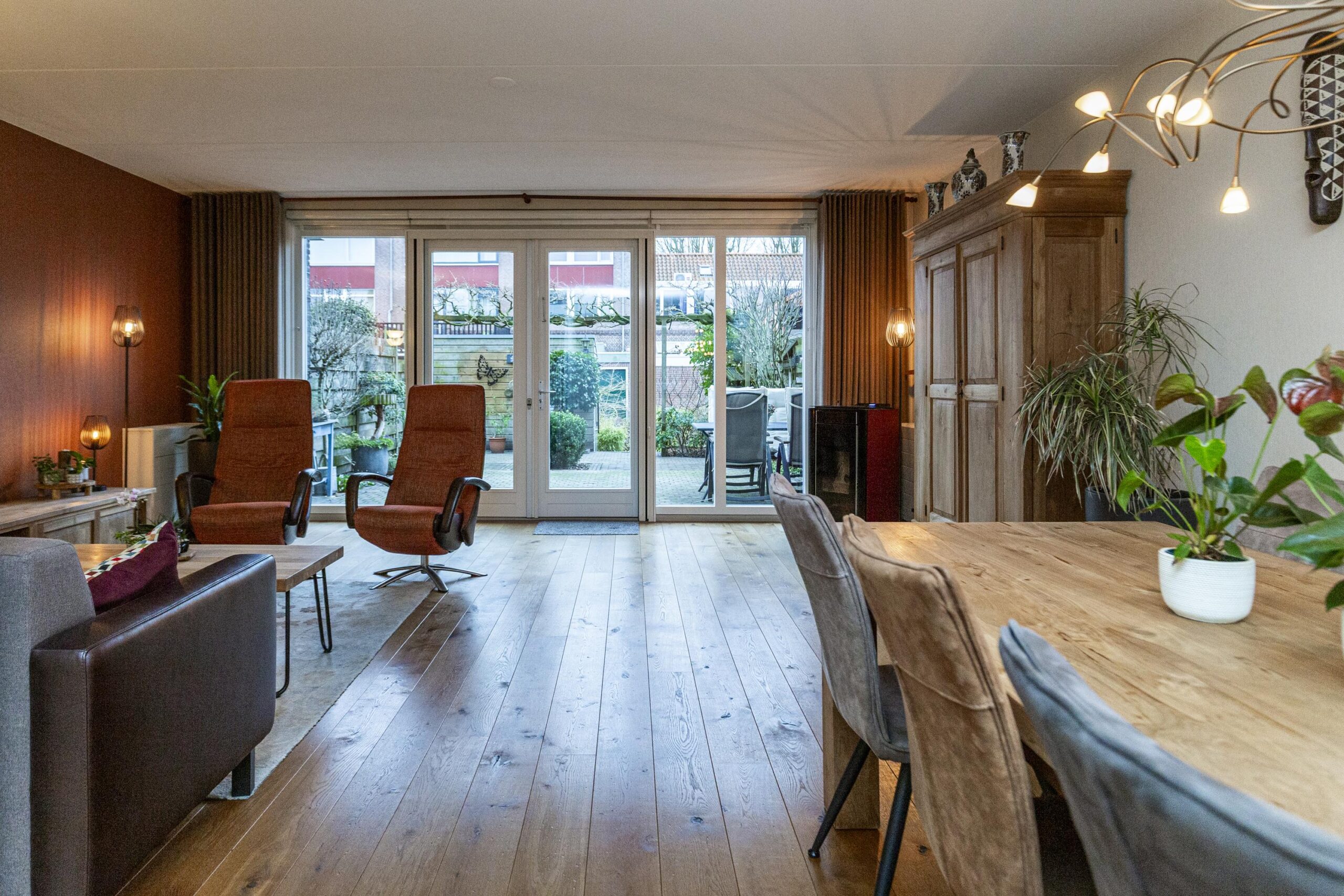Via de hal met toilet, meterkast en trap naar de eerste verdieping, kom je in de ruime woonkamer. De gehele begane grond beschikt over een massief eiken vloer, wat direct een warme uitstraling geeft. Aan de voorzijde bevindt zich de nette keuken, uitgerust met diverse inbouwapparatuur waaronder een gaskookplaat, afzuigkap, oven, combimagnetron, koelkast, vriezer en Quooker.