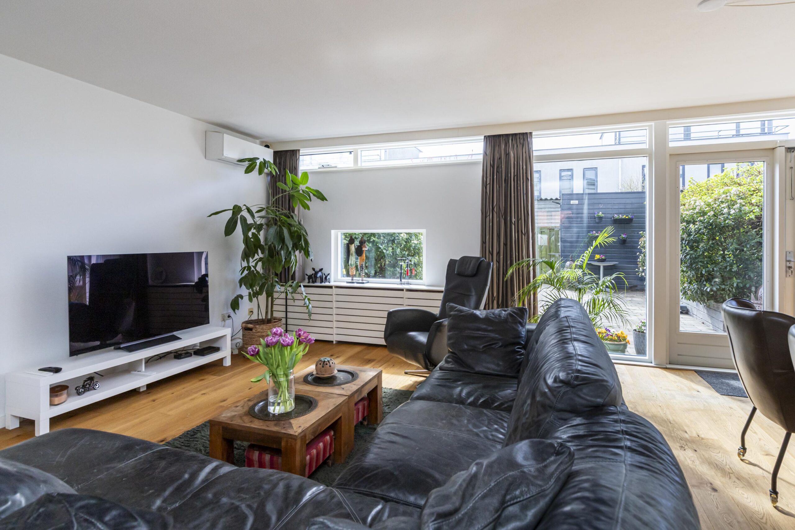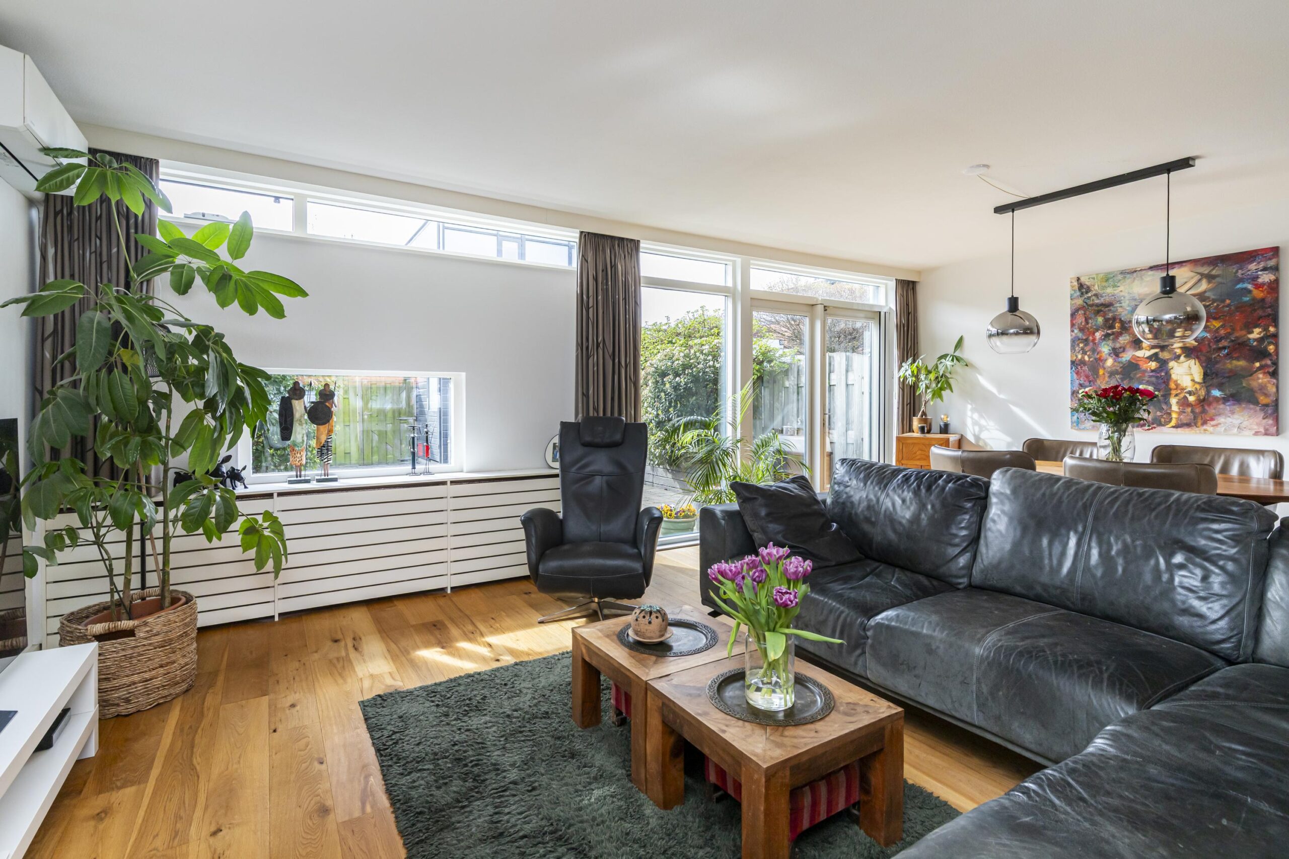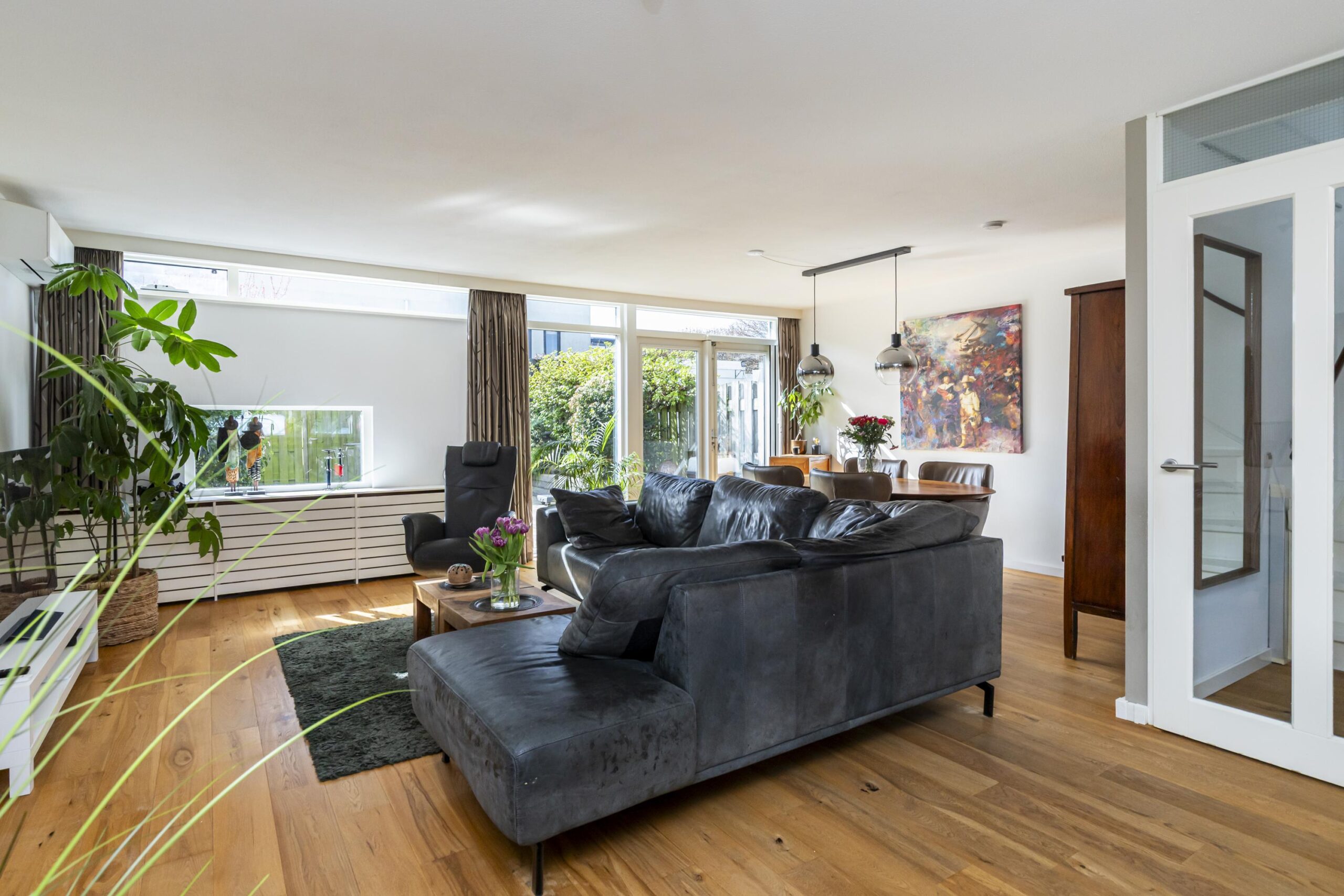 De woon- en eetkamer bevinden zich aan de achterzijde van de woning. Dankzij de grote raampartijen is er veel lichtinval. Via de achterzijde is er toegang tot de tuin. Daarnaast is de begane grond voorzien van airconditioning en een nieuwe buitendeur.