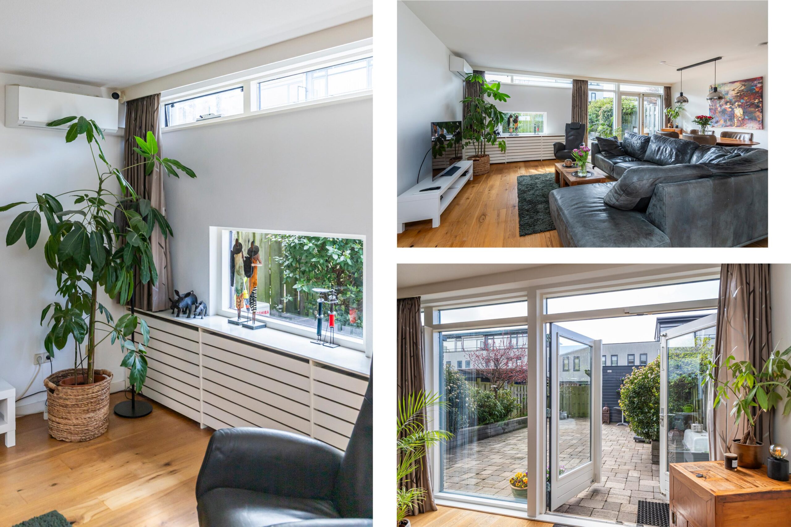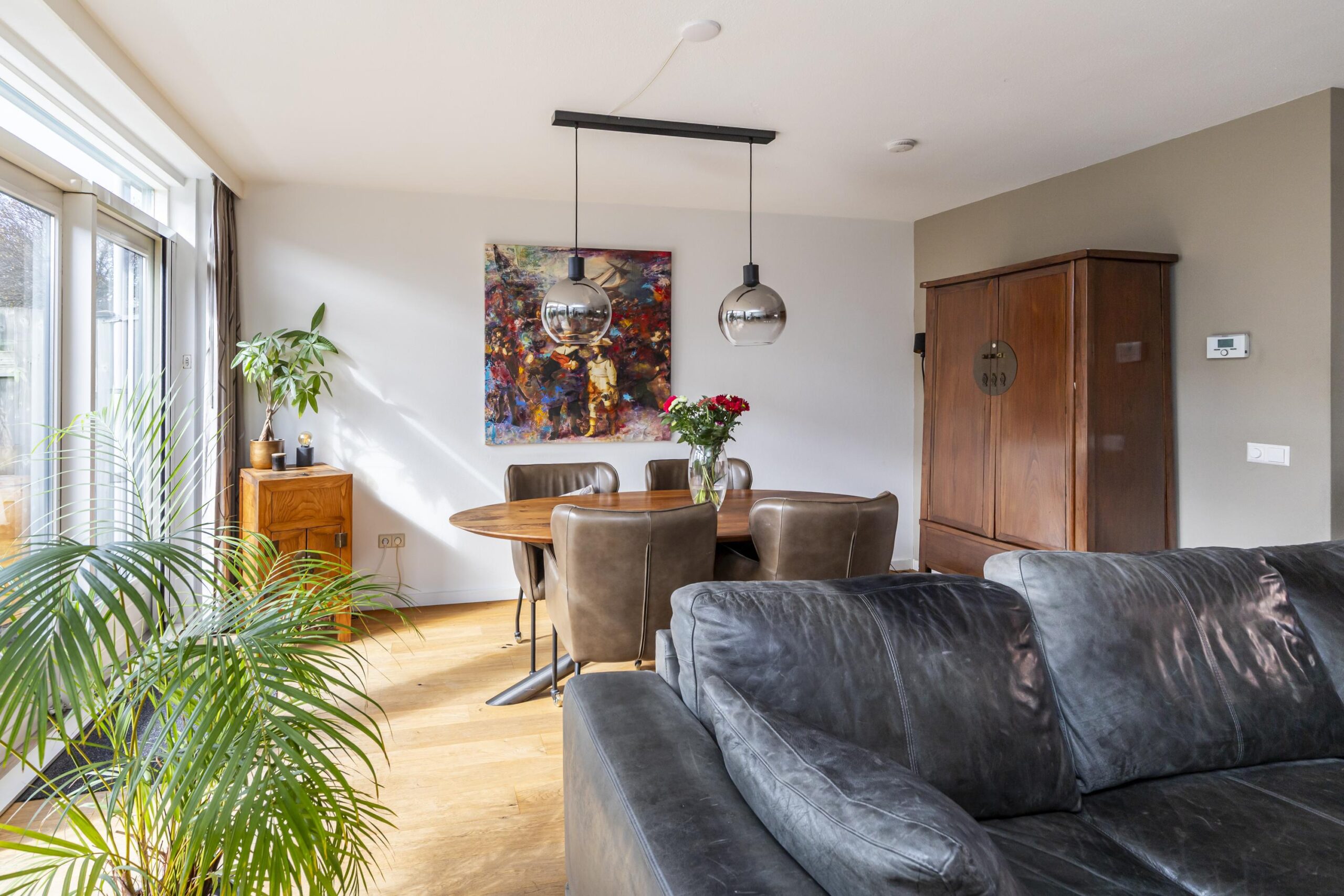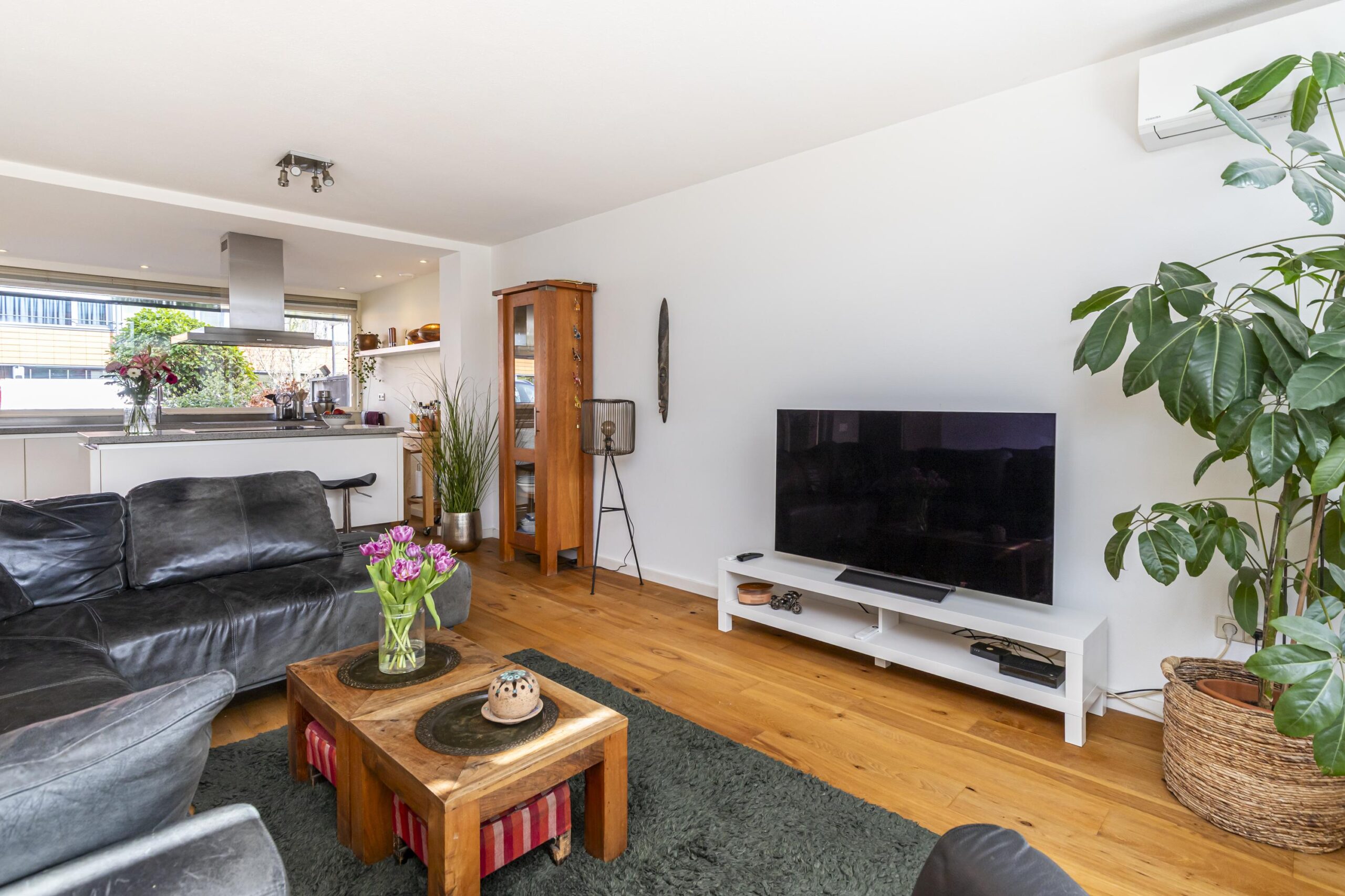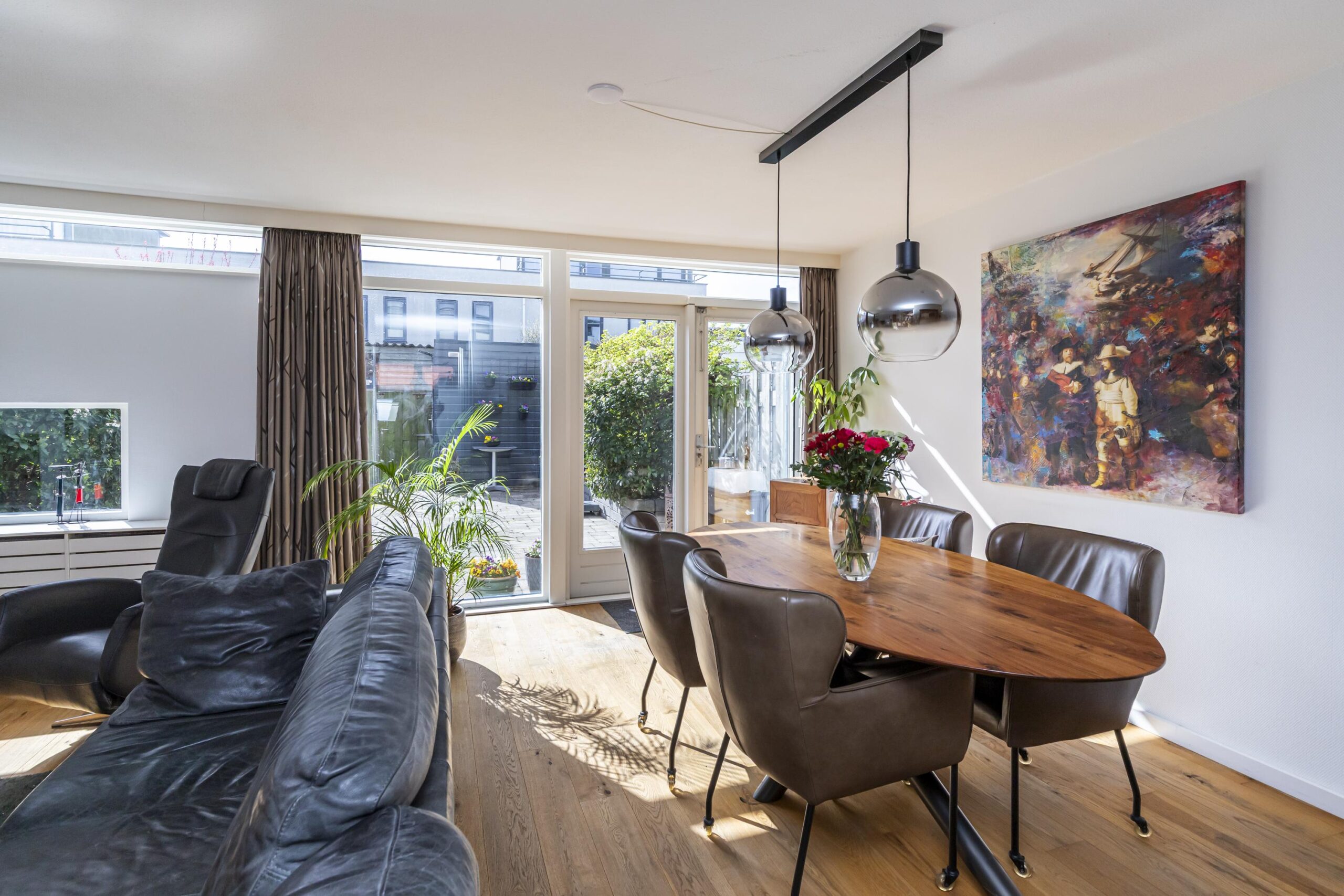 De woon- en eetkamer bevinden zich aan de achterzijde van de woning. Dankzij de grote raampartijen is er veel lichtinval. Via de achterzijde is er toegang tot de tuin. Daarnaast is de begane grond voorzien van airconditioning en een nieuwe buitendeur.