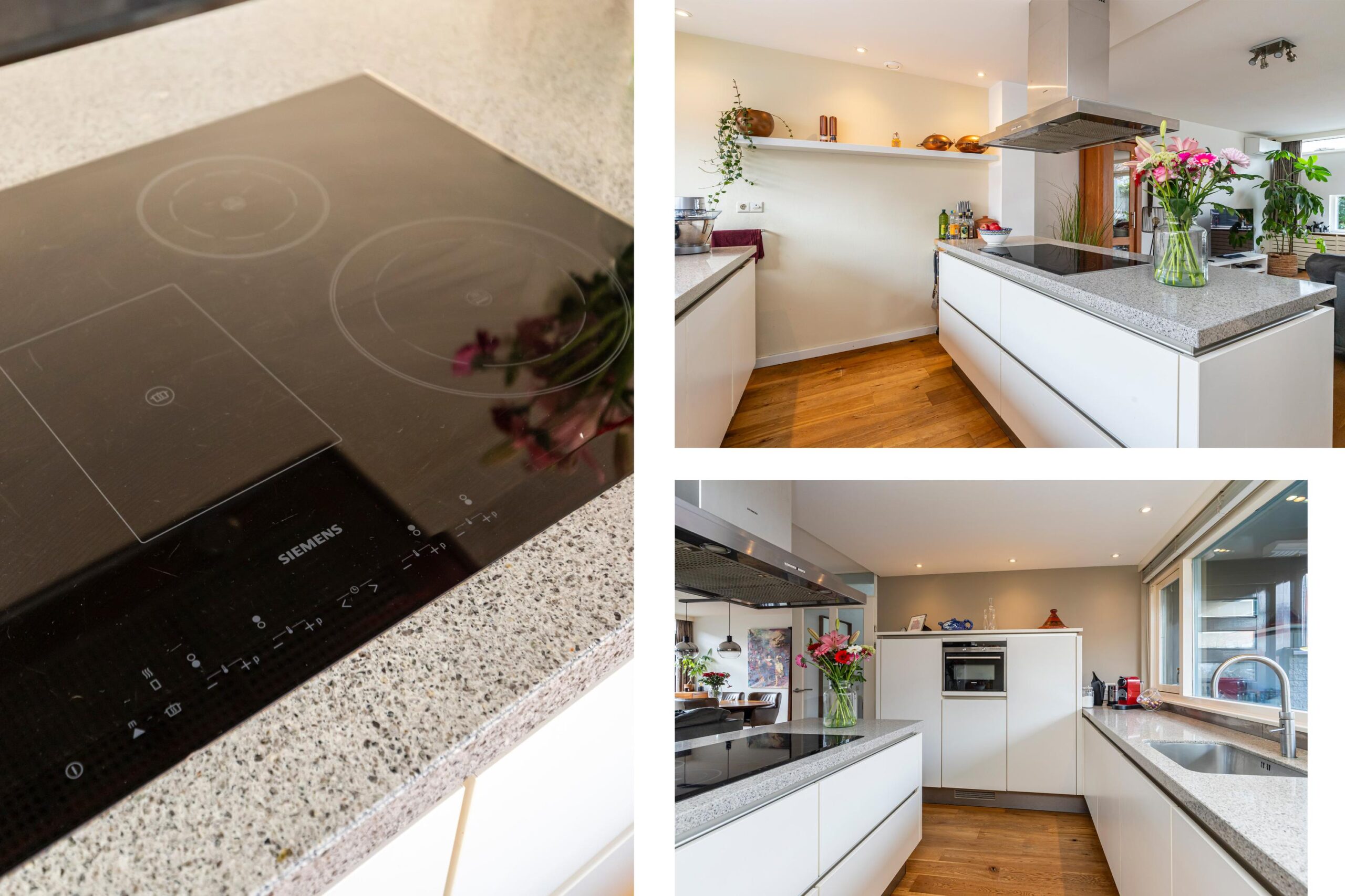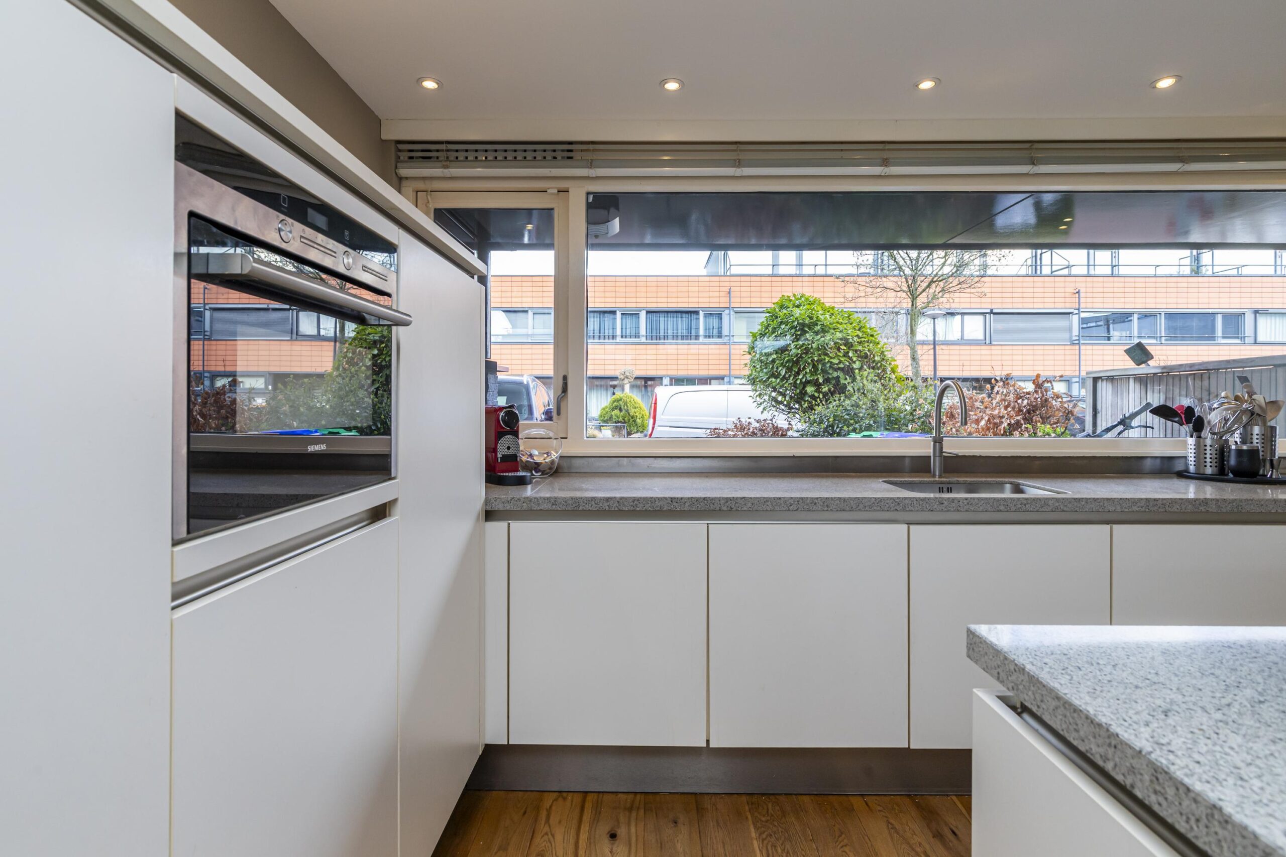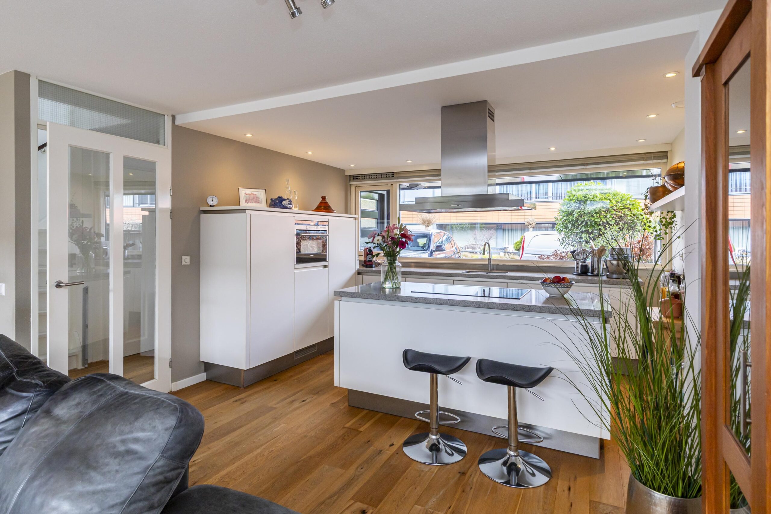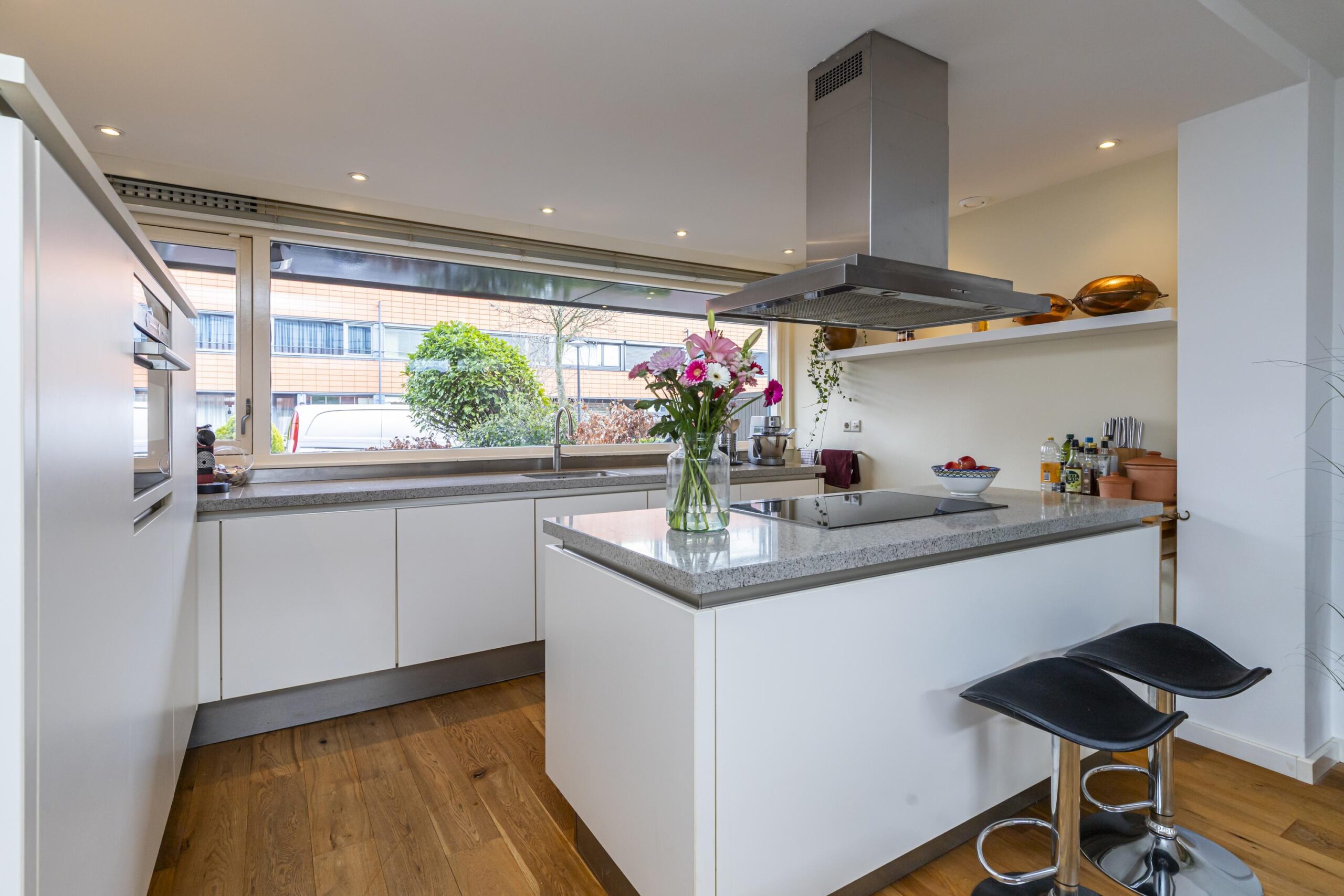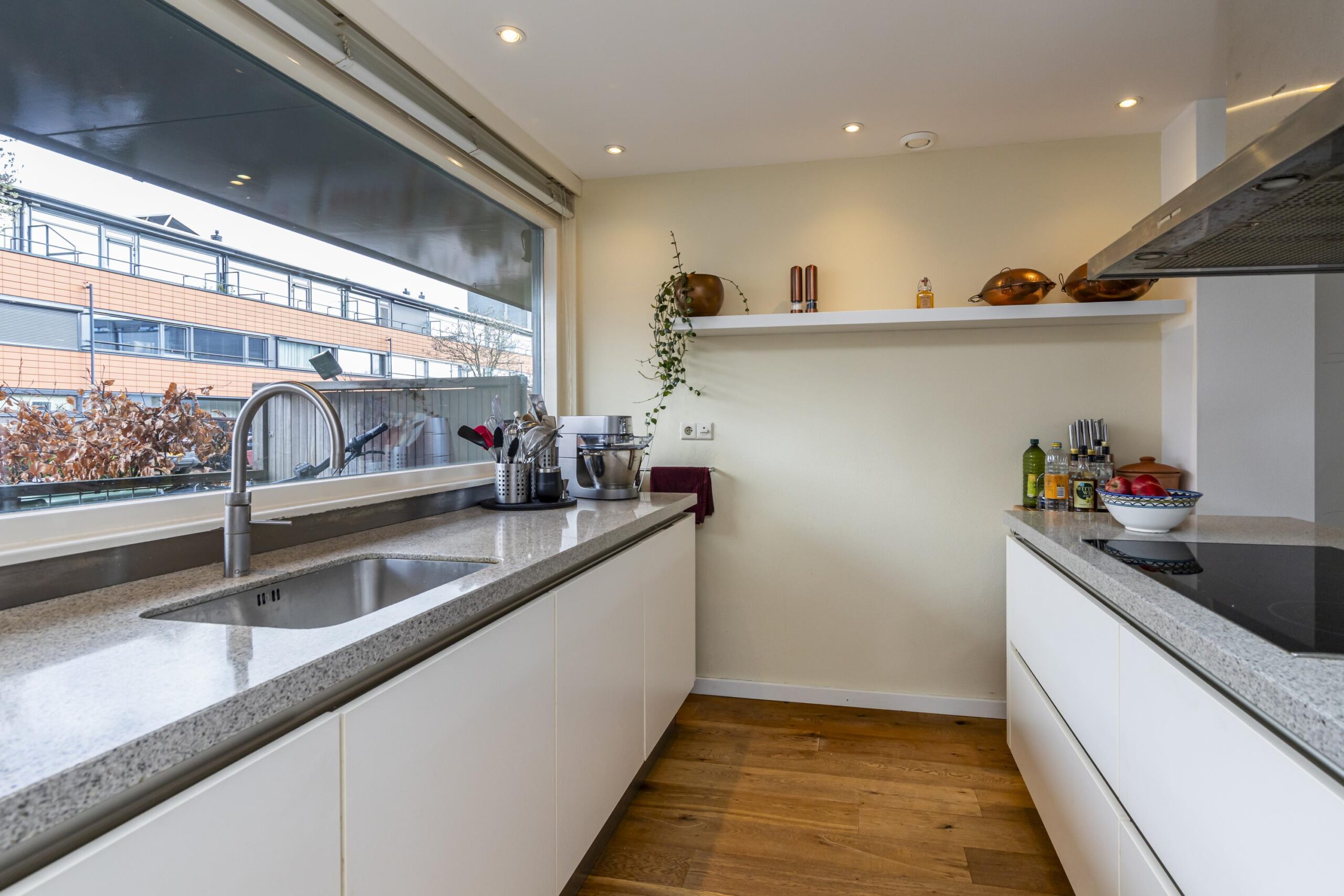 De open keuken ligt aan de voorzijde en is ingericht met diverse inbouwapparatuur, waaronder een koelkast (ca. 4 jaar oud), combi-oven, vaatwasser, Quooker, inductiekookplaat en een RVS schouw.
