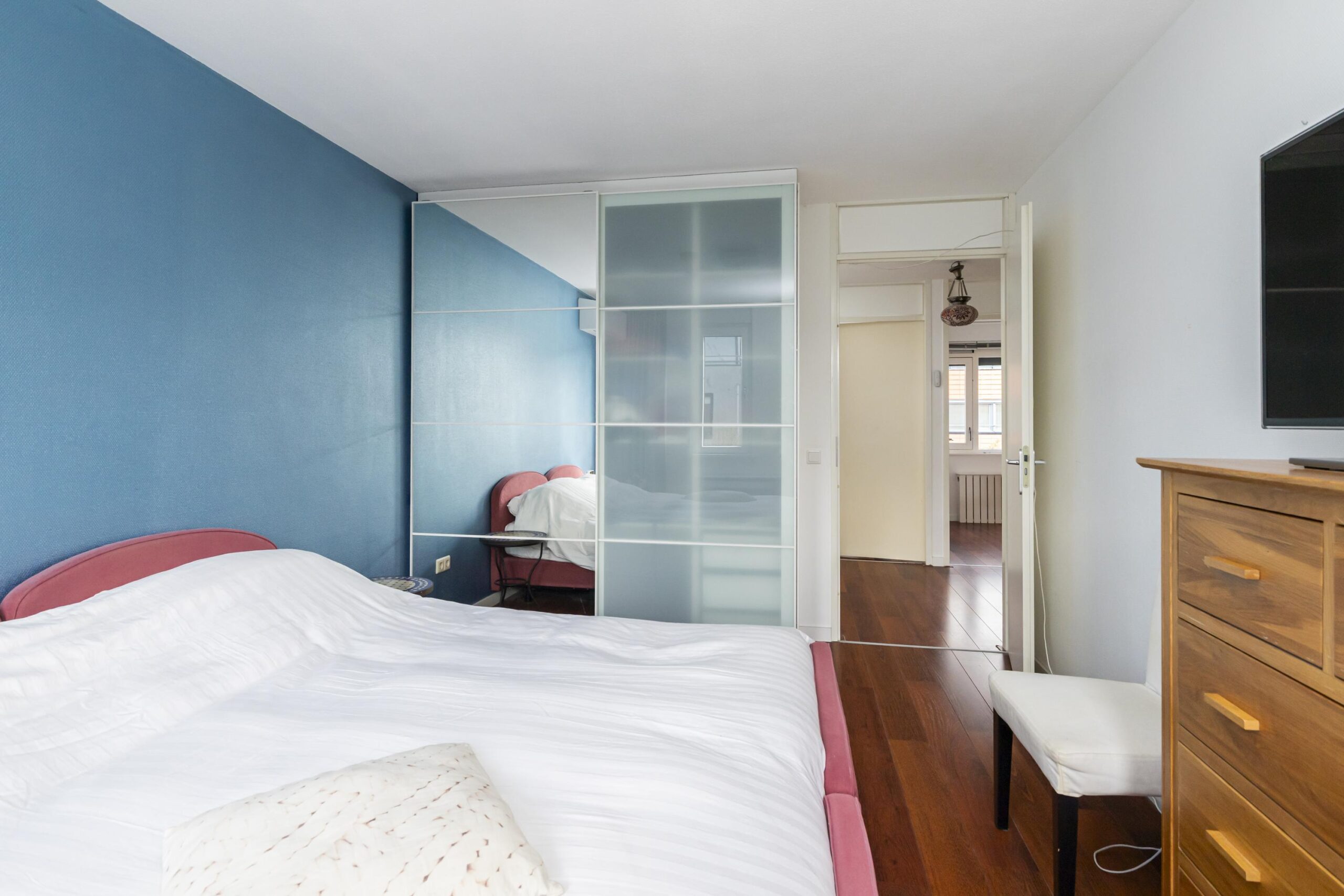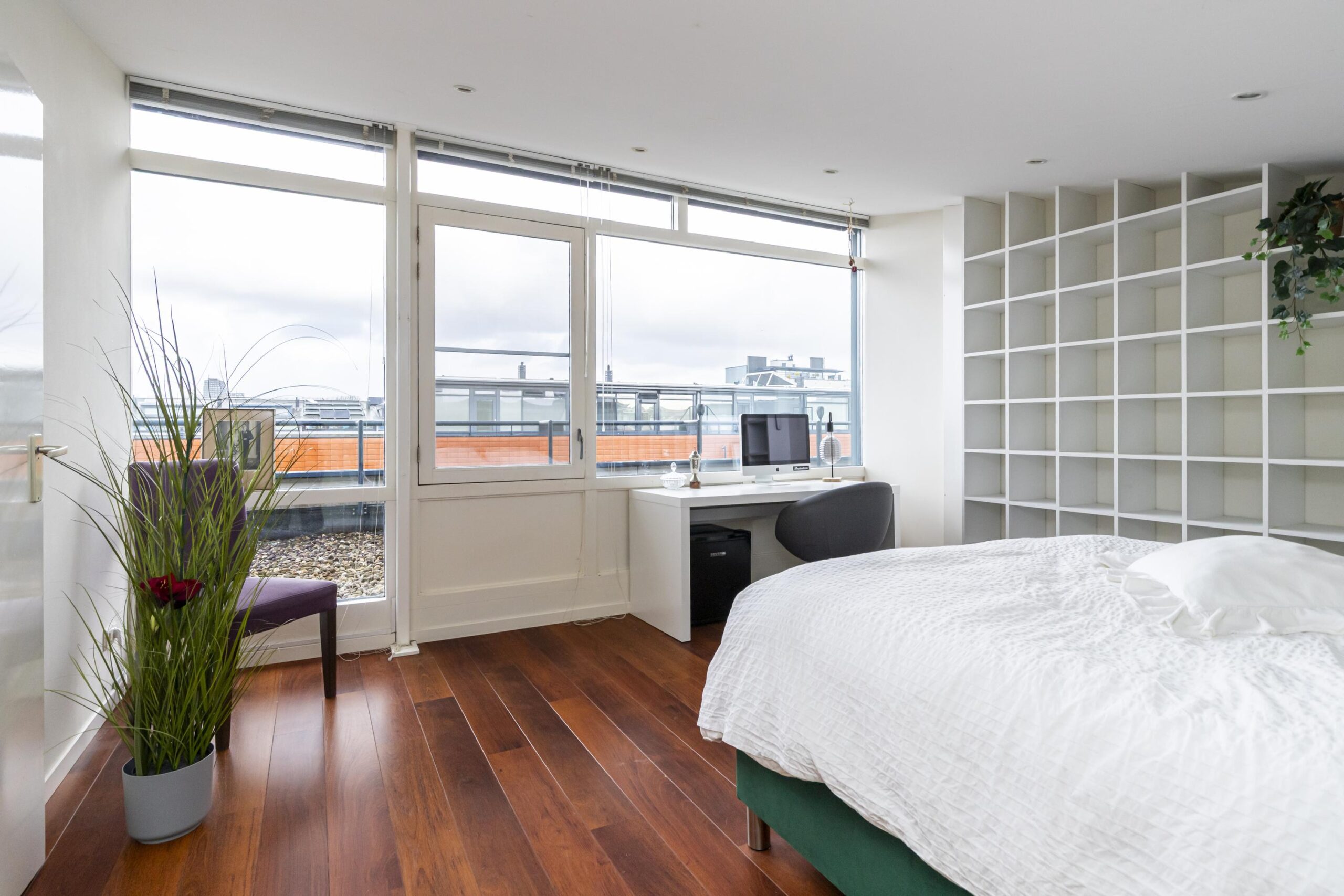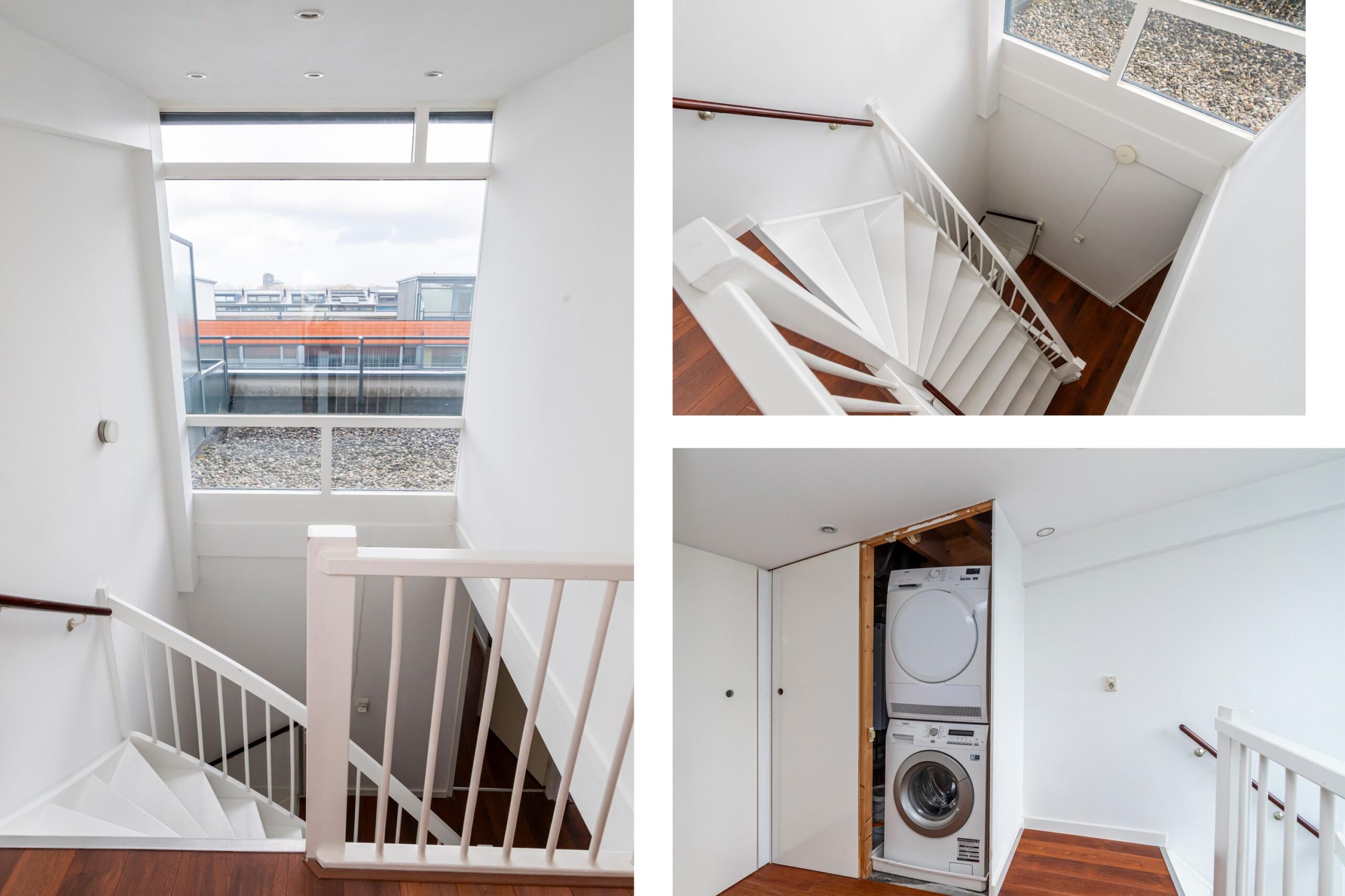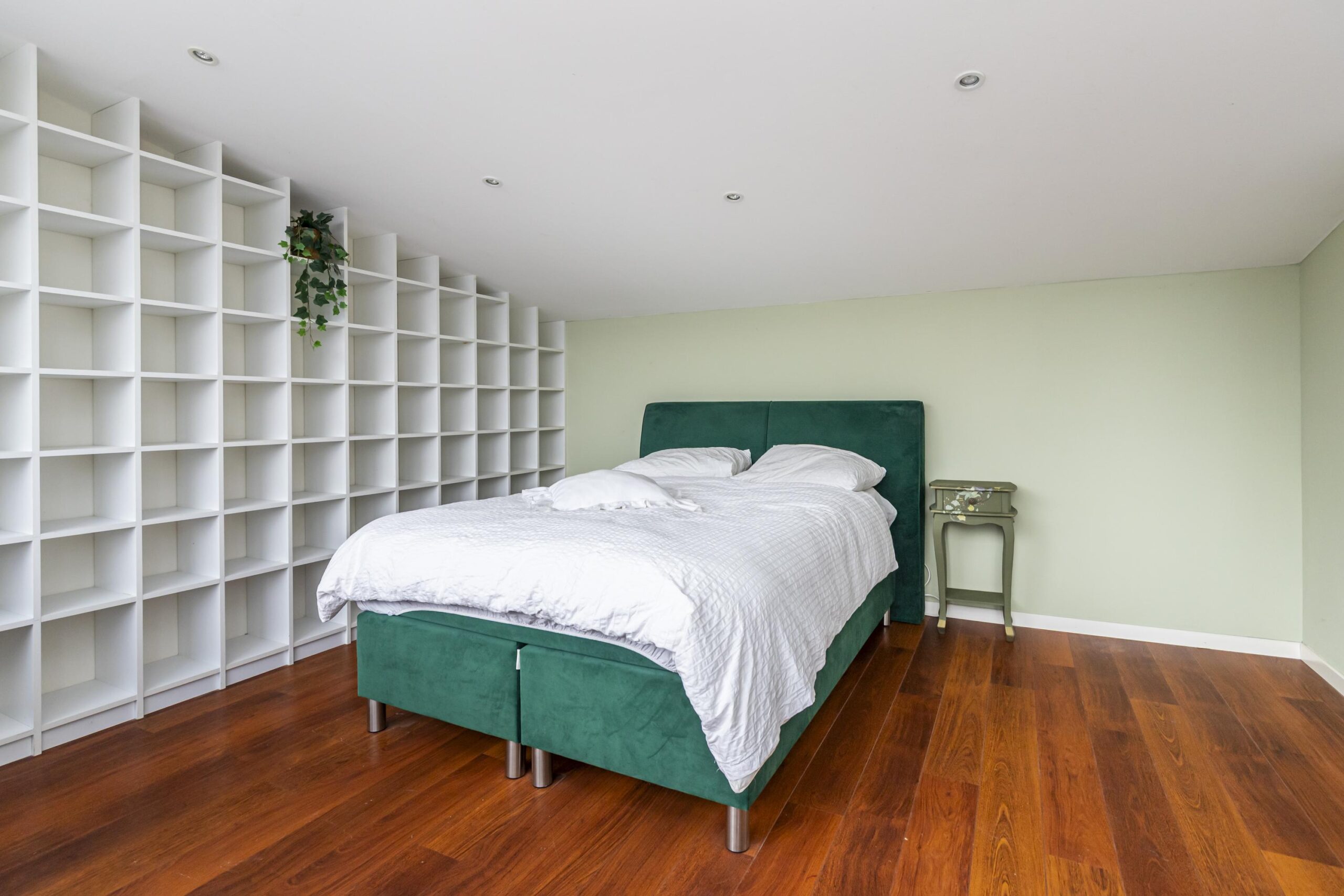 Overloop met opstelplaats voor wasmachine en droger en extra bergruimte. Hier bevindt zich de vijfde slaapkamer, tevens geschikt als werkkamer of hobbyruimte. Deze verdieping is voorzien van elektrische rolluiken.