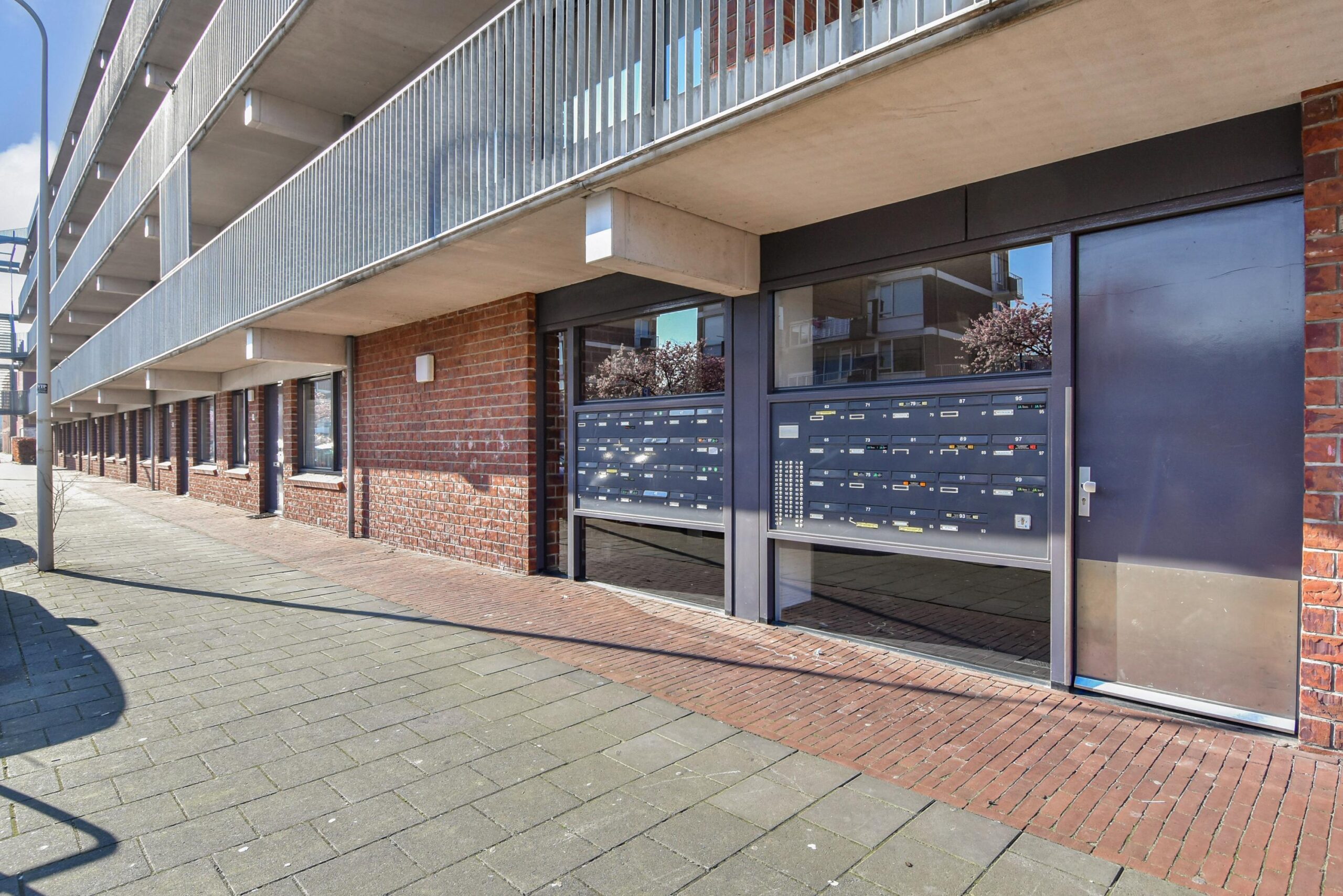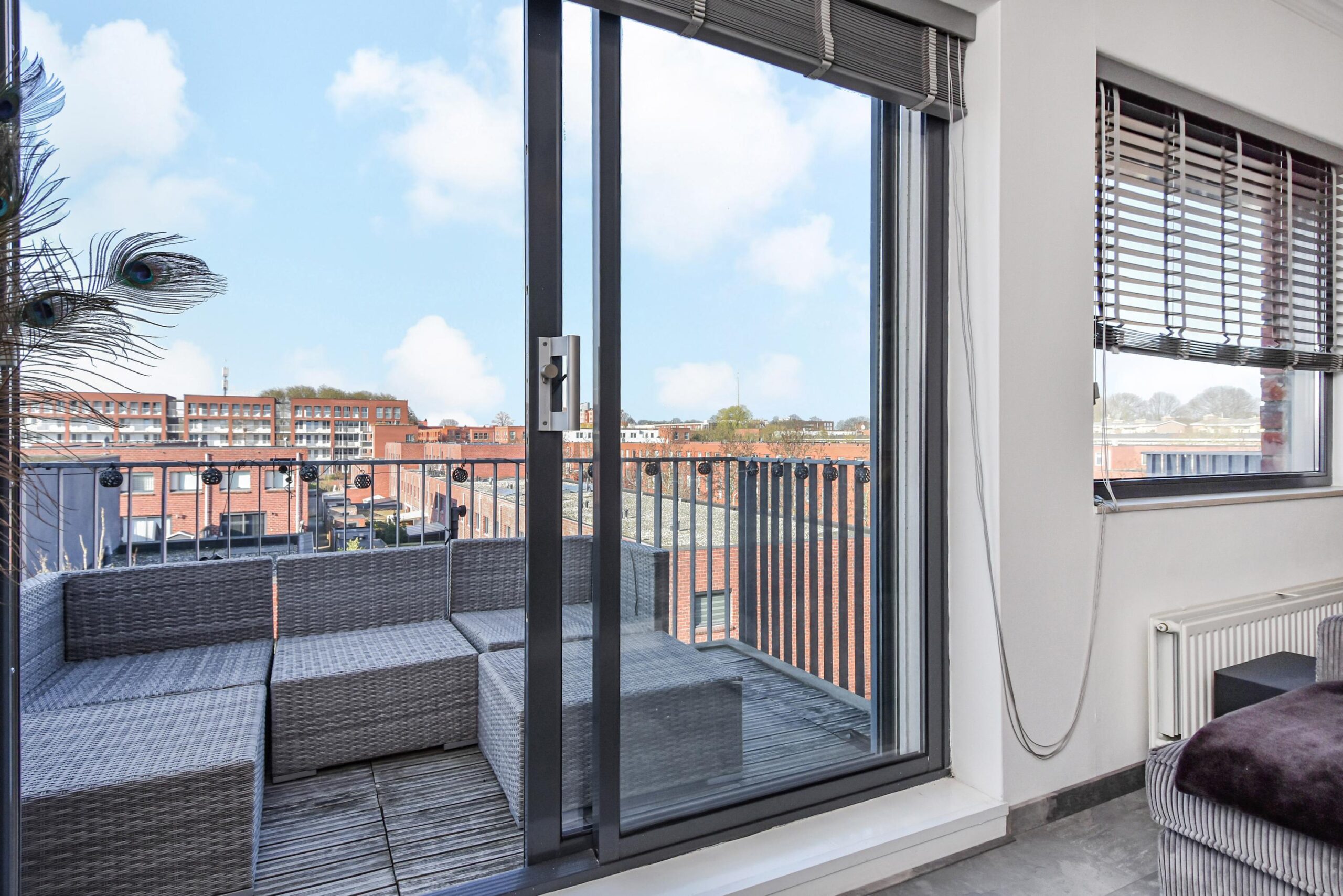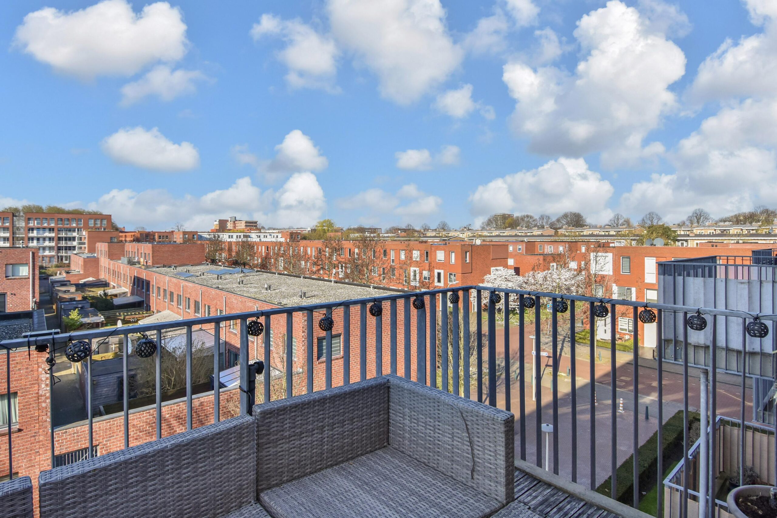 Via de schuifpui in de woonkamer stap je zo het balkon op, dat gunstig is gelegen op het zuidwesten. Hier kun je in de middag en avond volop genieten van de zon.