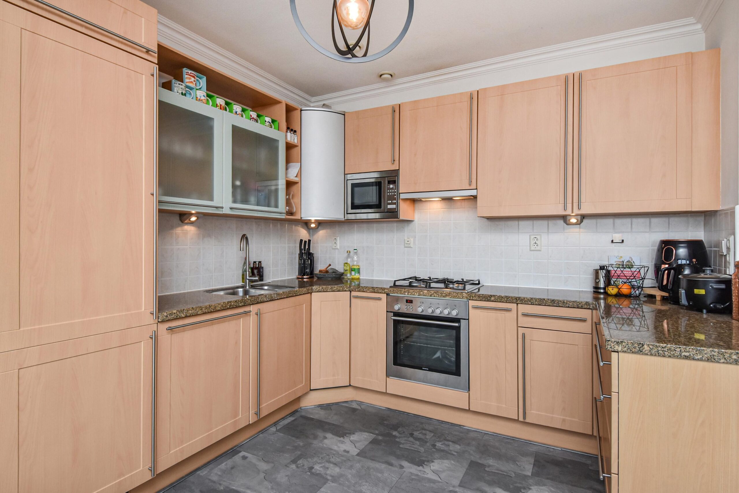 Aan de achterzijde van de woning vind je de ruime woon- en eetkamer. Dankzij de grote raampartijen is het hier heerlijk licht en voelt de ruimte extra ruim aan. De open keuken sluit mooi aan op de woonkamer en is voorzien van diverse inbouwapparatuur, zoals een koel-vriescombinatie, vaatwasser, oven en magnetron.