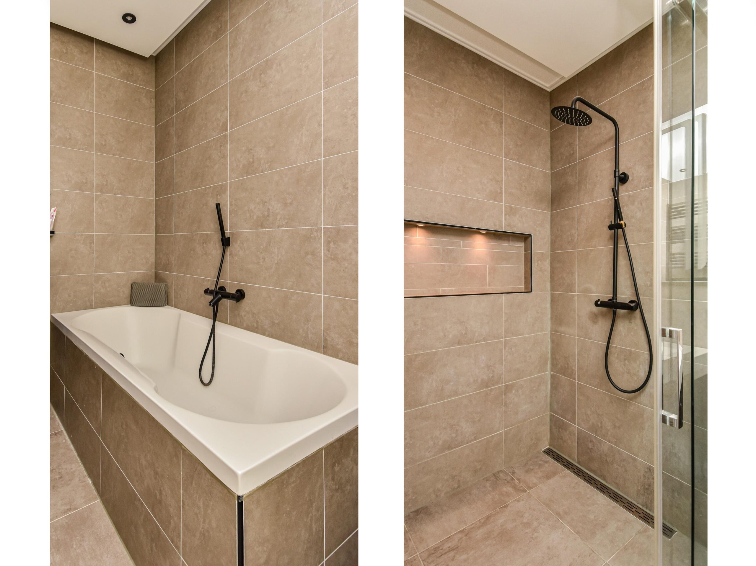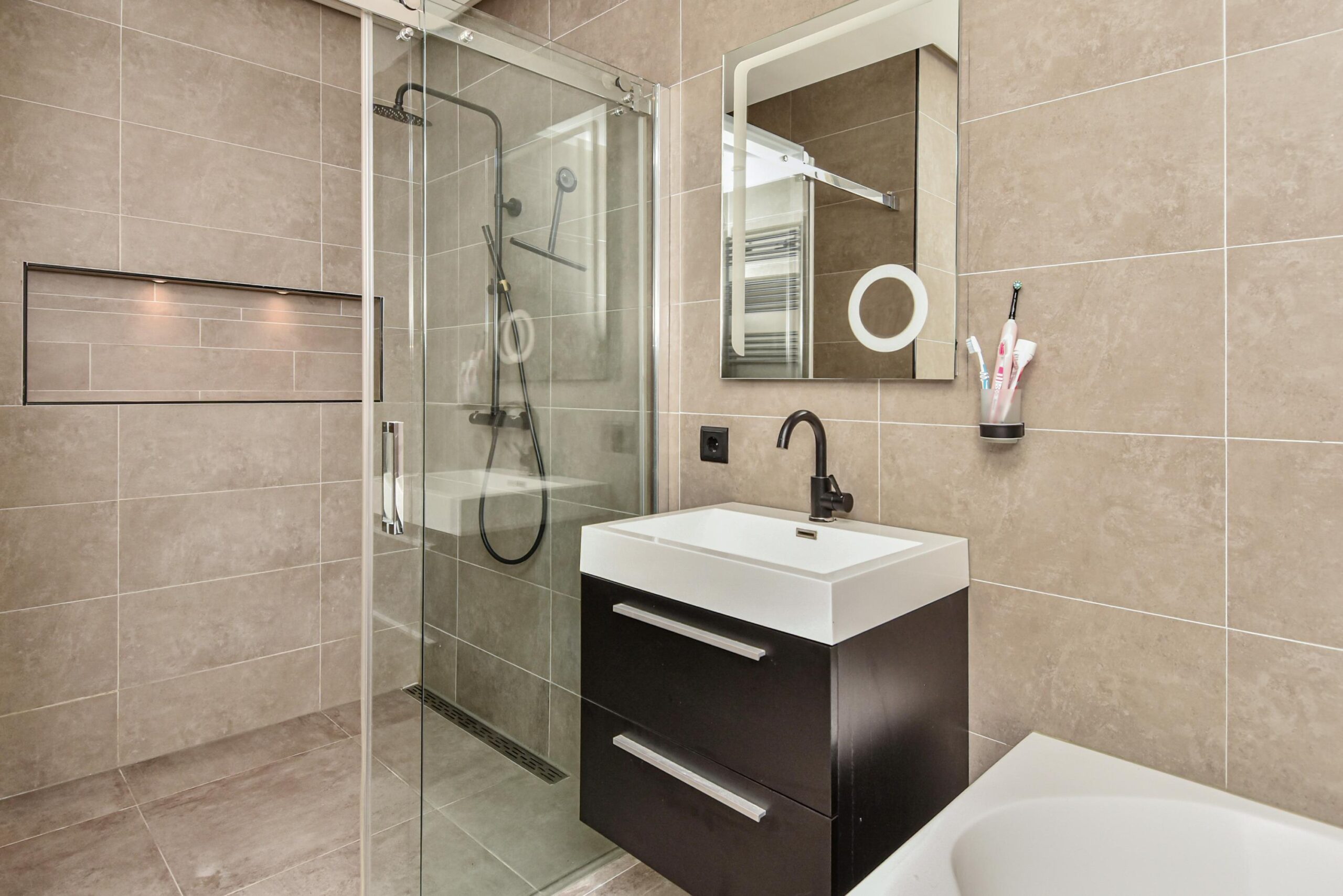 - Badkamervoorzieningen Ligbad, wastafel, wastafelmeubel, inloopdouche