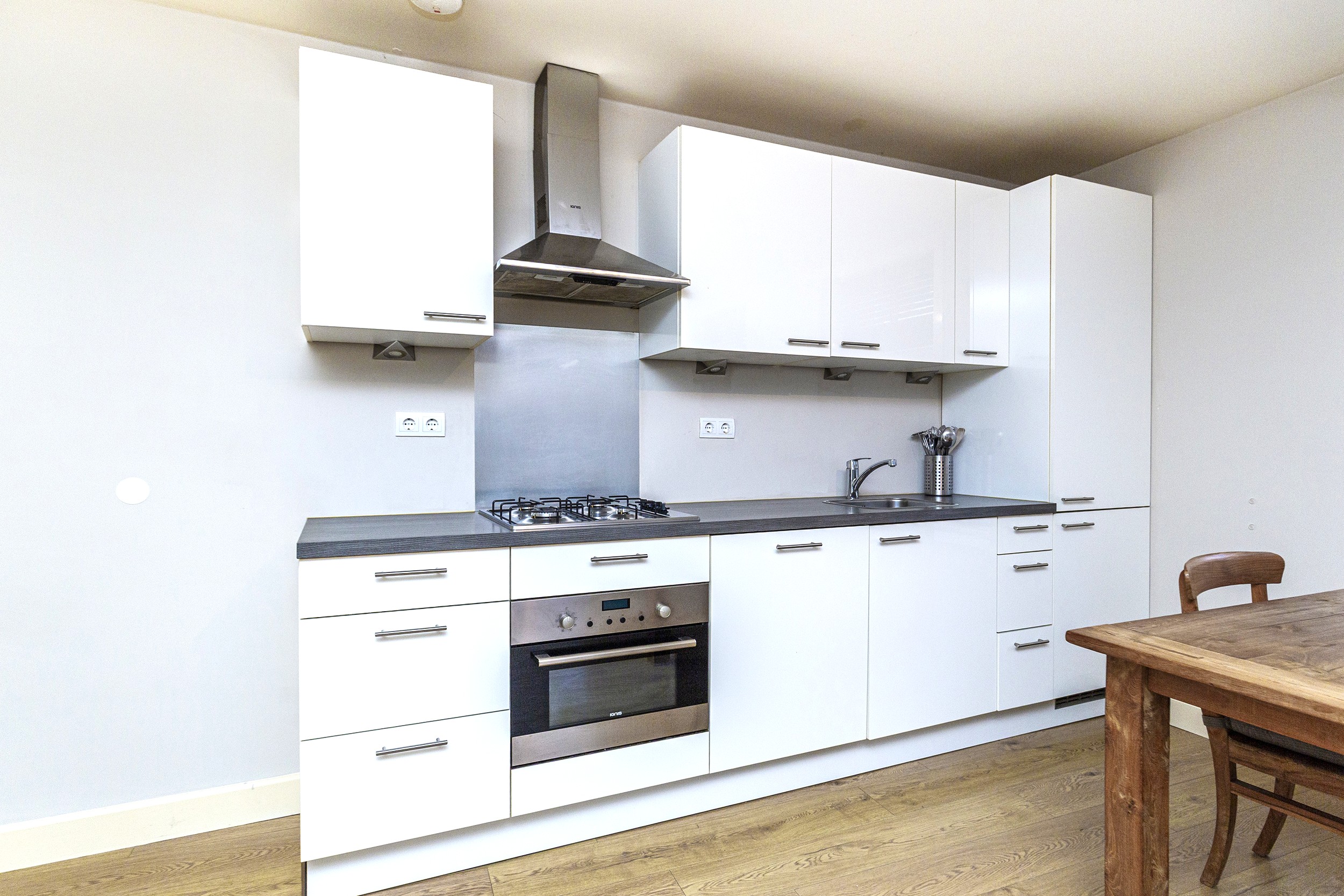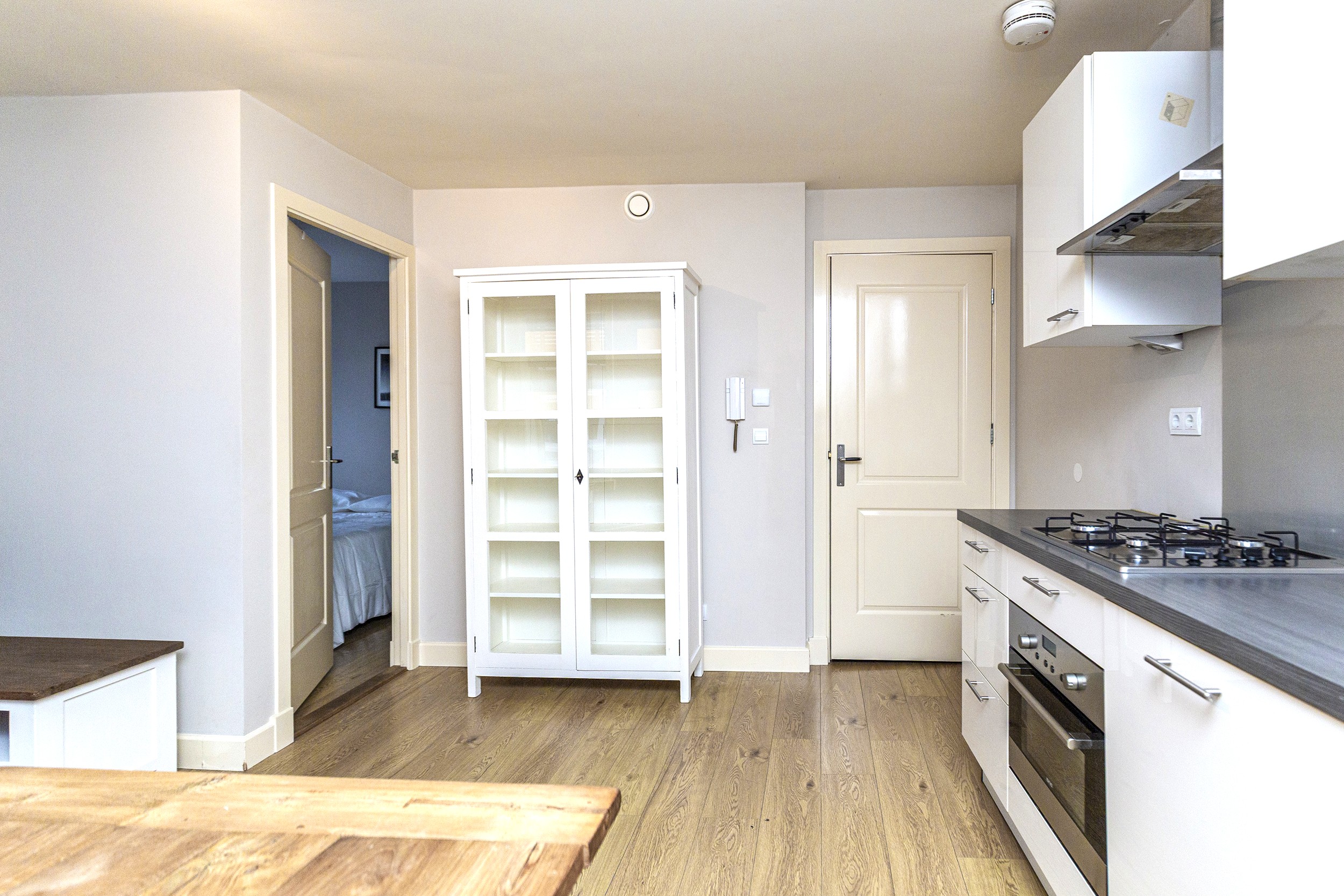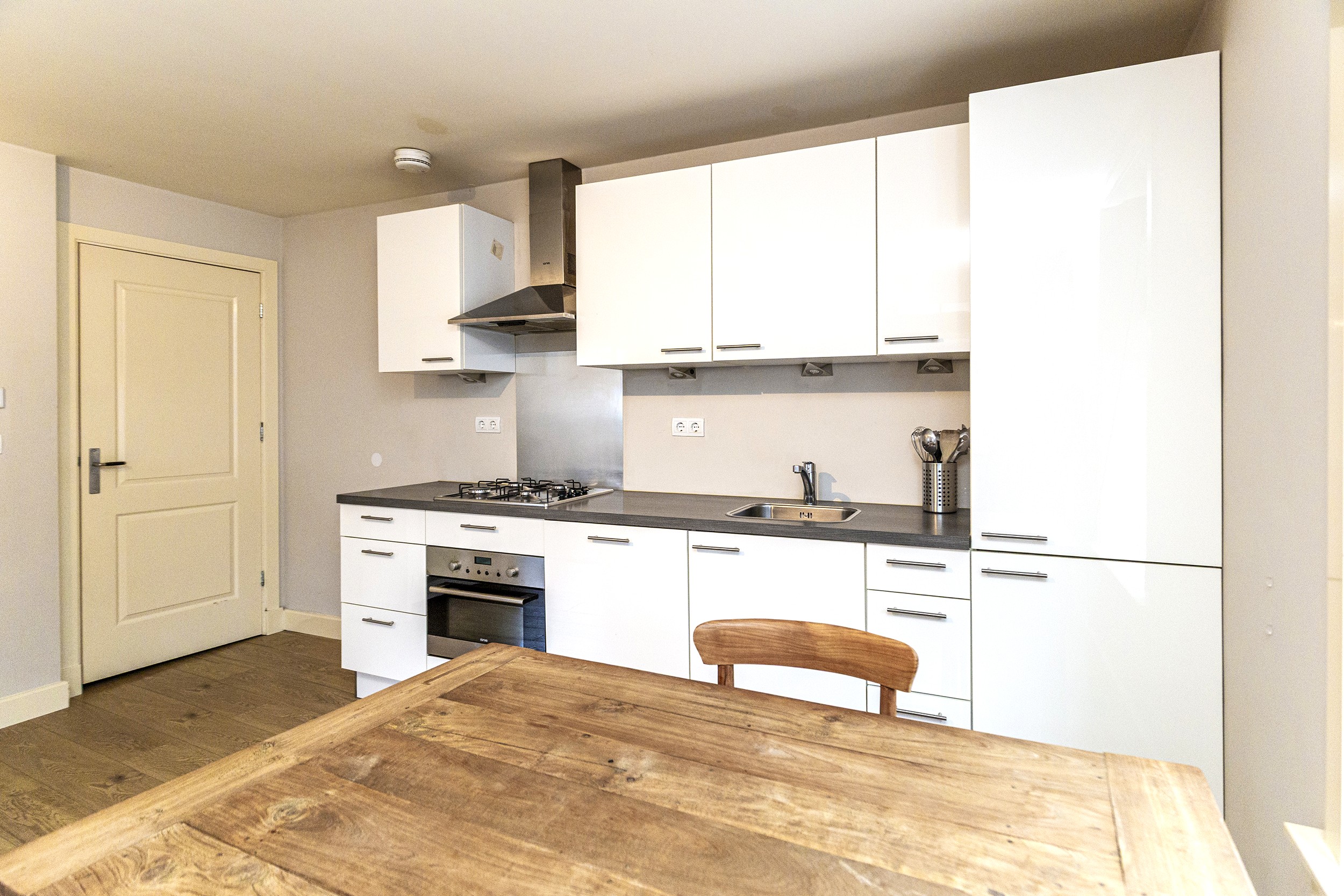 De woonkamer is licht en prettig ingedeeld en staat in open verbinding met de keuken. De keuken is compleet uitgevoerd en voorzien van diverse inbouwapparatuur, waardoor koken hier comfortabel en efficiënt is.