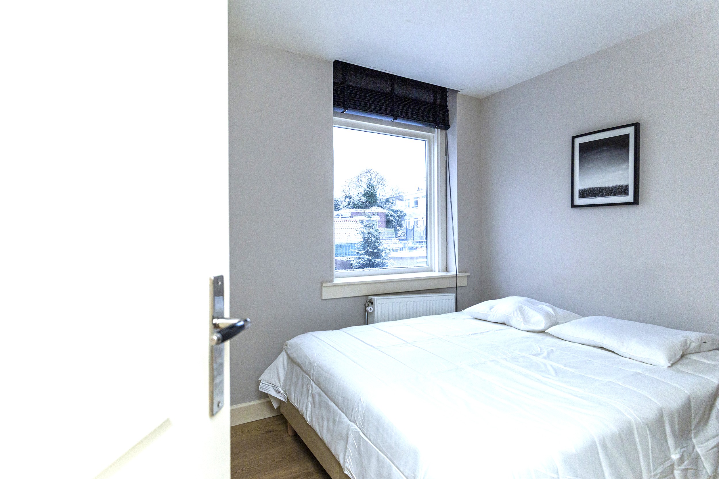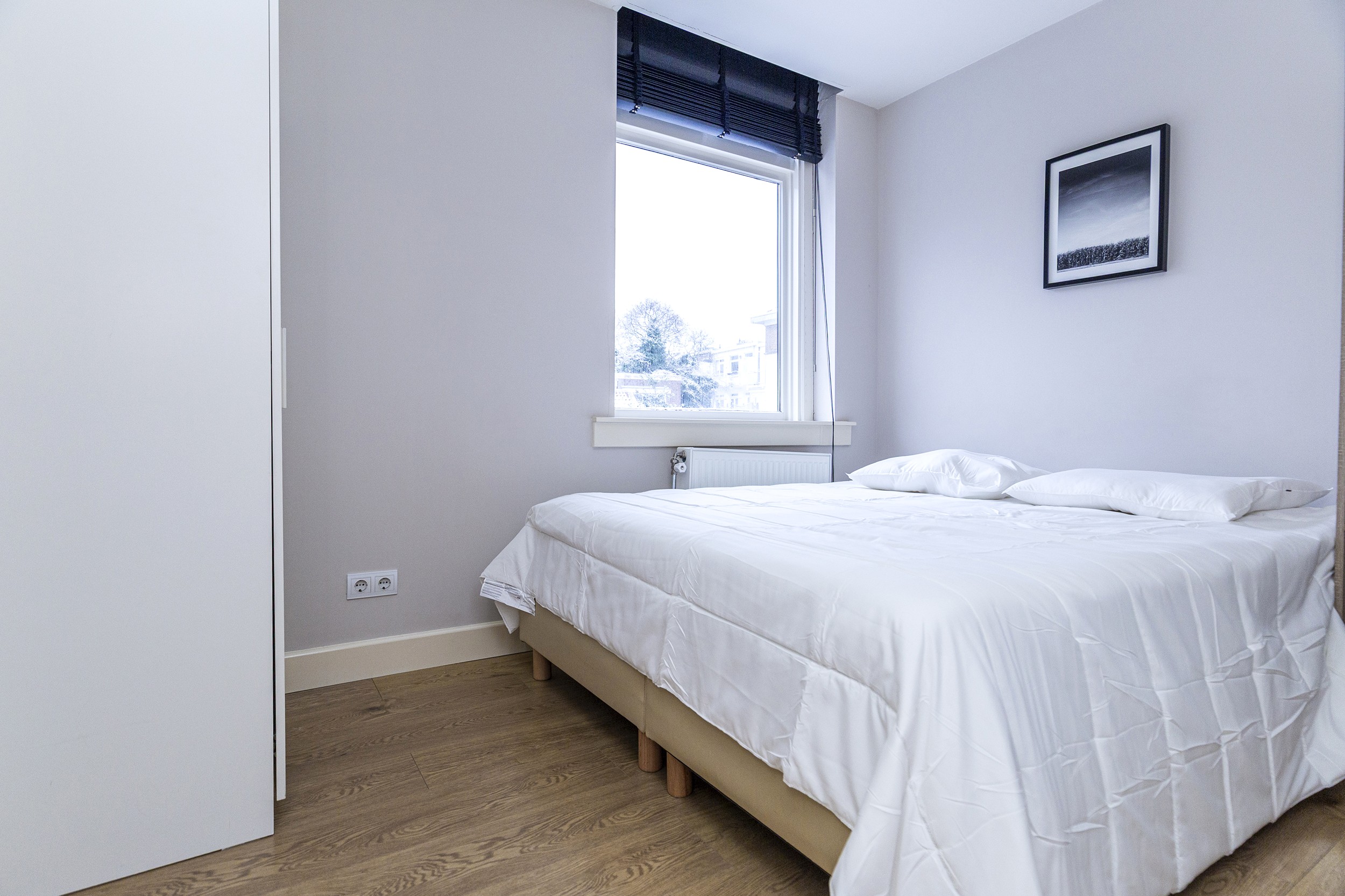 De slaapkamer is rustig gelegen en biedt voldoende ruimte voor een tweepersoonsbed en kastruimte. Aangrenzend bevindt zich de badkamer, voorzien van een wastafelmeubel en een douche.