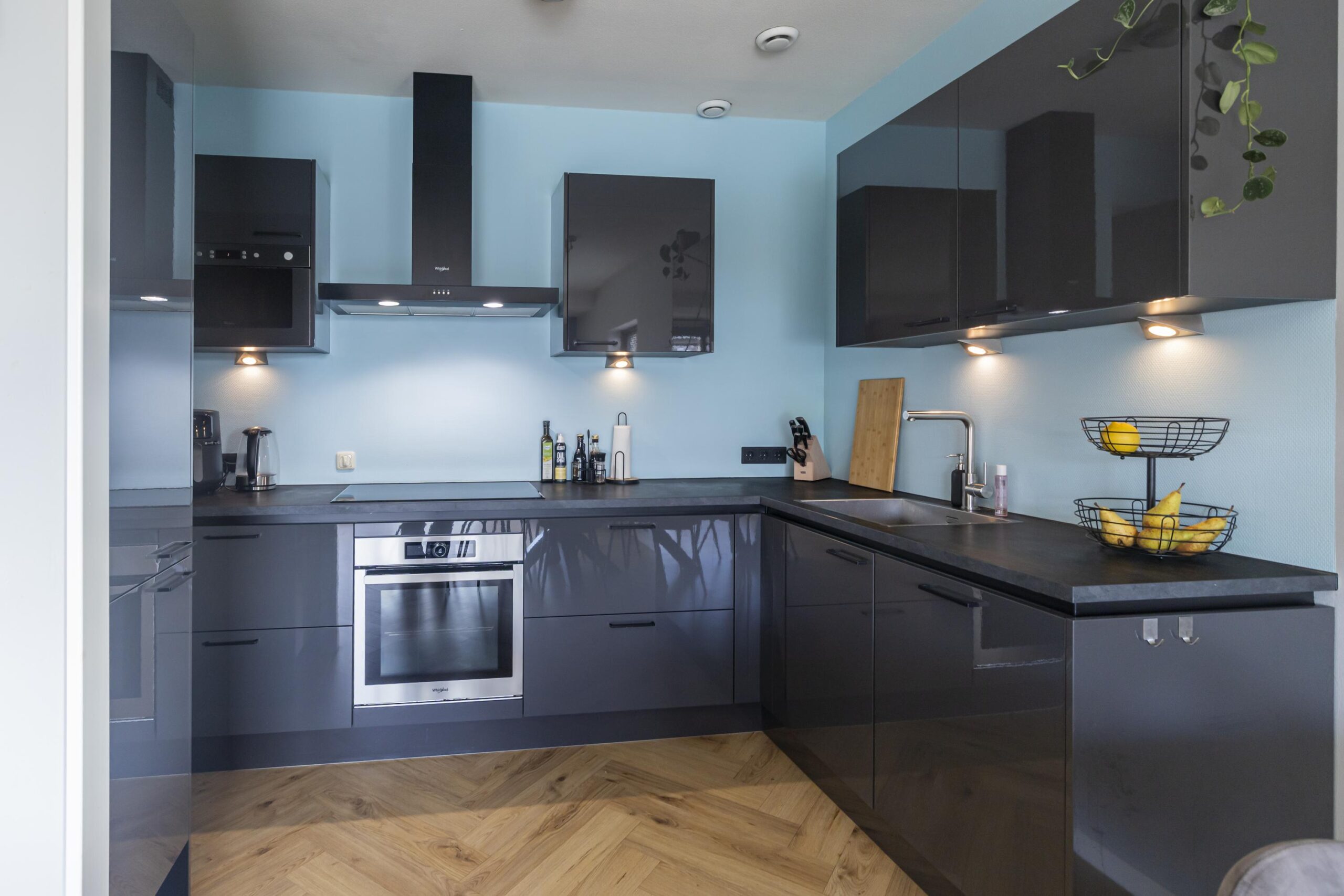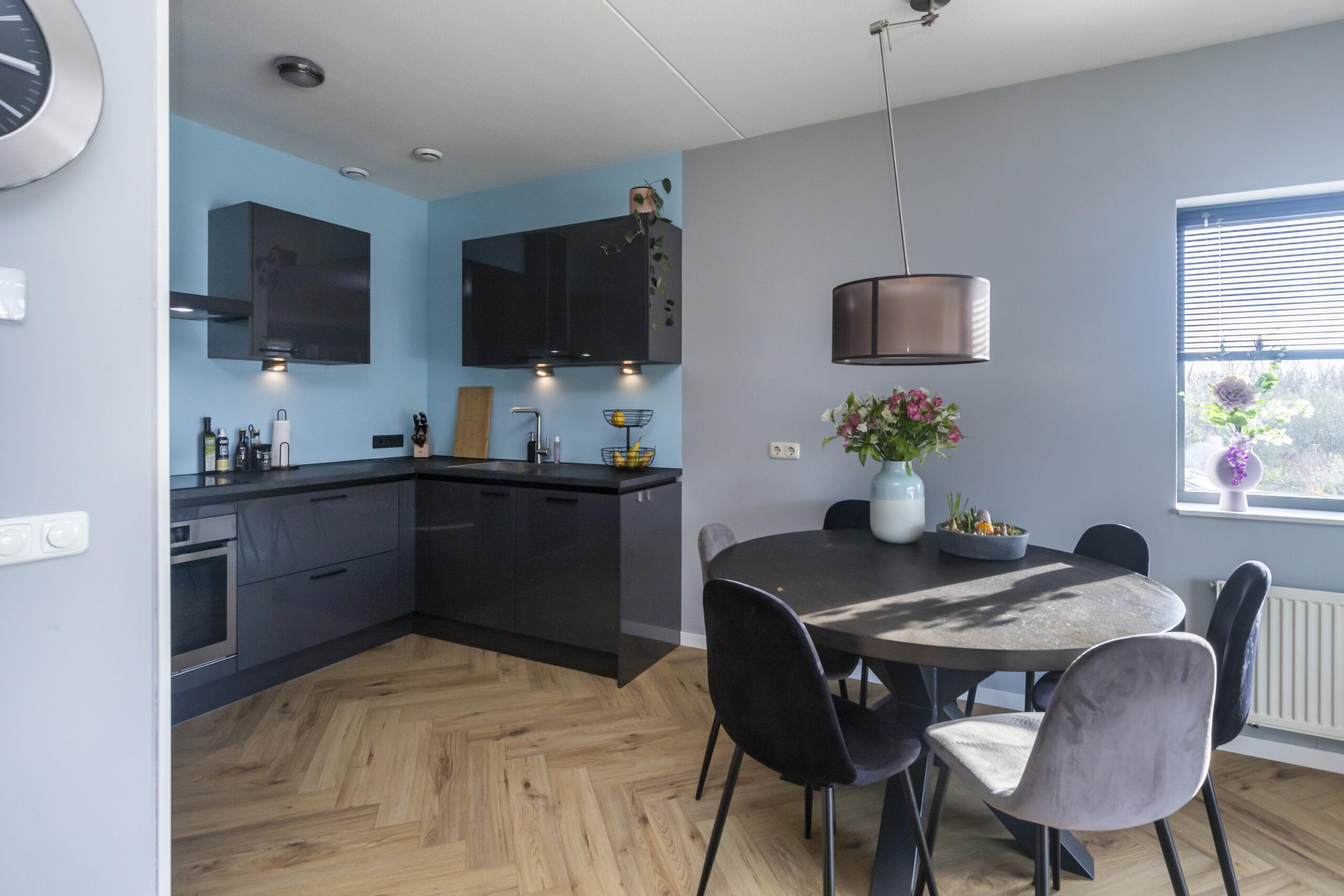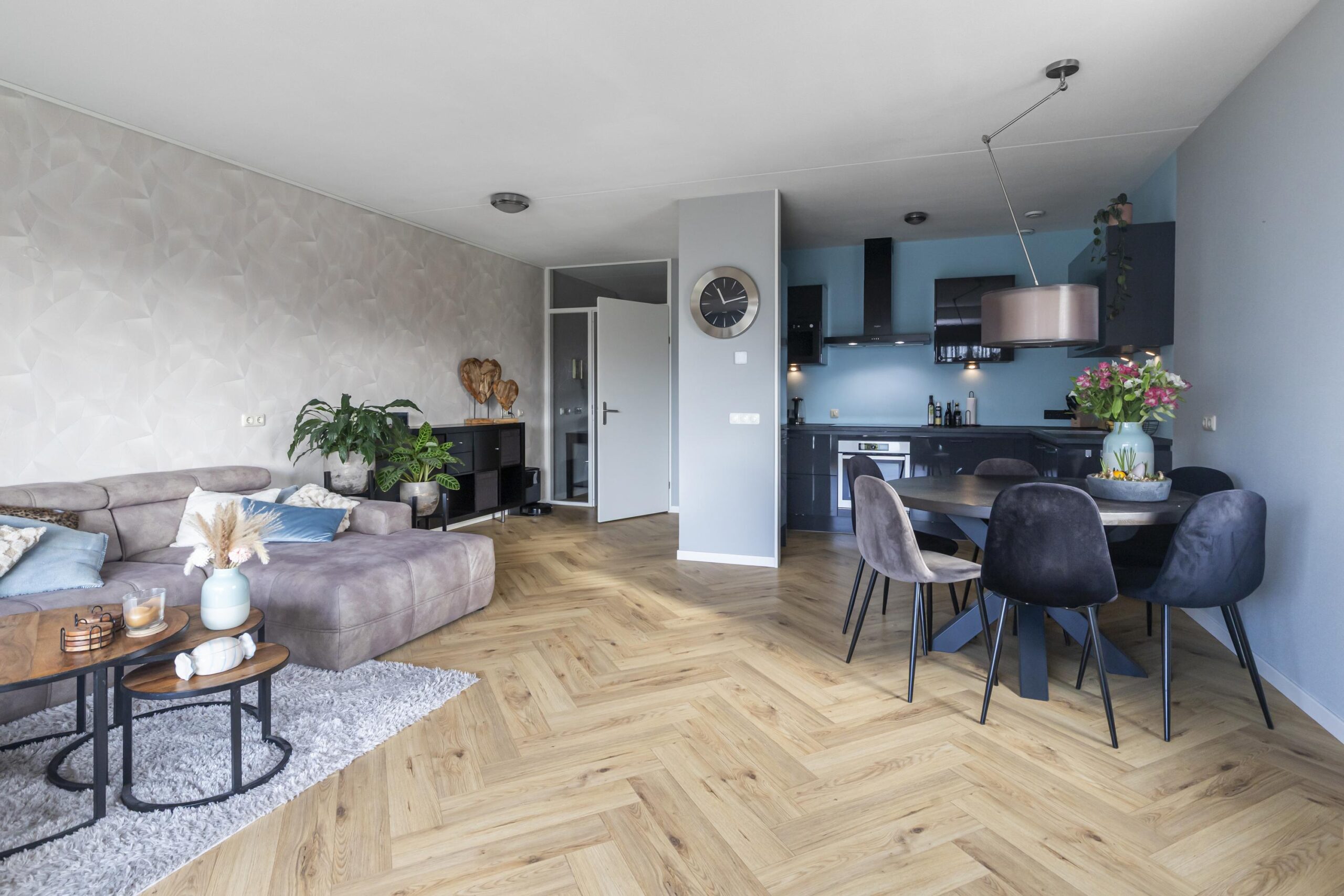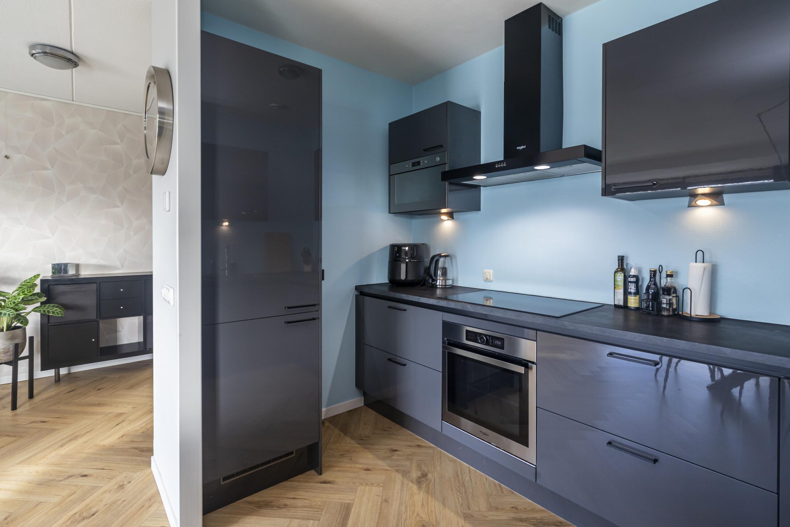 Aan de voorzijde van de woning bevindt zich de grote, lichte woonkamer met open keuken. De keuken is uitgerust met een koel-vriescombinatie, combi-oven, inductiekookplaat en vaatwasser, en beschikt over voldoende opbergruimte. Dankzij de brede schuifpui in de woonkamer is er veel lichtinval en heb je direct toegang tot het royale terras van circa 17,5 m². Hier kun je heerlijk genieten van de zon en de buitenruimte.