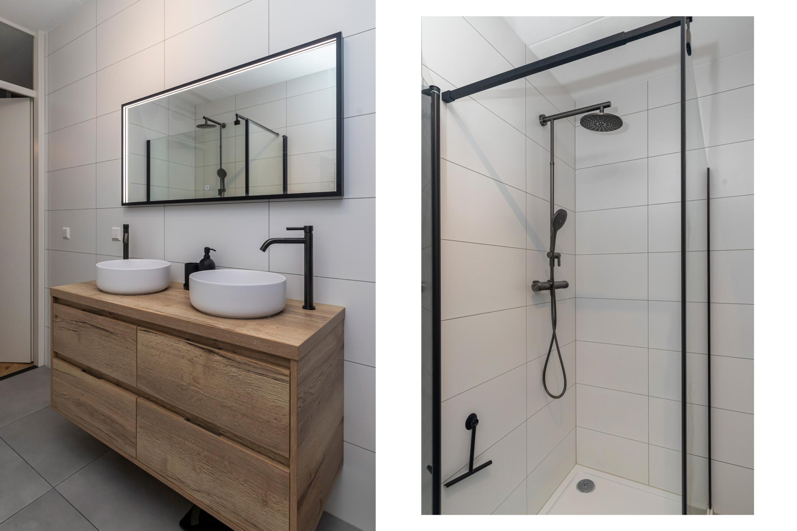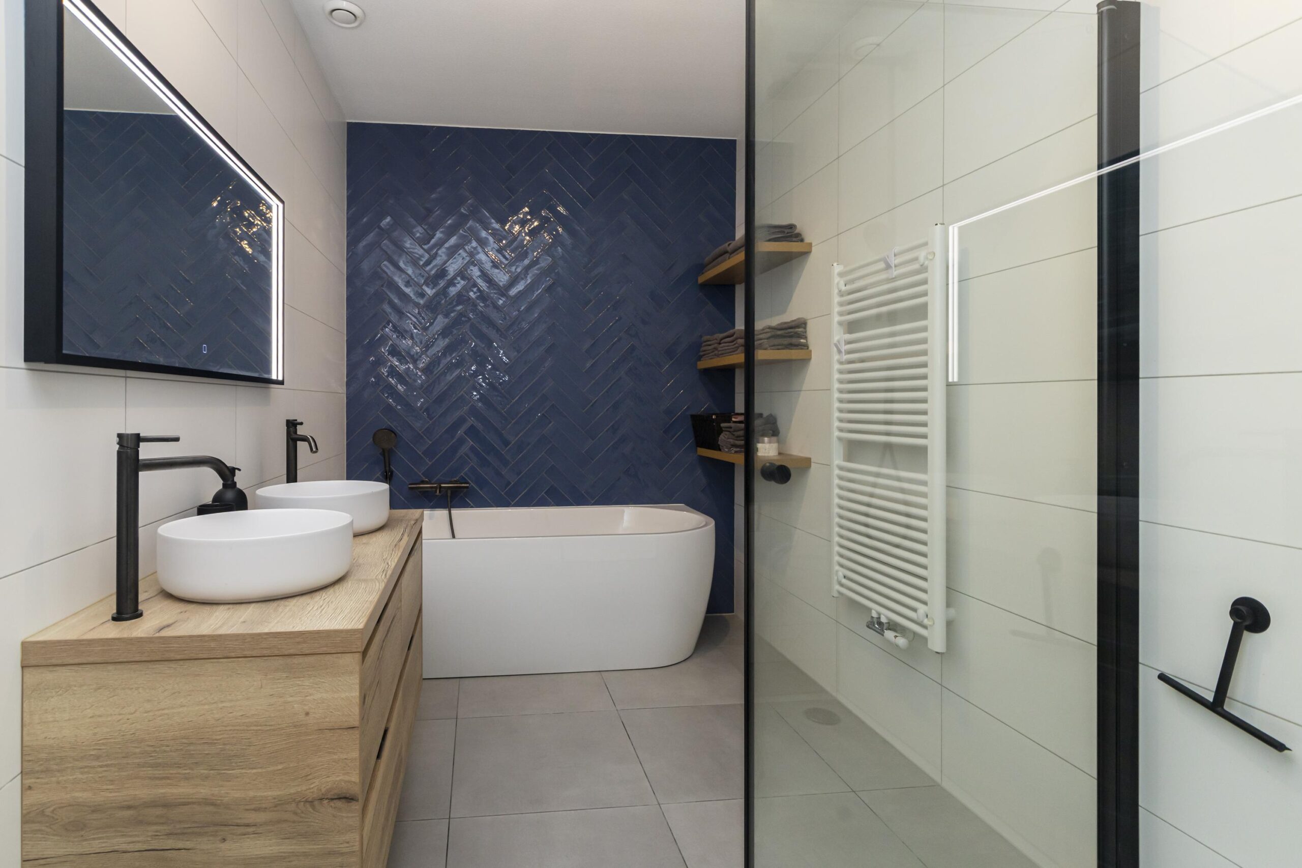 - Badkamervoorzieningen Ligbad, douche, dubbele wastafel, wastafelmeubel