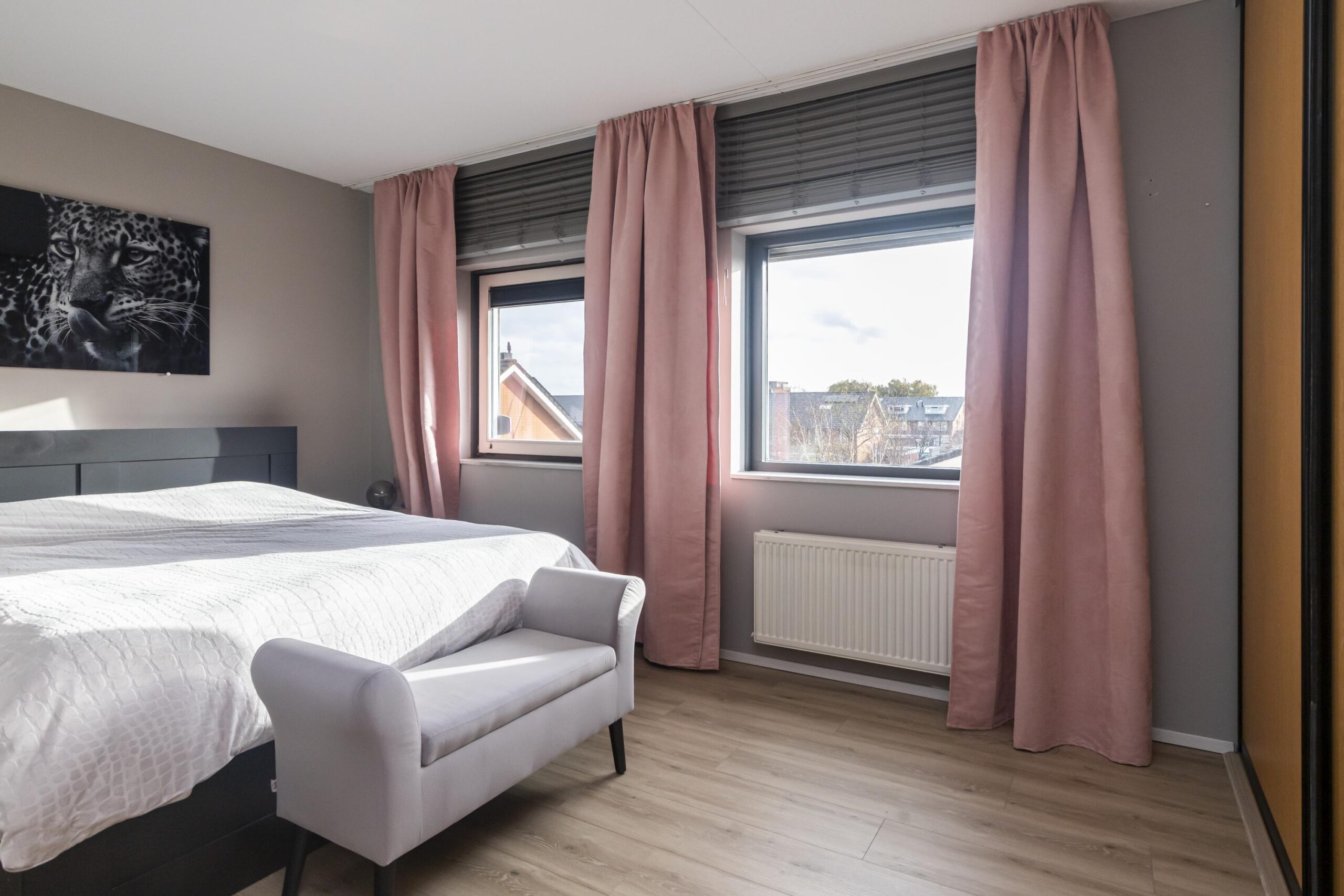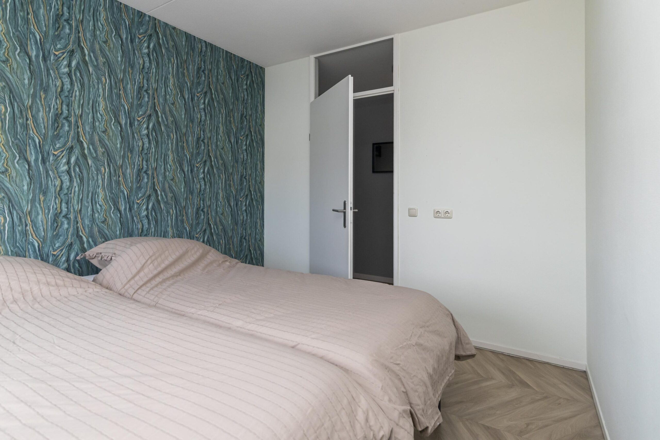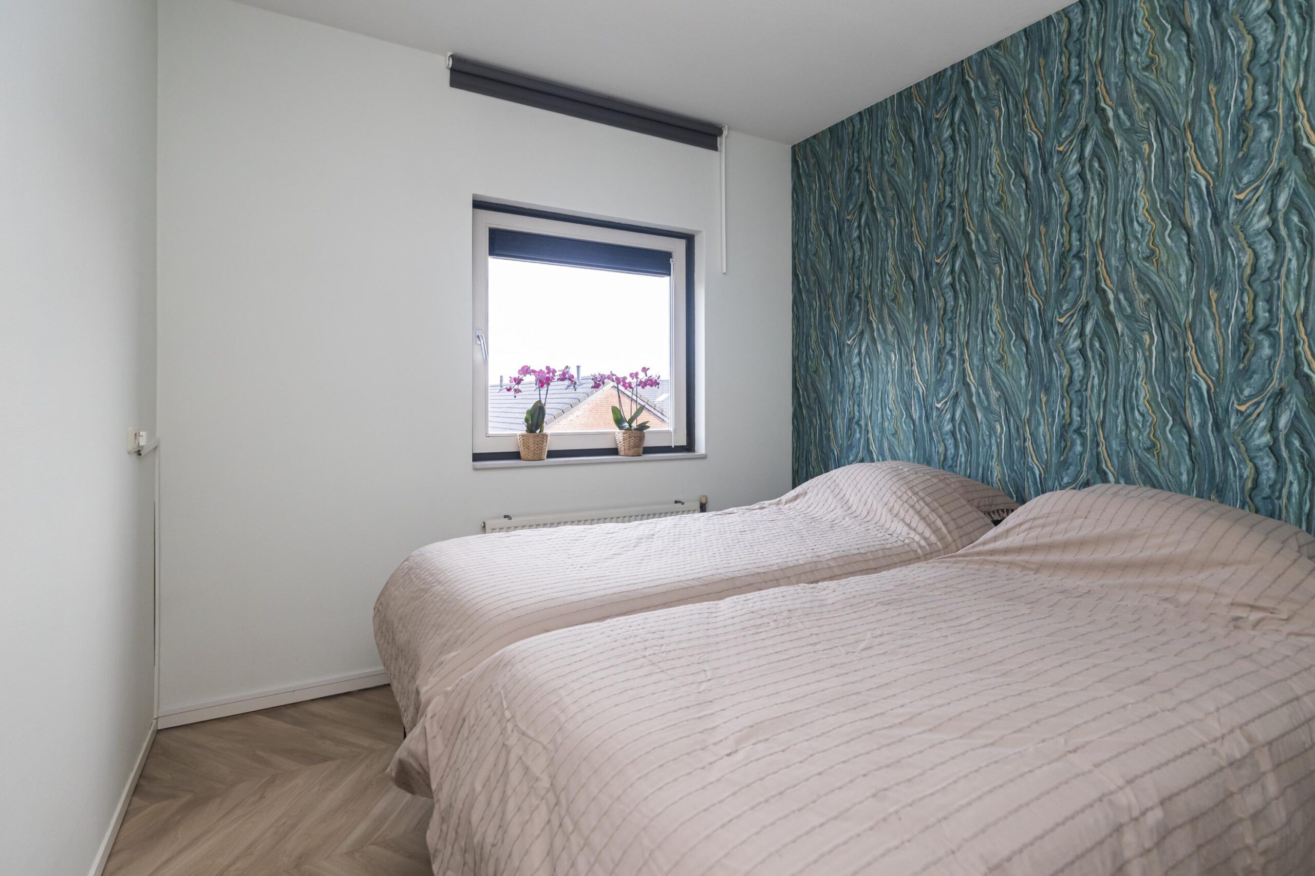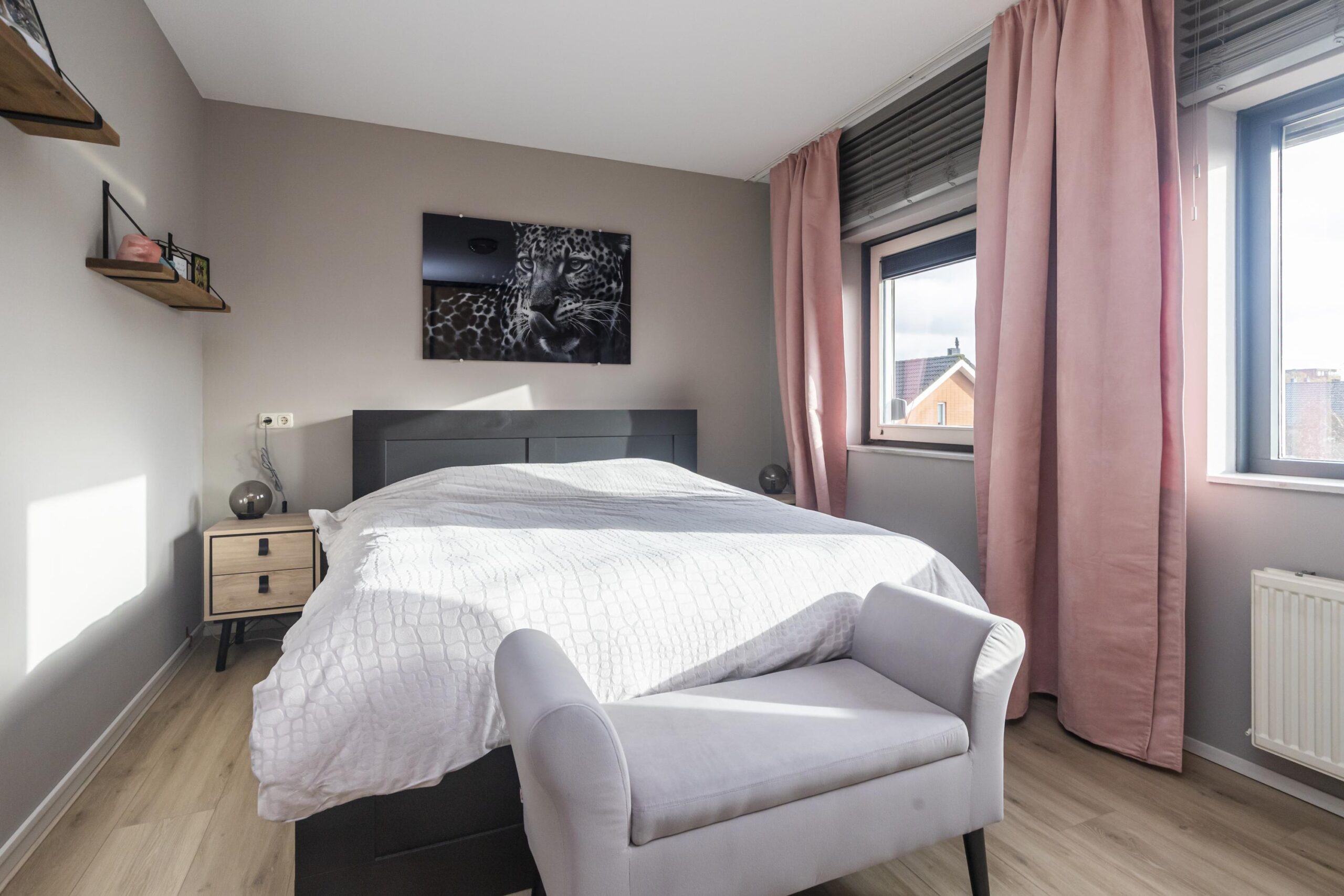 Direct aan de linkerzijde bevinden zich twee ruime slaapkamers, beide met een prettig en praktisch formaat. Loop je verder door, dan vind je aan dezelfde zijde de recent gerenoveerde badkamer. Deze is modern uitgevoerd en voorzien van een dubbele wastafel met meubel, een ligbad én een aparte douche—een heerlijke, complete ruimte waar je van alle gemakken bent voorzien.