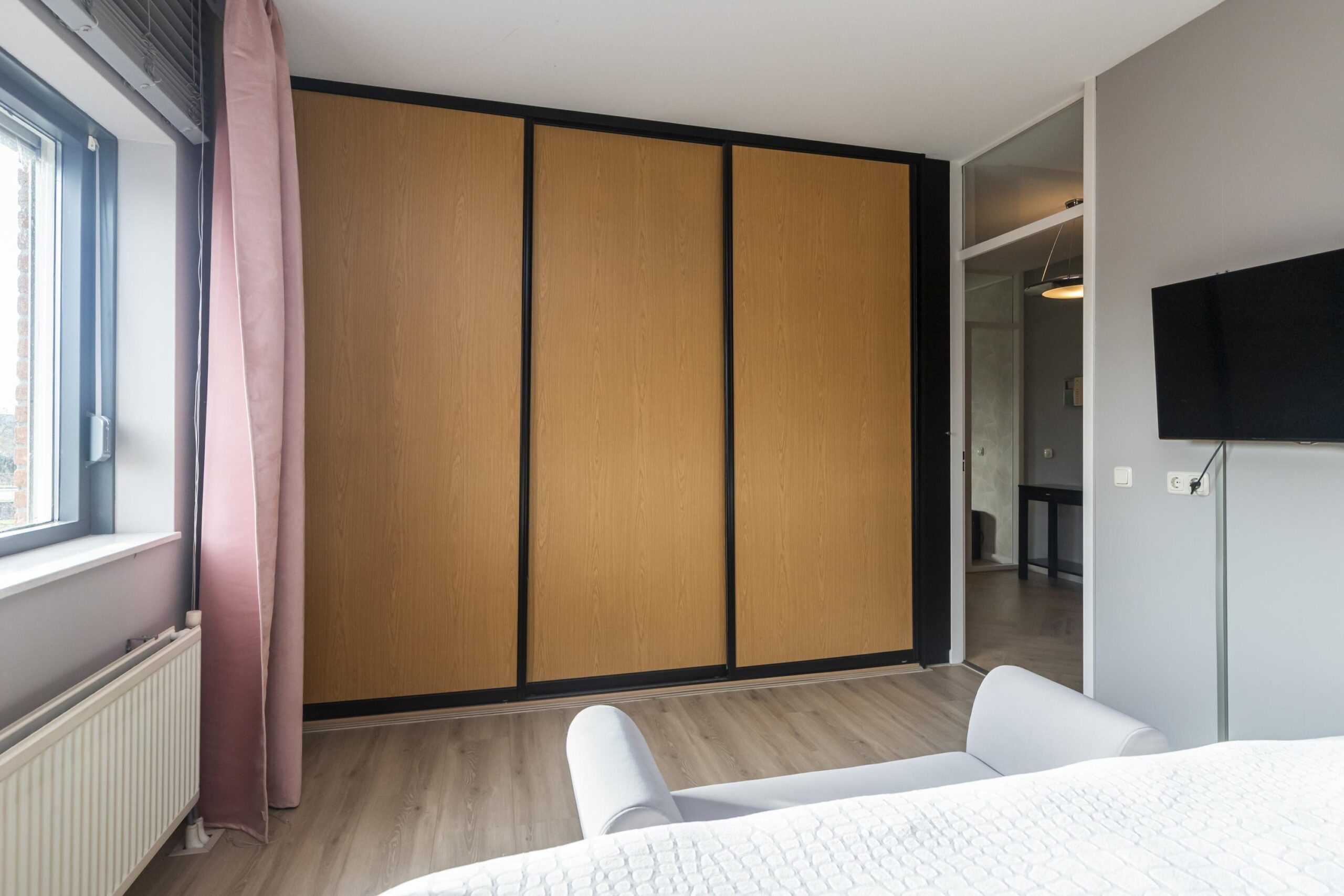Aan het einde van de gang ligt de derde, tevens grootste slaapkamer. Deze kamer heeft een riant oppervlak en beschikt over een ingebouwde kast. Daarnaast is er in de hal een separaat toilet aanwezig, evenals een ruime berging met plek voor de wasmachine en droger.