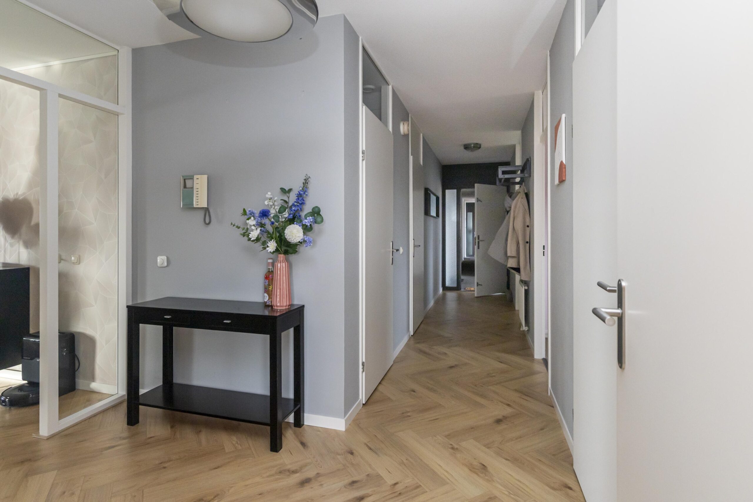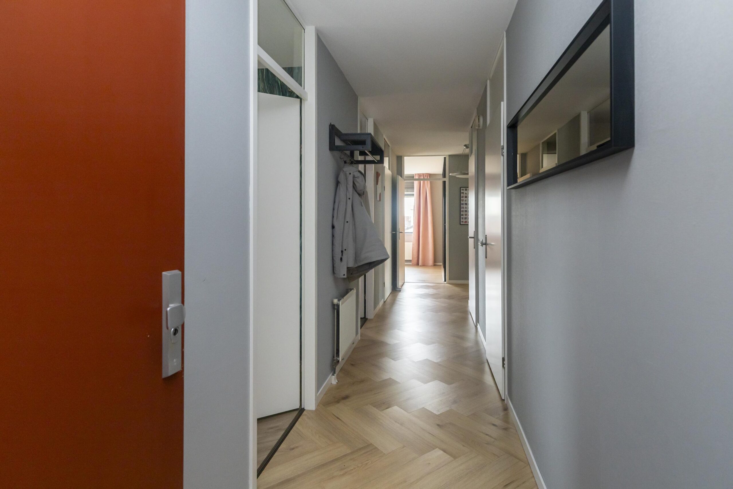 Bij binnenkomst in het complex stap je direct de ruime en goed verzorgde centrale hal binnen. Via de trap of lift bereik je het appartement, gelegen op de tweede verdieping. Bij binnenkomst in de woning kom je in een lange hal die toegang biedt tot vrijwel alle vertrekken.