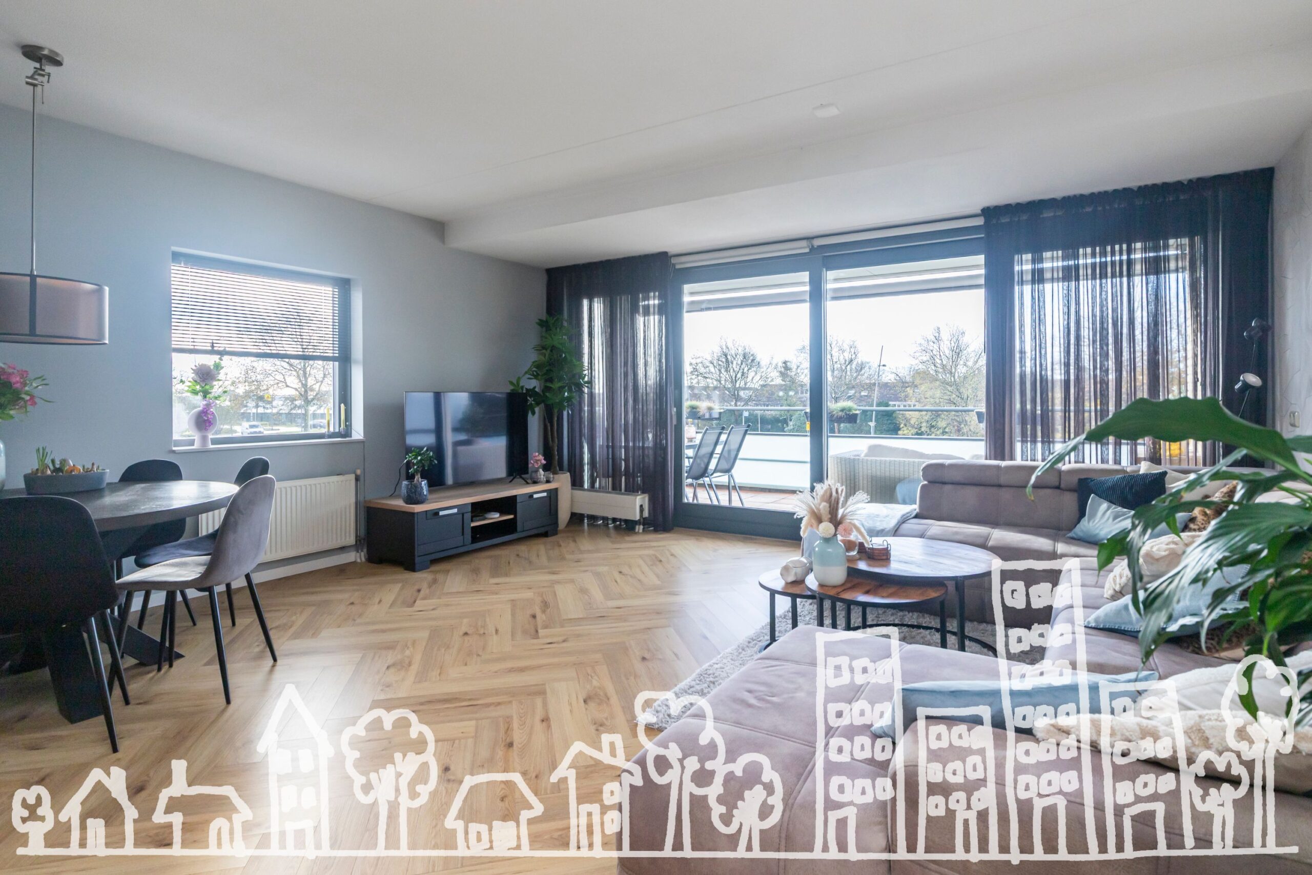Aan de voorzijde van de woning bevindt zich de grote, lichte woonkamer met open keuken. De keuken is uitgerust met een koel-vriescombinatie, combi-oven, inductiekookplaat en vaatwasser, en beschikt over voldoende opbergruimte. Dankzij de brede schuifpui in de woonkamer is er veel lichtinval en heb je direct toegang tot het royale terras van circa 17,5 m². Hier kun je heerlijk genieten van de zon en de buitenruimte.